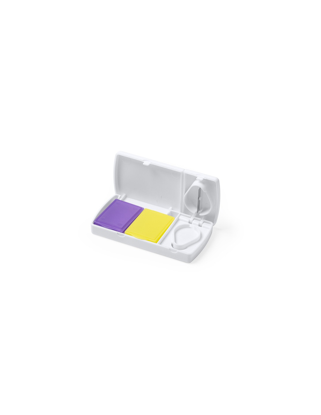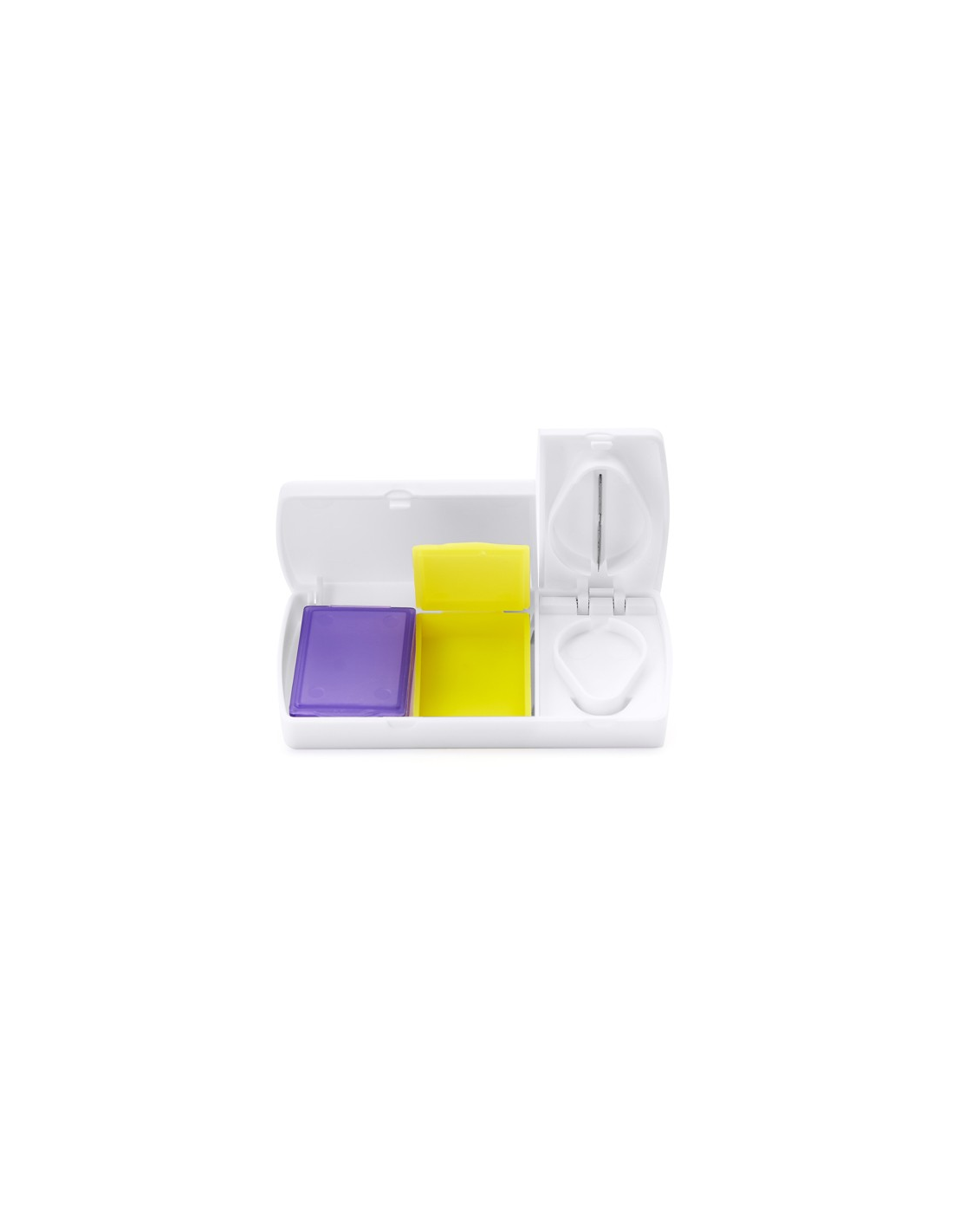 Dozownik do tabletek z dwiema sekcjami: jedna z dwoma małymi pudełkami w dwóch kolorach, a druga z obcinaczem do cięcia większych tabletek.