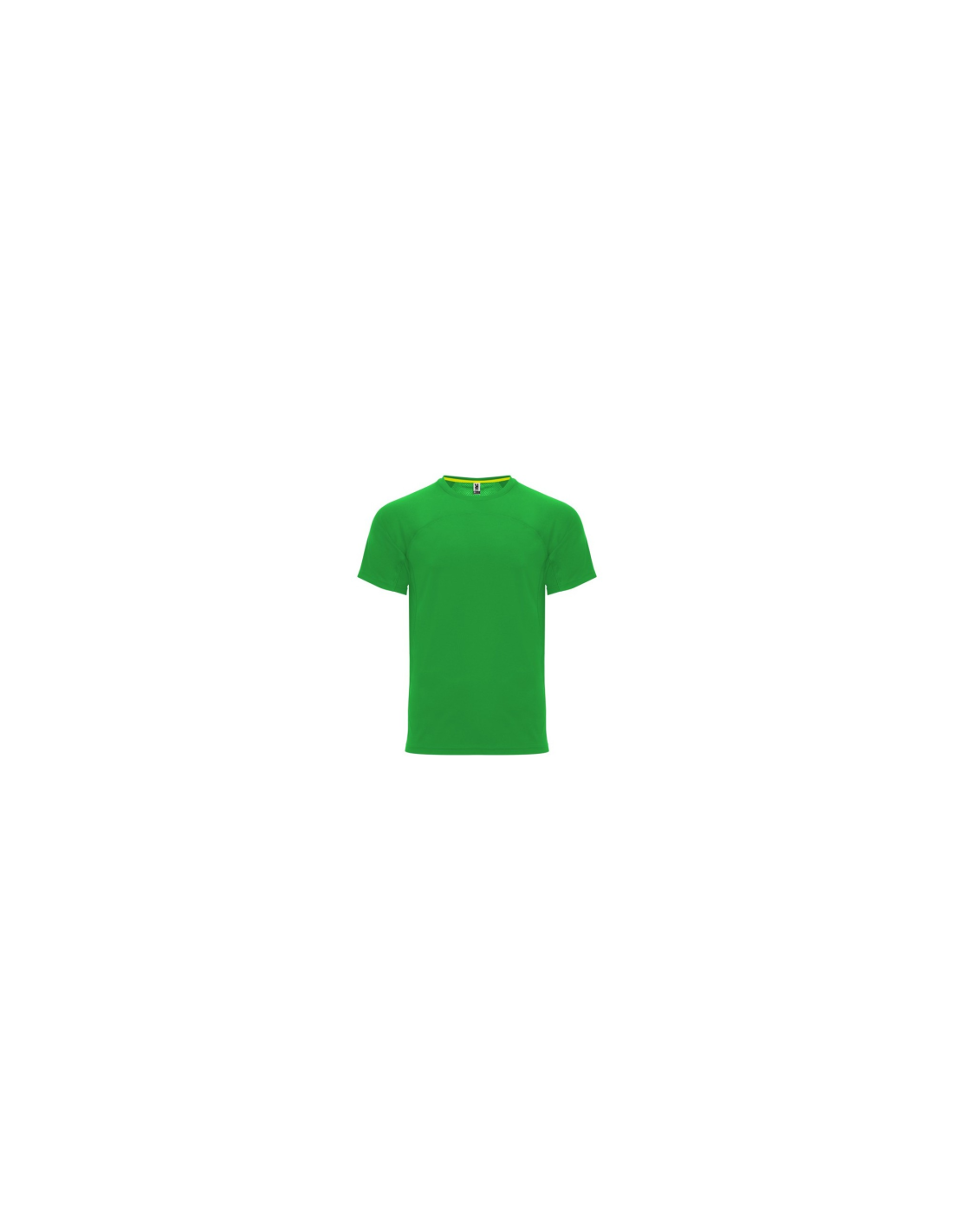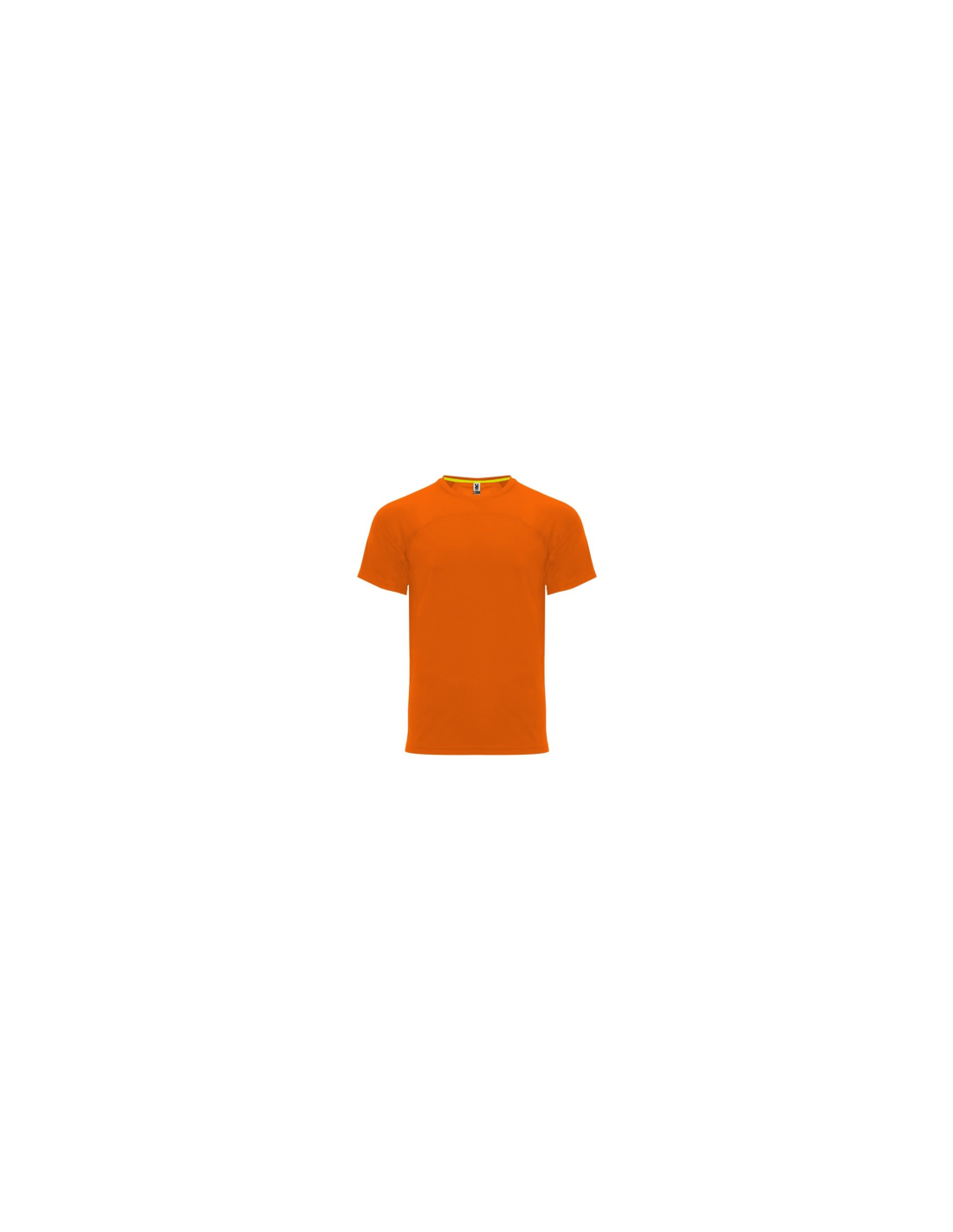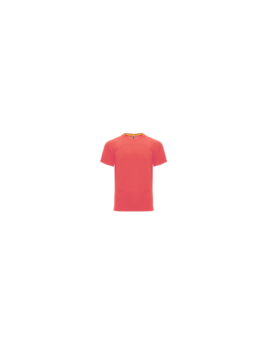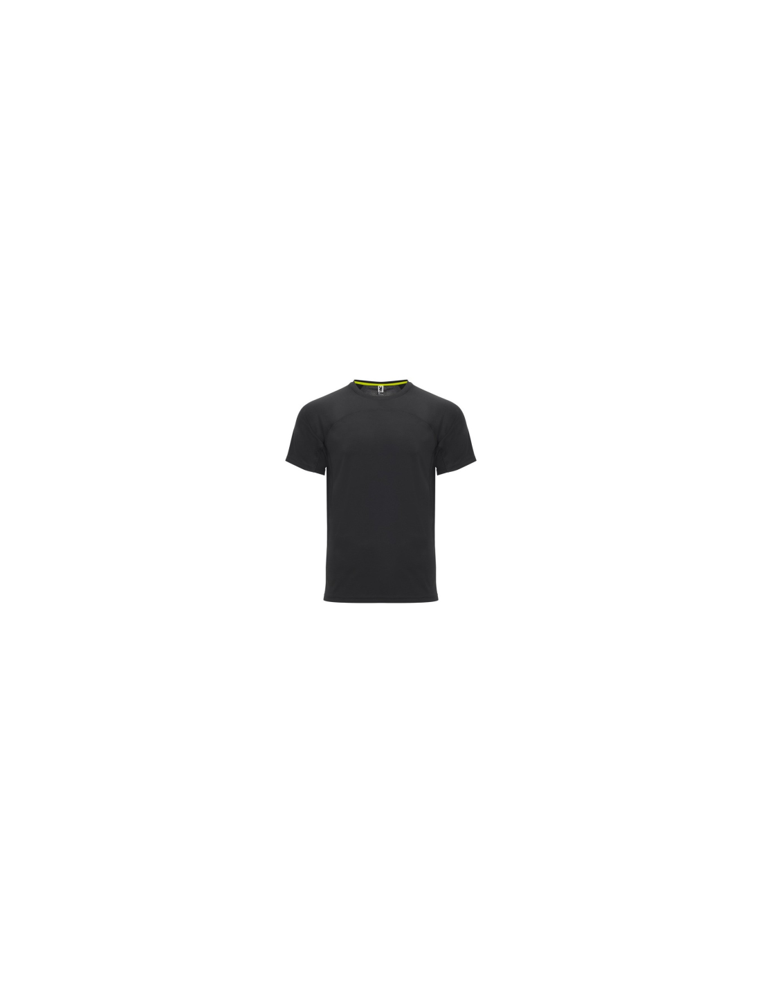 Koszulka techniczna unisex z krótkim rękawem. 1. Okrągły kołnierzyk z wzmocnionymi, krytymi szwami na karczku w kolorze żółtym fluorescencyjnym. 2. Połączenie dwóch materiałów polistrowych na plecach.