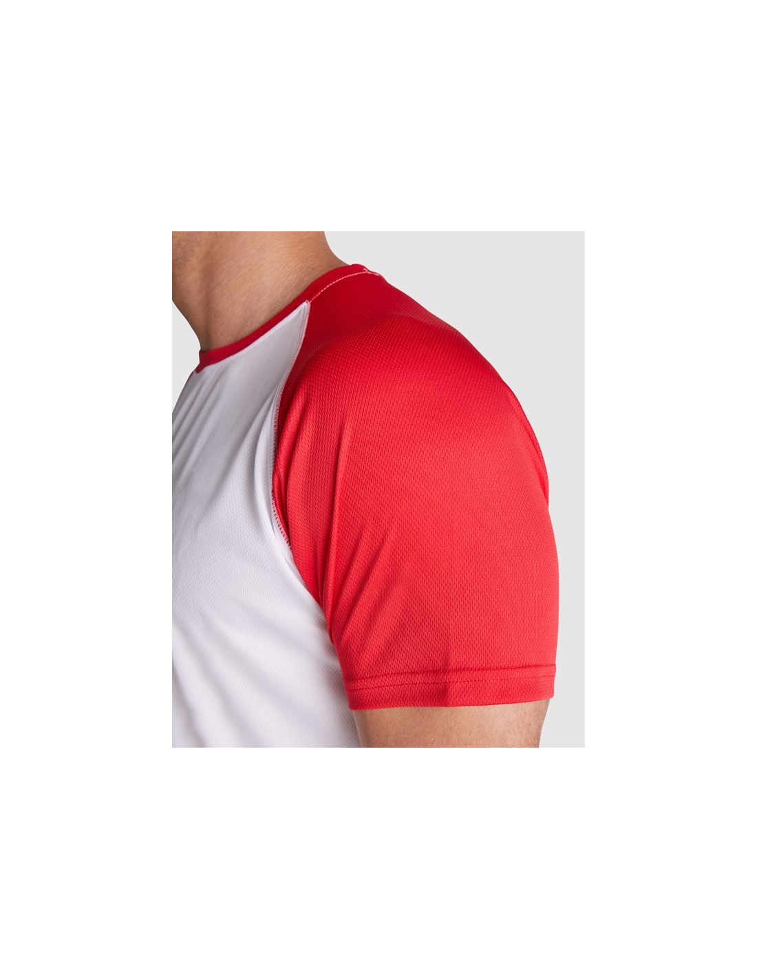 Koszulka sportowa z krótkim raglanowym rękawem. Rękawy w kontrastowym kolorze. Okrągły dekolt w kontrastowym kolorze ze wzmocnionymi krytymi szwami.