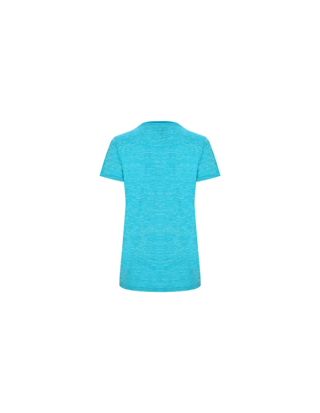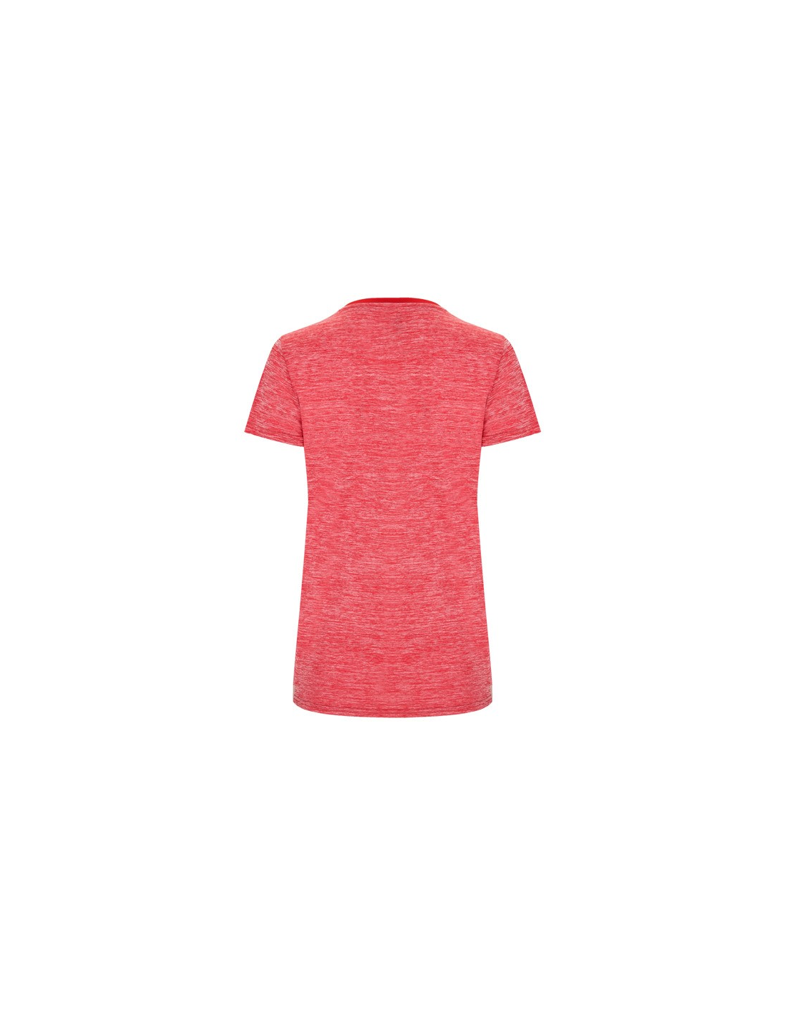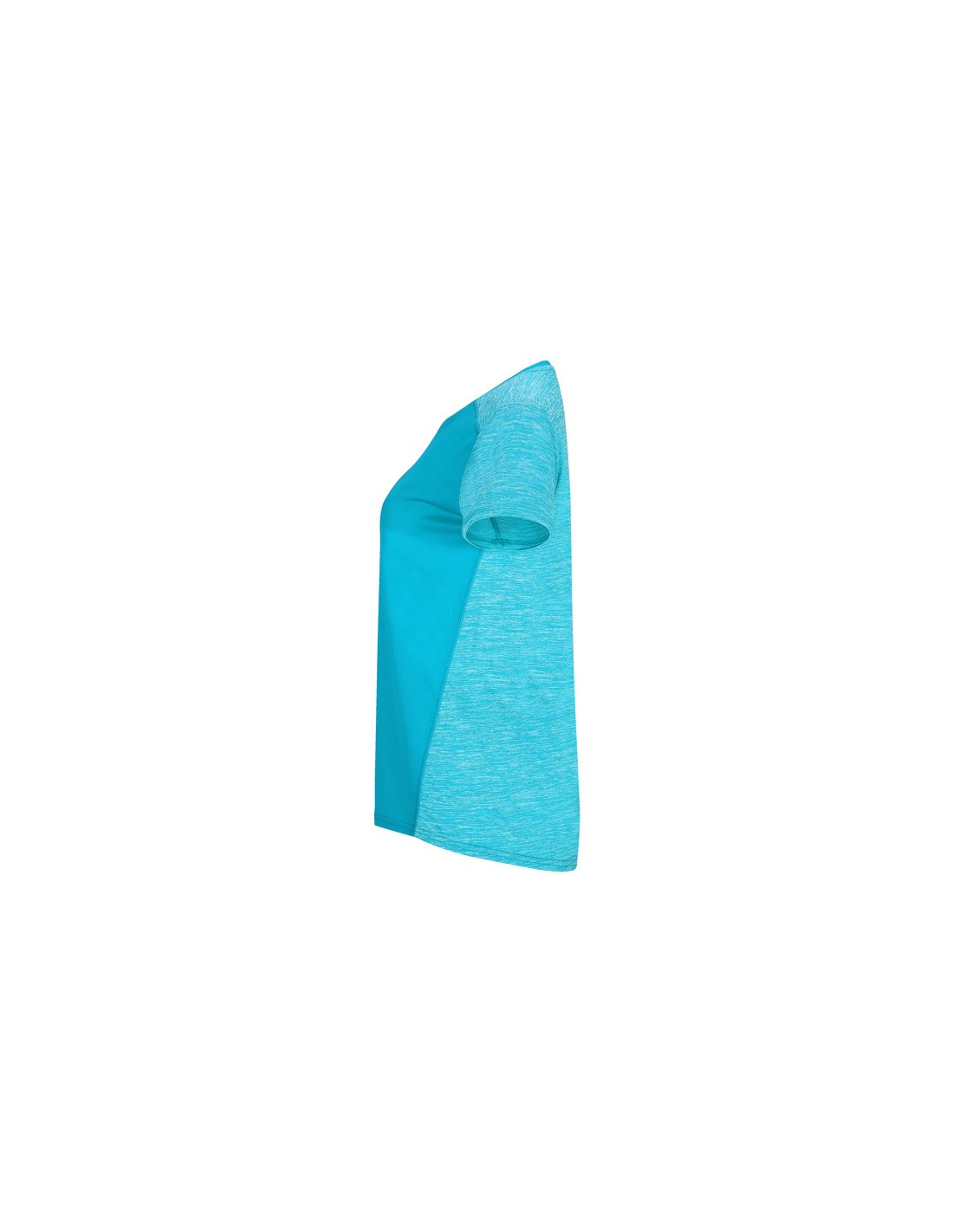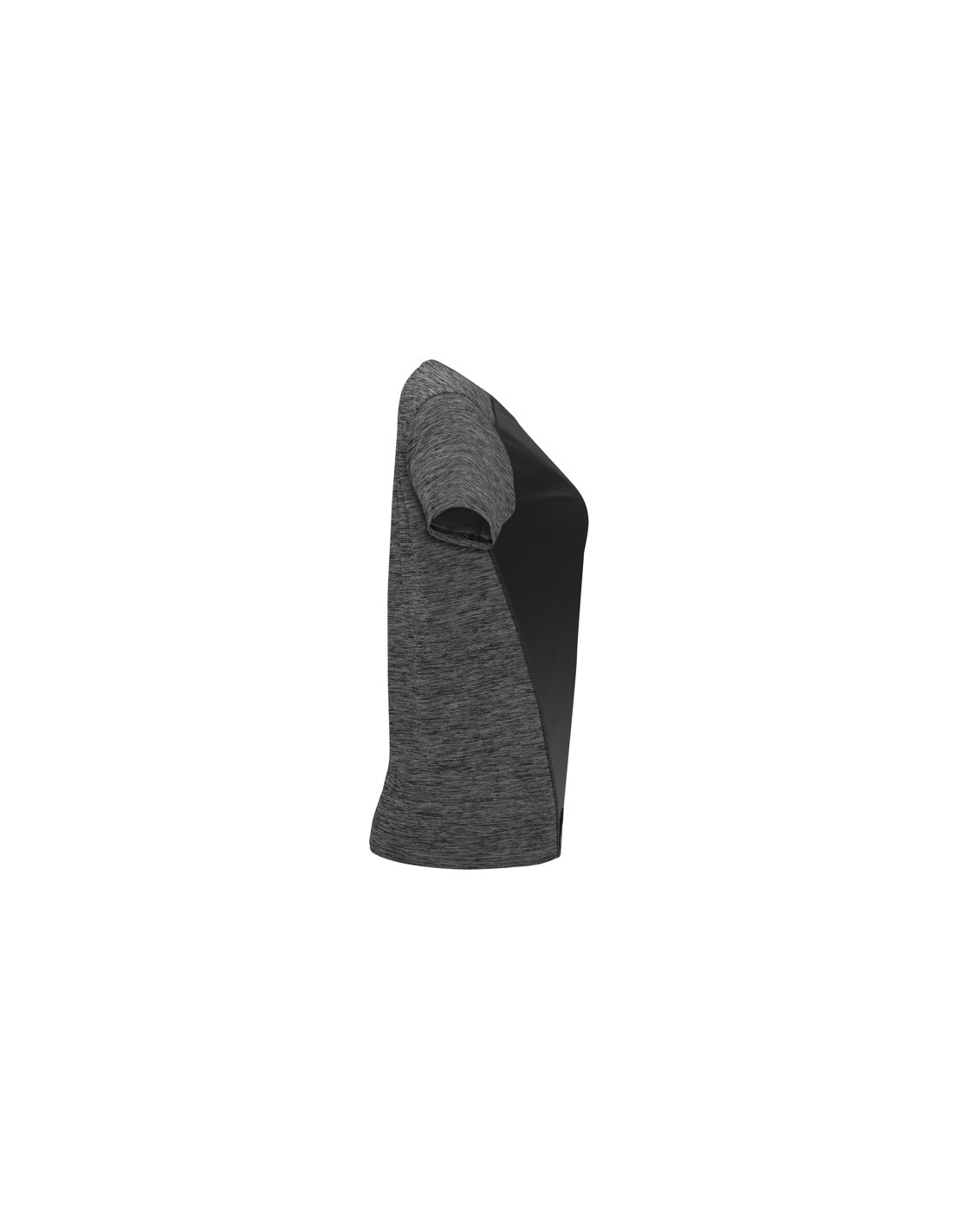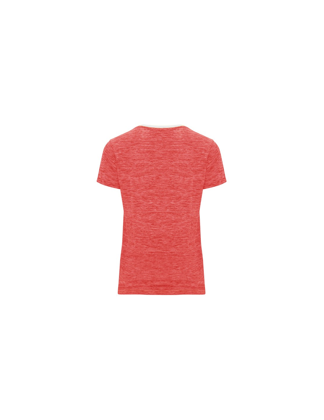 Koszulka techniczna z krótkim rękawem dla kobiet. 1. Okrągły dekolt. 2. Połączenie dwóch materiałów poliestrowych. 3. Główna tkanina o strukturze bird´s eye, tylna część wykonana z Space Dye. 4. Delikatnie wydłużony tył.