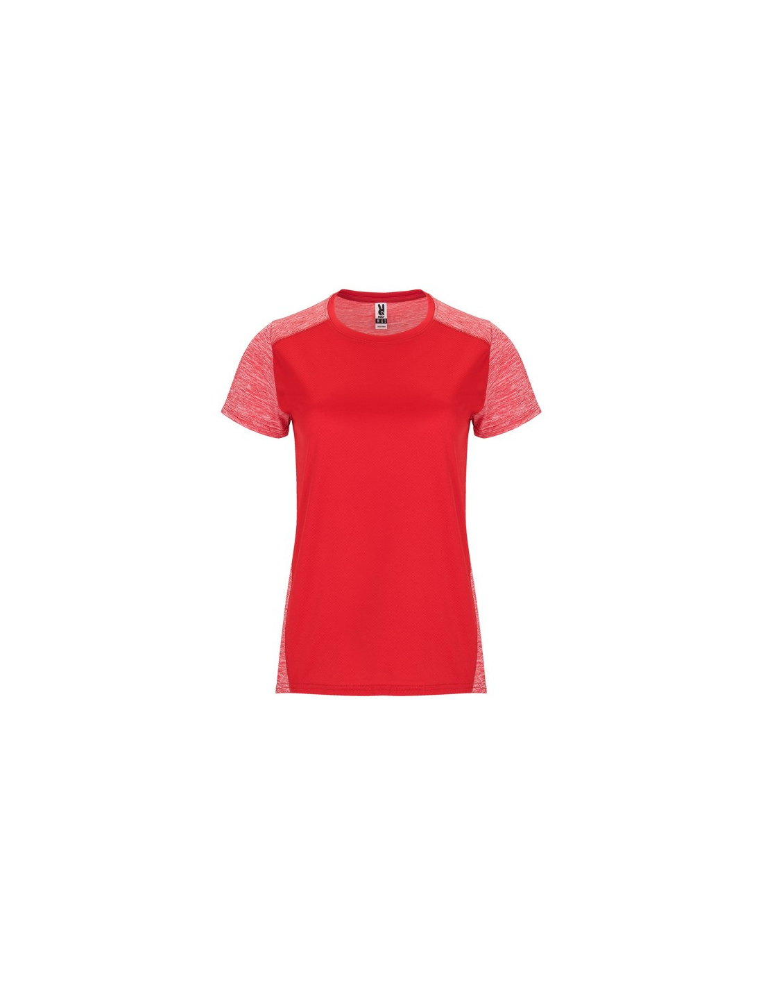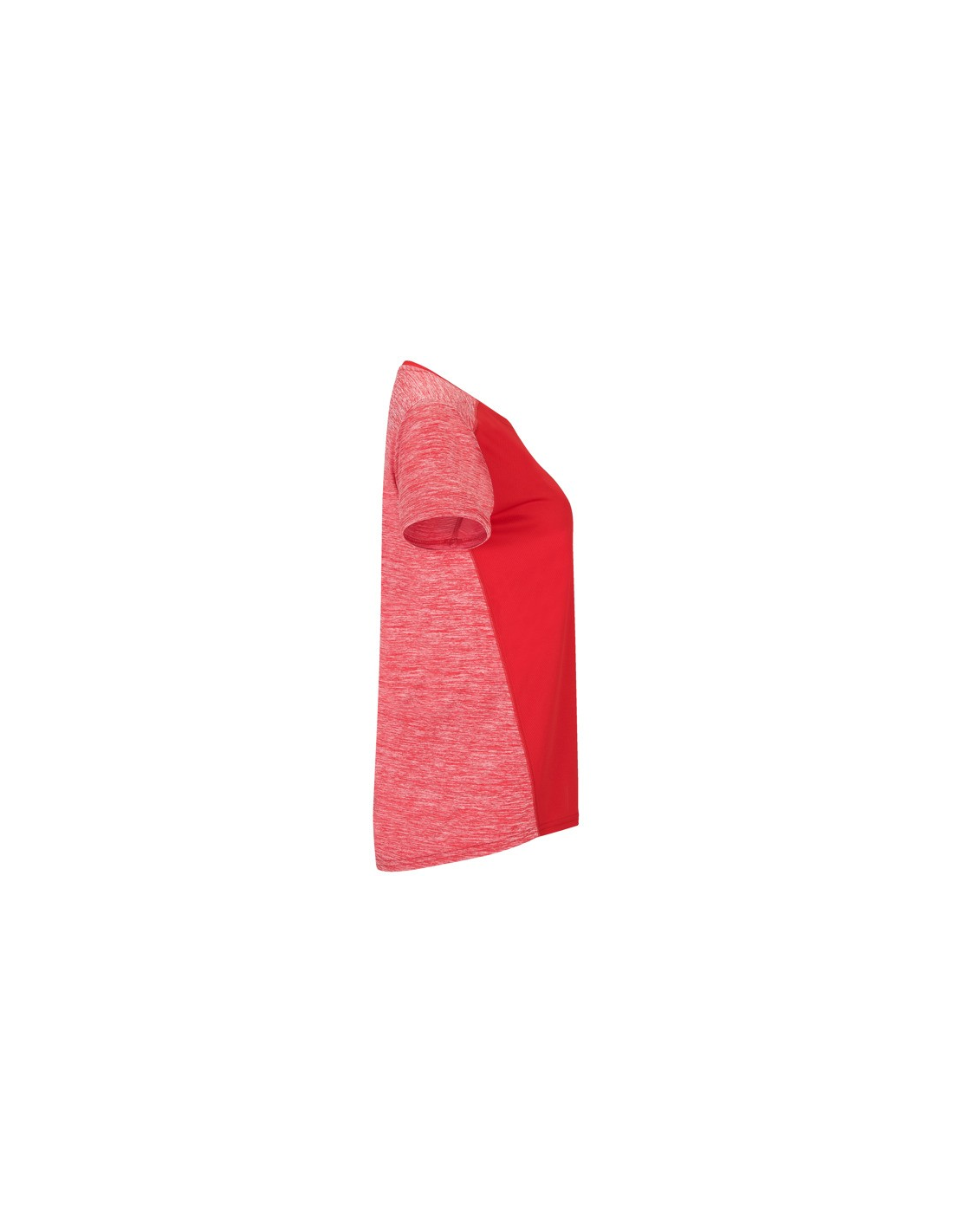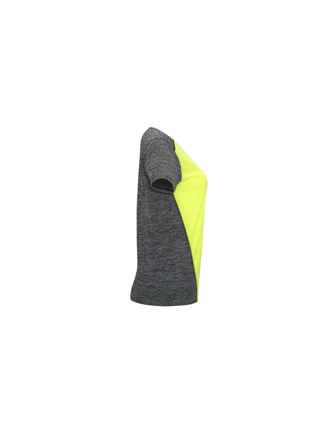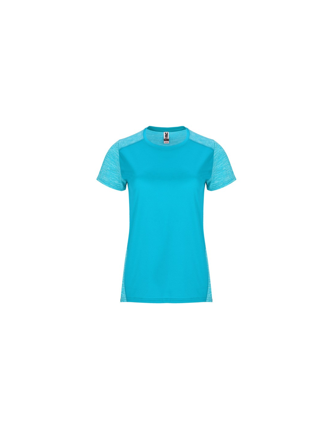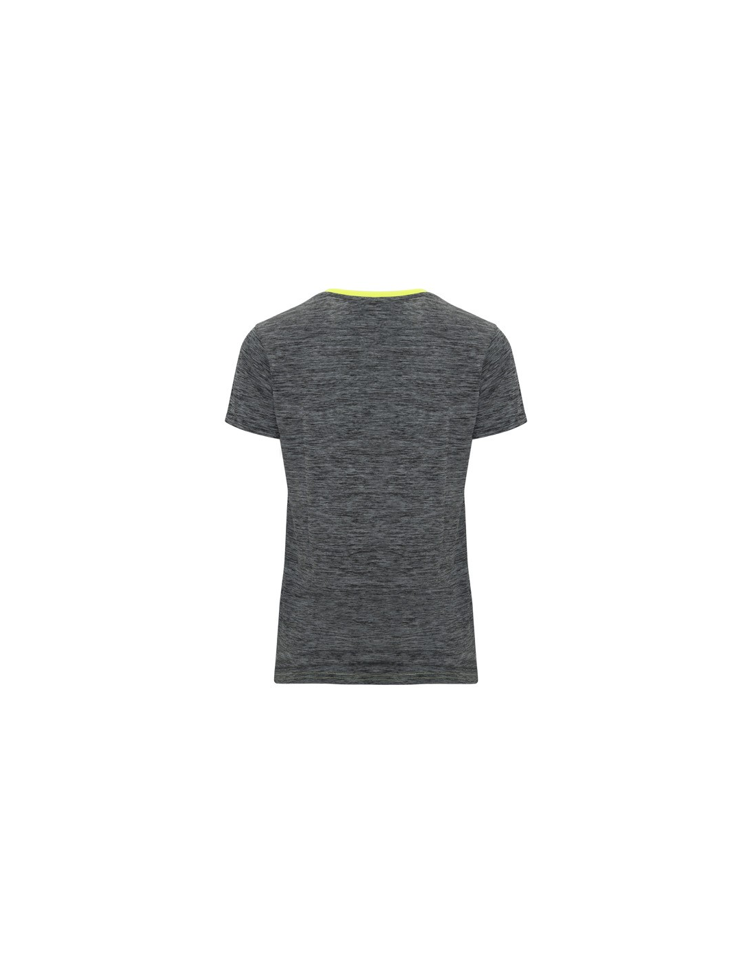Koszulka techniczna z krótkim rękawem dla kobiet. 1. Okrągły dekolt. 2. Połączenie dwóch materiałów poliestrowych. 3. Główna tkanina o strukturze bird´s eye, tylna część wykonana z Space Dye. 4. Delikatnie wydłużony tył.
