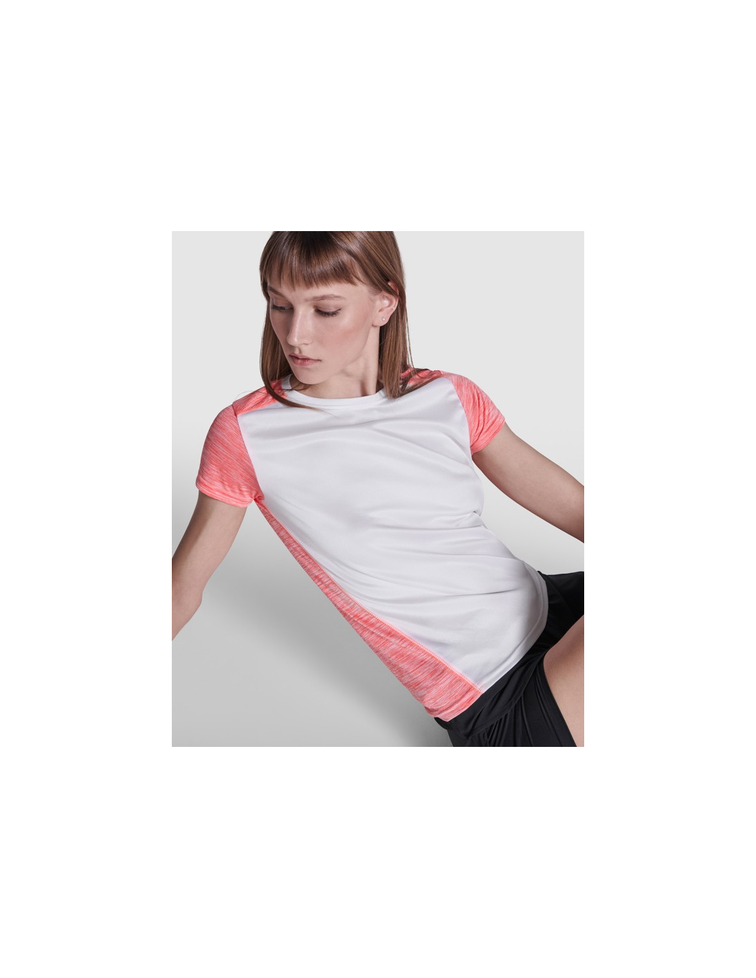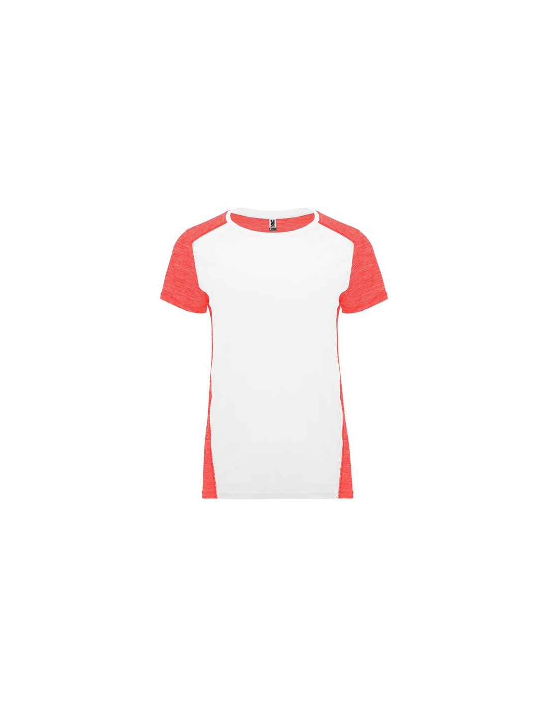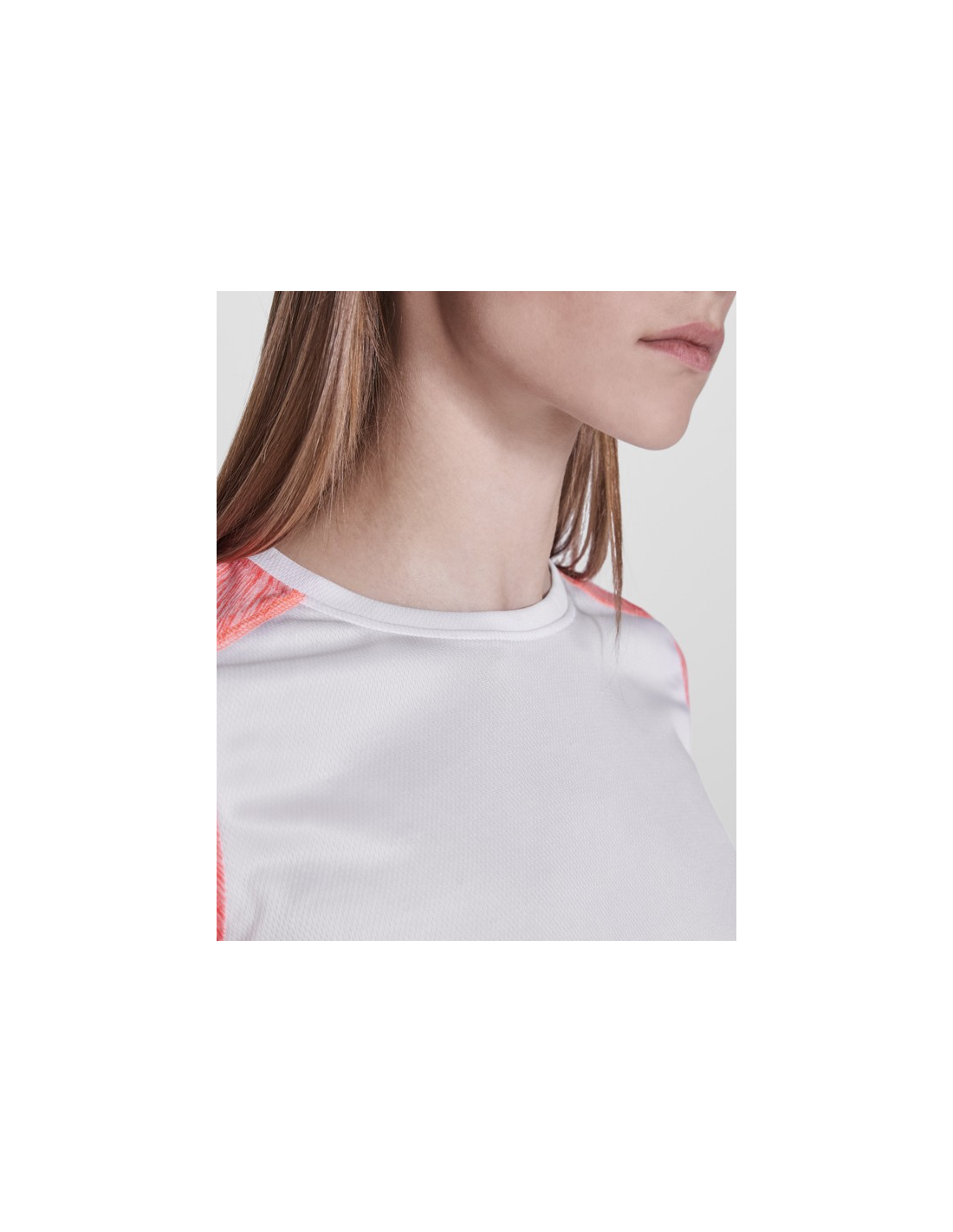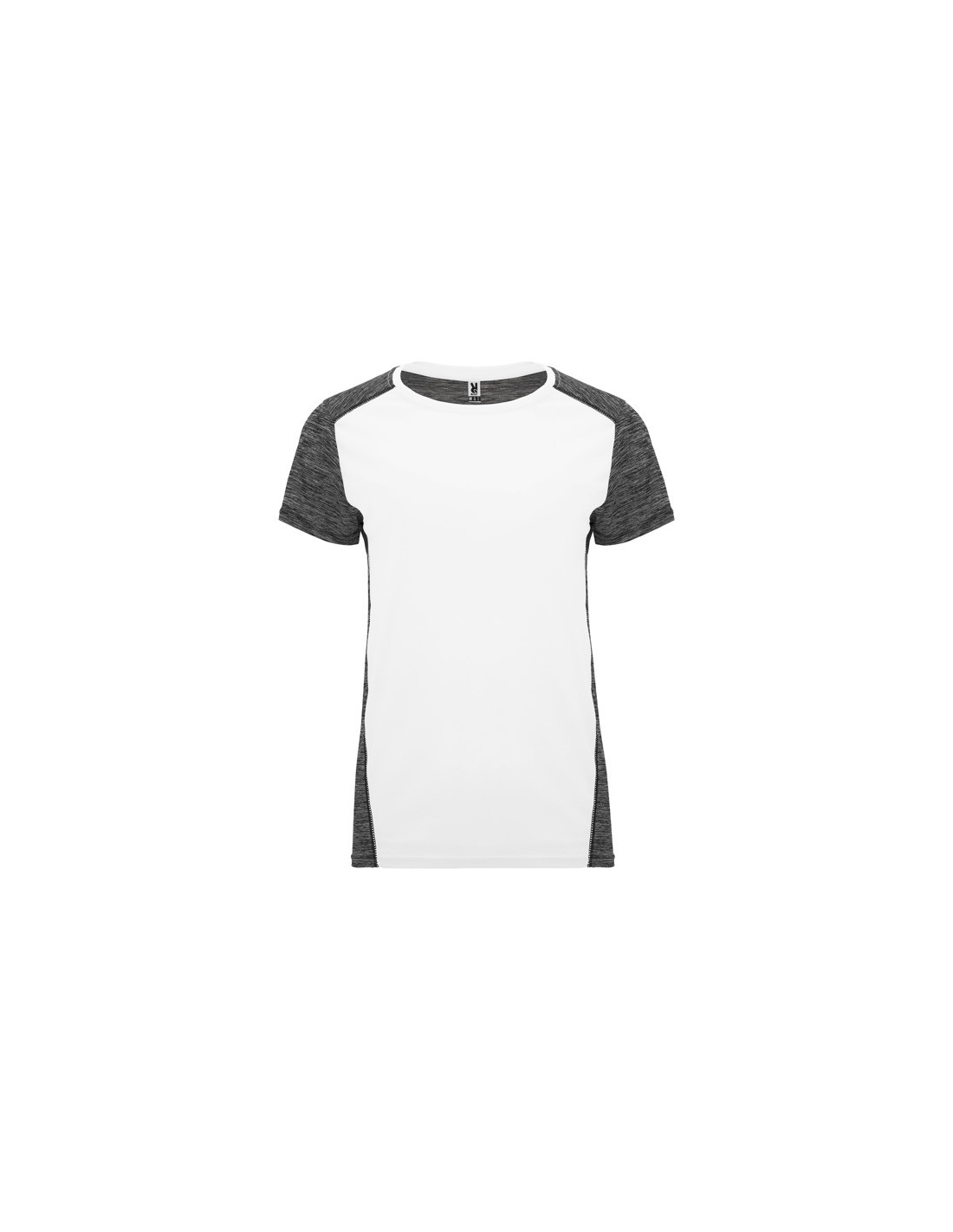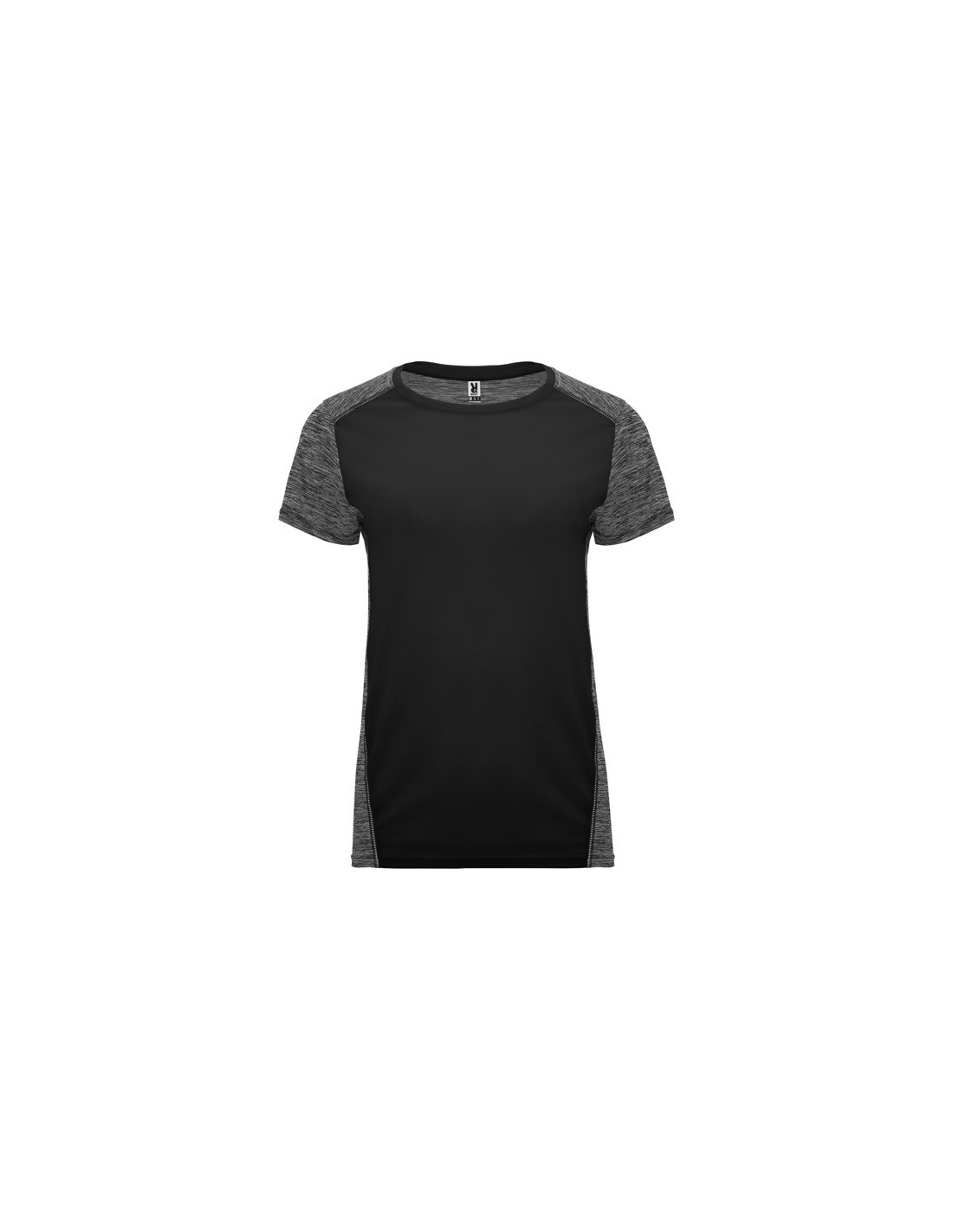 Koszulka techniczna z krótkim rękawem dla kobiet. 1. Okrągły dekolt. 2. Połączenie dwóch materiałów poliestrowych. 3. Główna tkanina o strukturze bird´s eye, tylna część wykonana z Space Dye. 4. Delikatnie wydłużony tył.