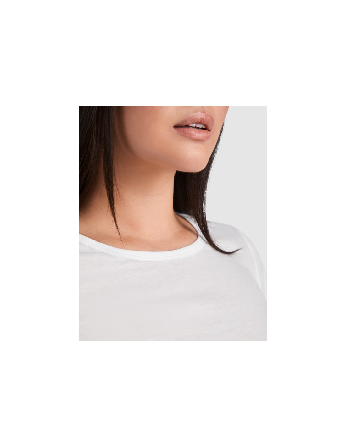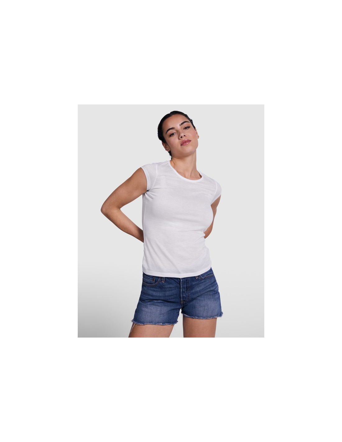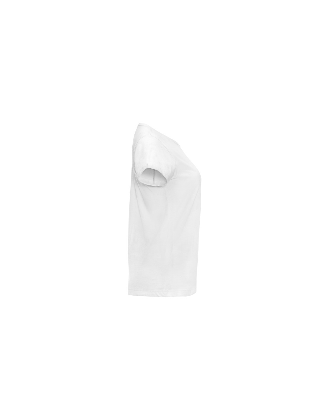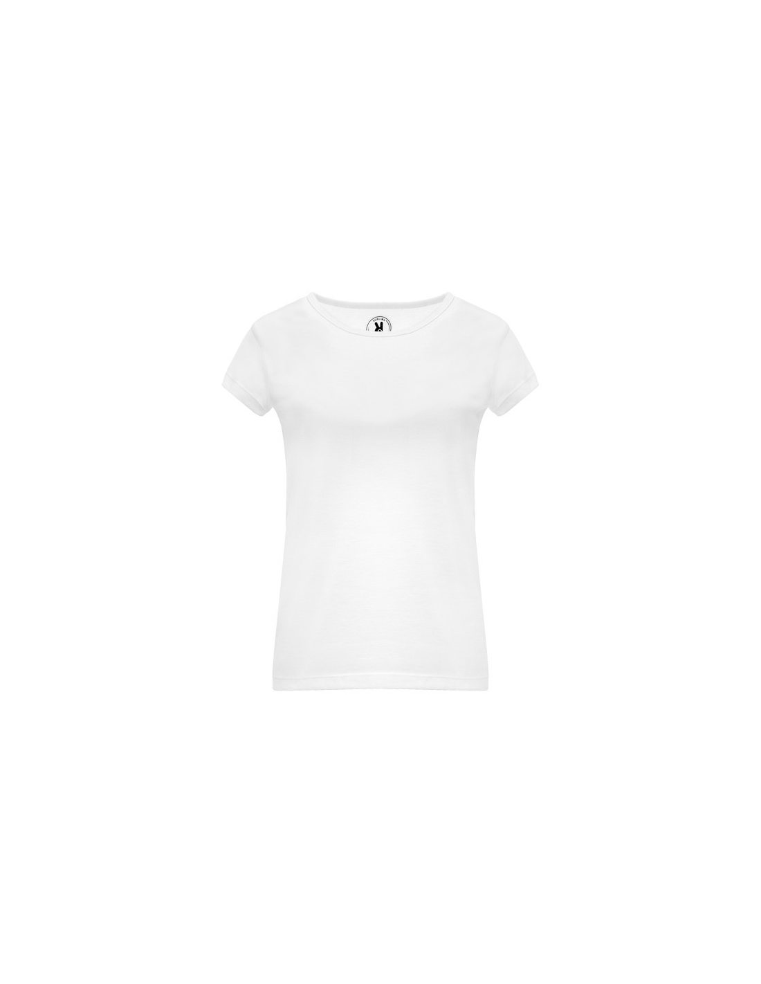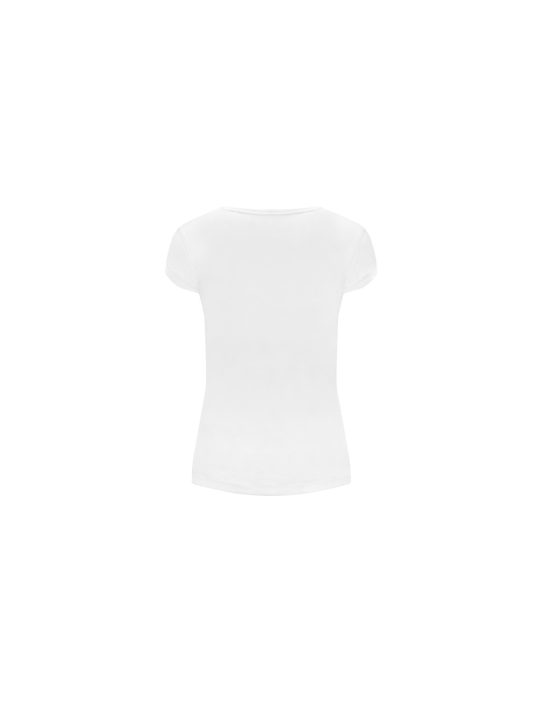Koszulka z krótkim rękawem i dopasowanym krojem. Okrągły dekolt, z tej samej tkaniny, boczne szwy. Wykonana z tkaniny poliestrowej przypominającej w dotyku bawełnę.