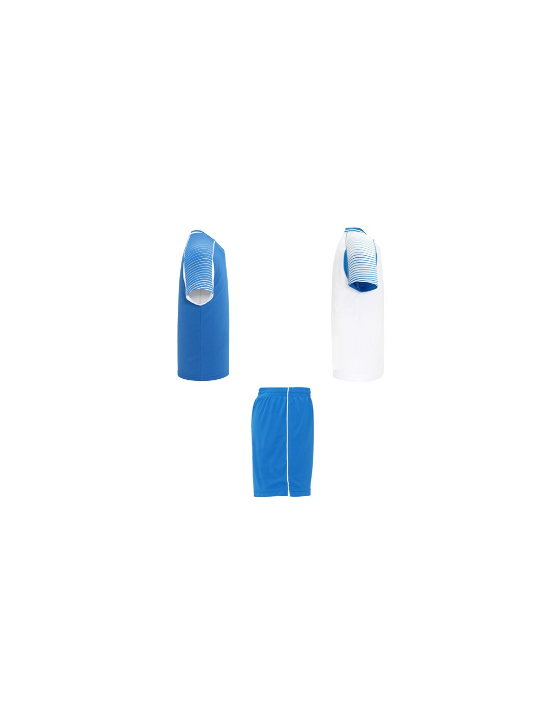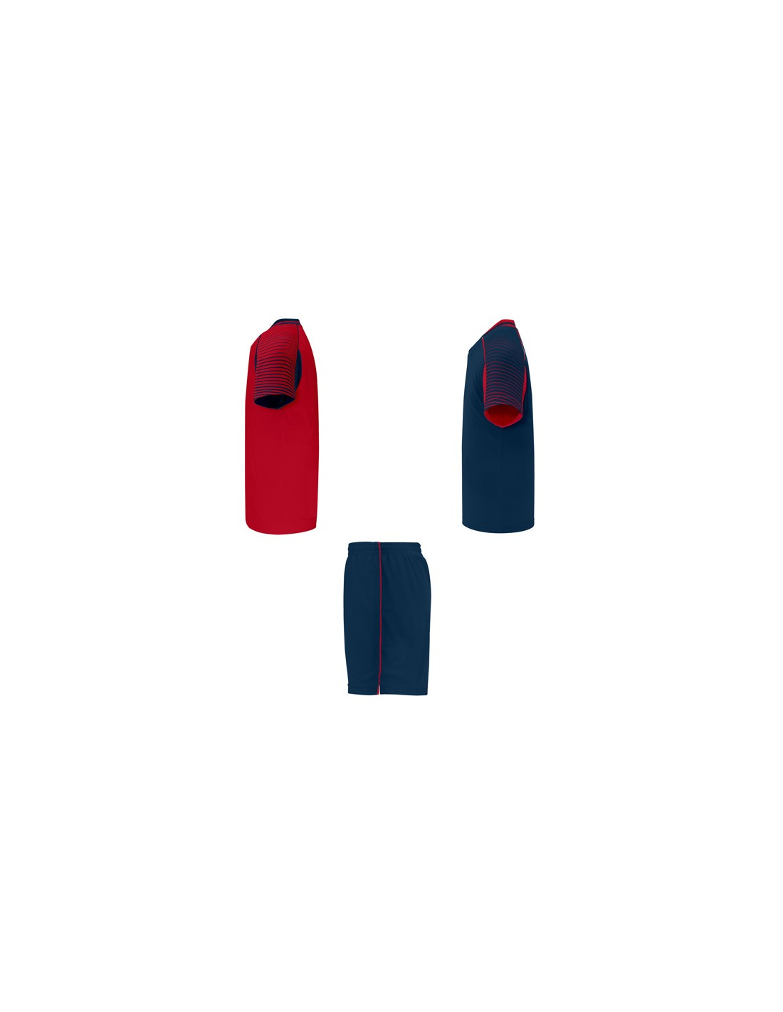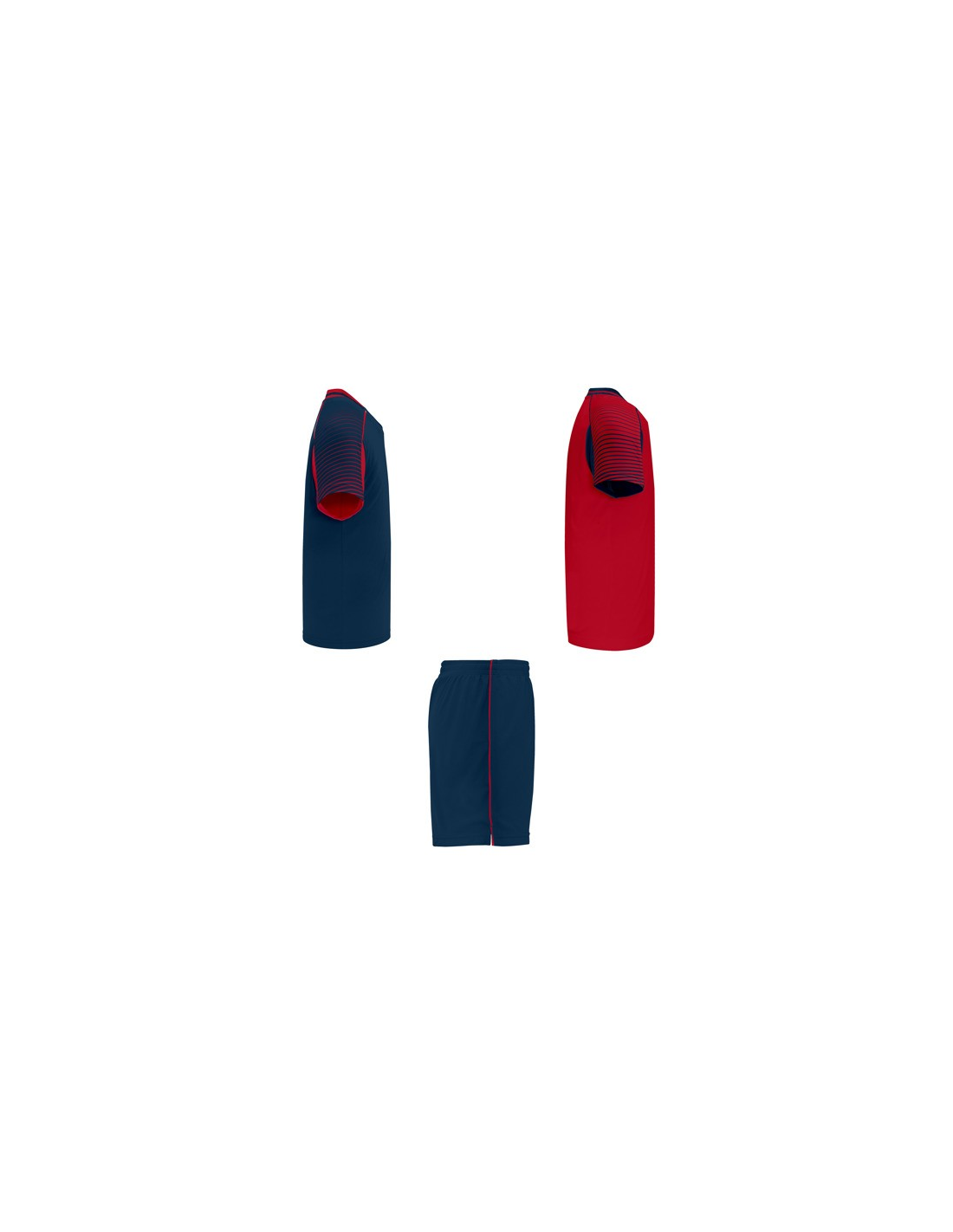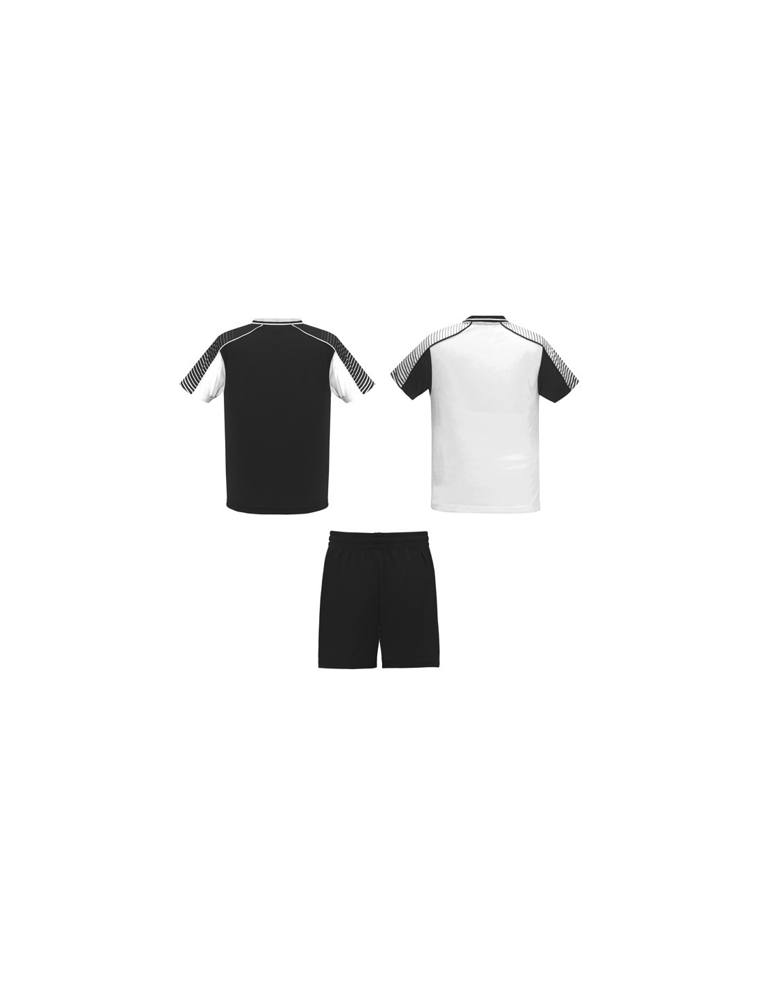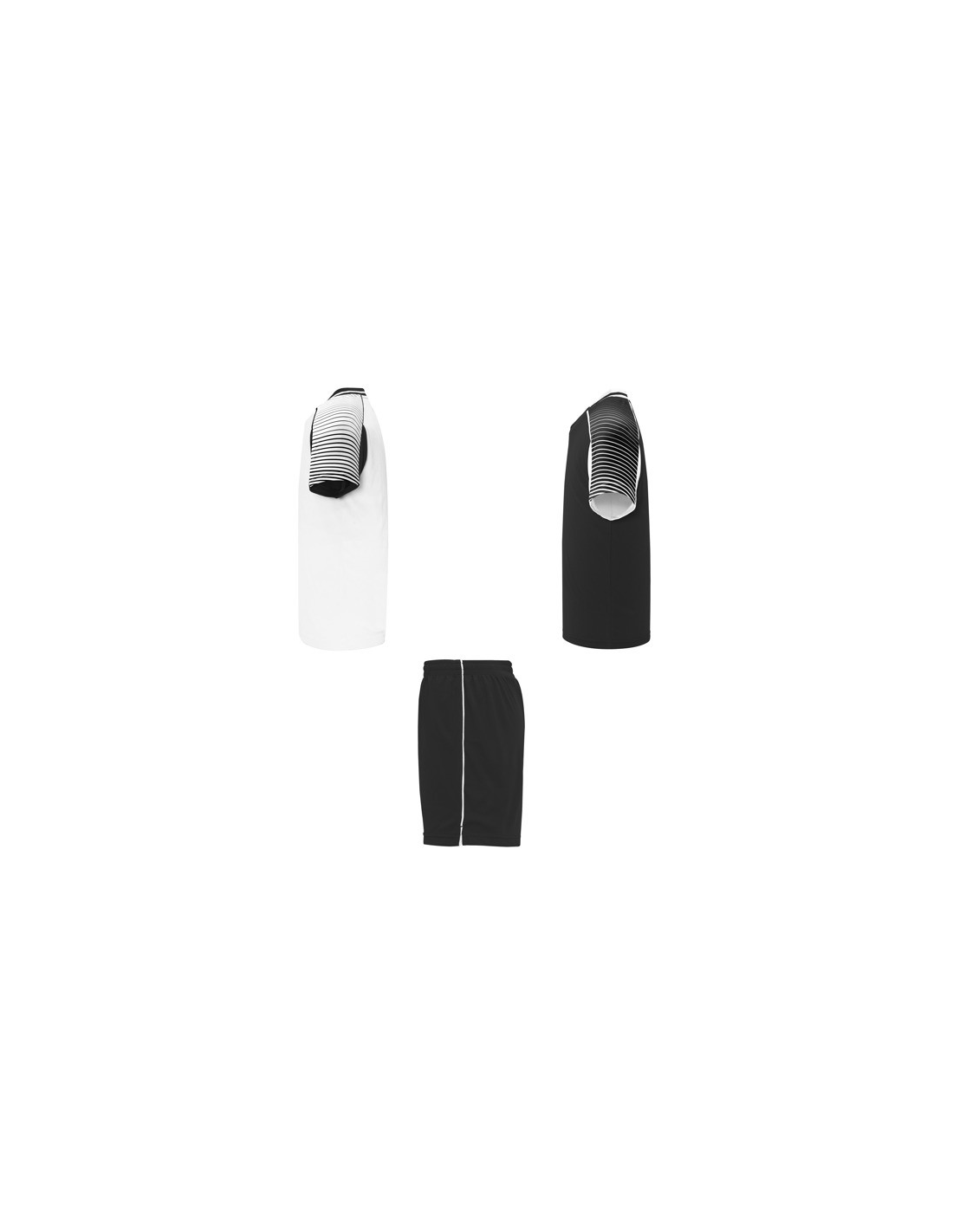 Męski komplet sportowy składający się z 2 koszulek + 1 spodni. 1. Koszulka z pół raglanowymi rękawami, zdobionymi paskami. 2. Okrągły dekolt. 3. Kolor drugiej koszulki występuje w odwróconych kolorach. 4. Elastyczne spodnie w pasie z wewnętrznym sznurkiem w tym samym kolrze ze szwami zabezpieczającymi. 5. Kontrastujące boczne paski oraz przecięcia w nogawce.