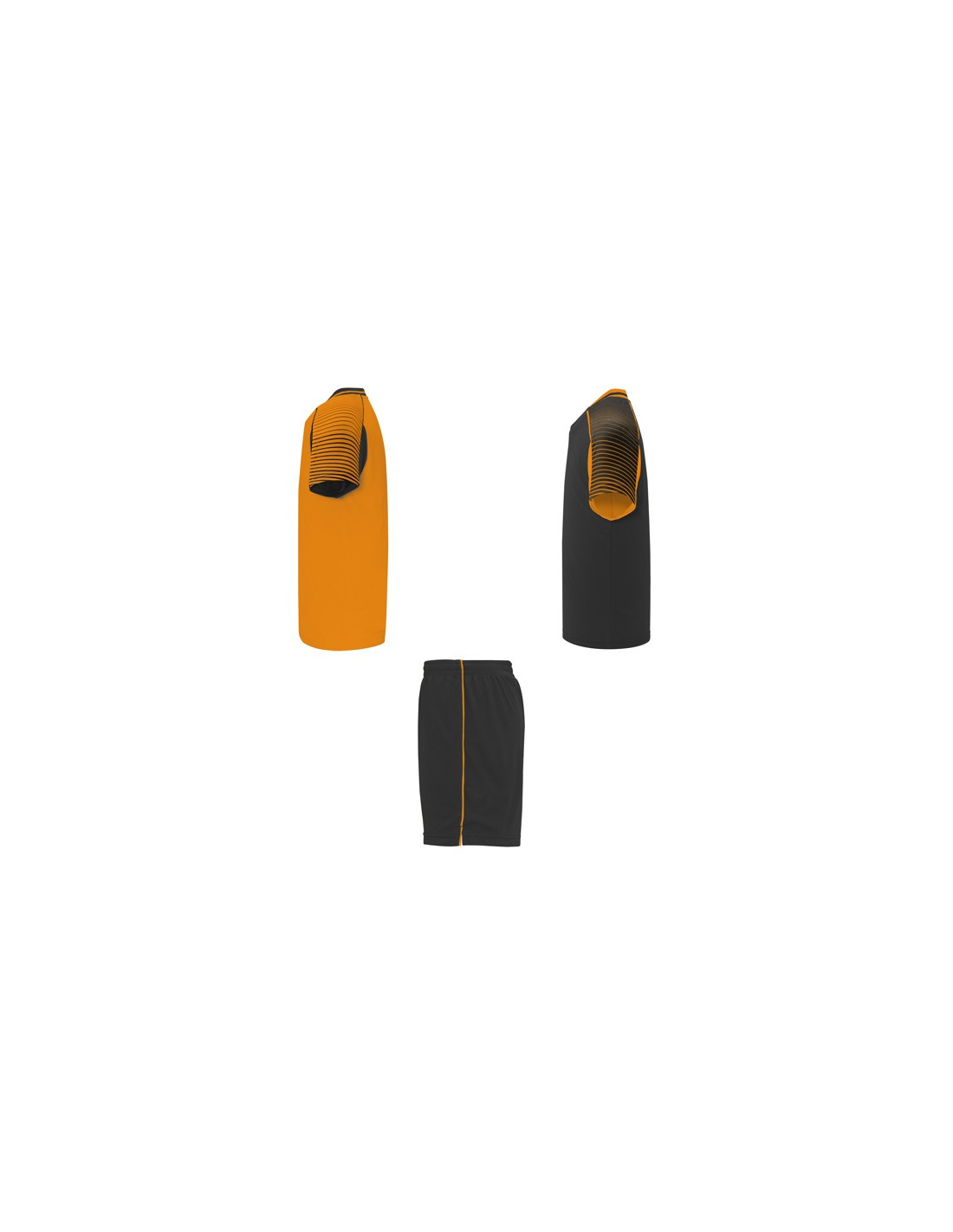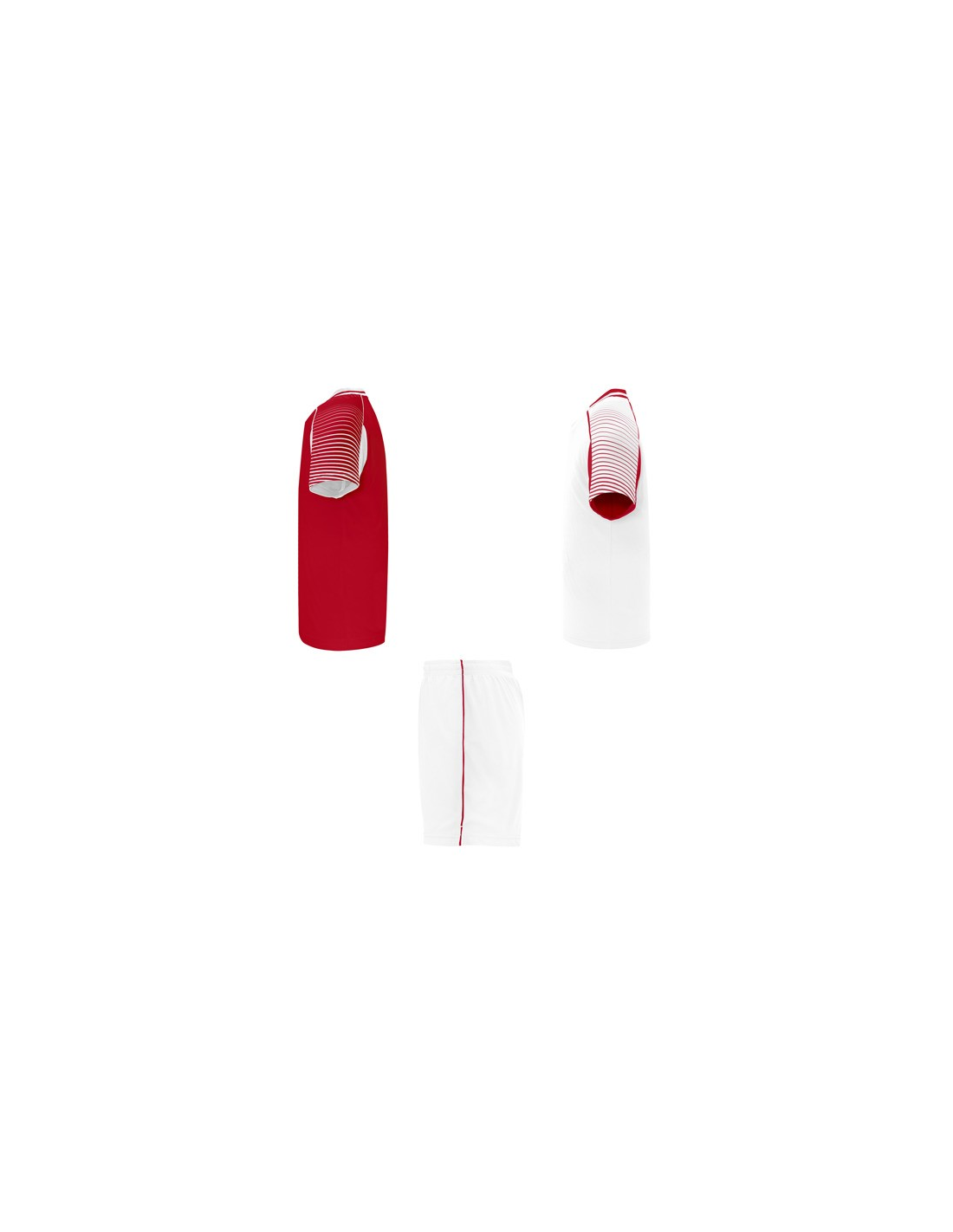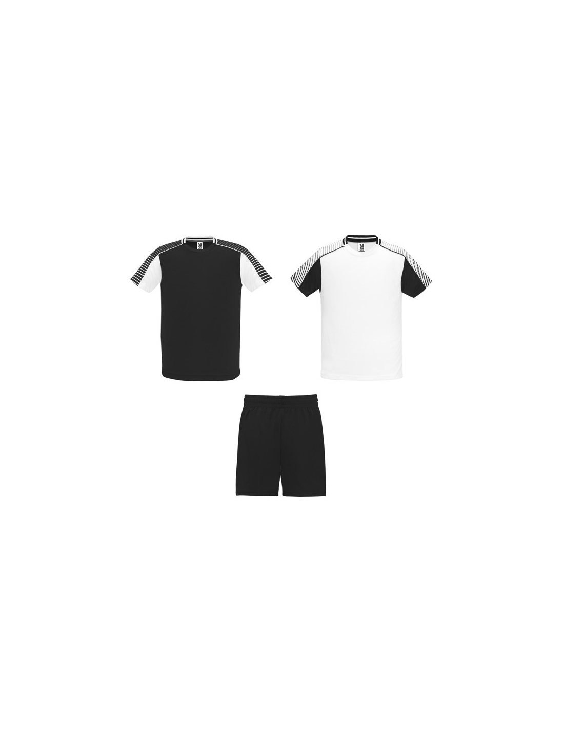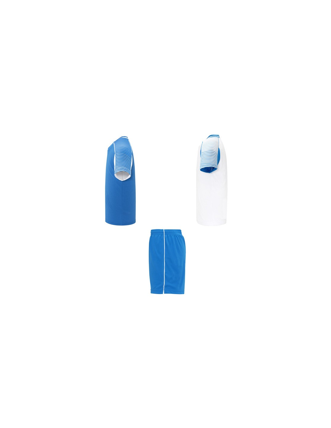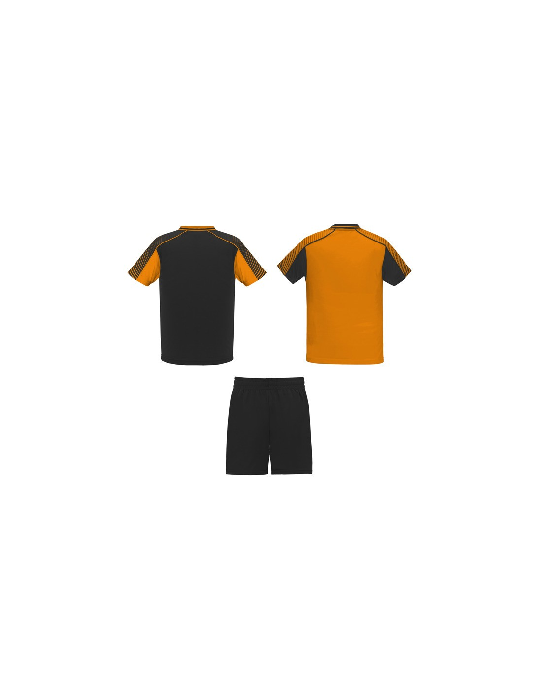 Męski komplet sportowy składający się z 2 koszulek + 1 spodni. 1. Koszulka z pół raglanowymi rękawami, zdobionymi paskami. 2. Okrągły dekolt. 3. Kolor drugiej koszulki występuje w odwróconych kolorach. 4. Elastyczne spodnie w pasie z wewnętrznym sznurkiem w tym samym kolrze ze szwami zabezpieczającymi. 5. Kontrastujące boczne paski oraz przecięcia w nogawce.