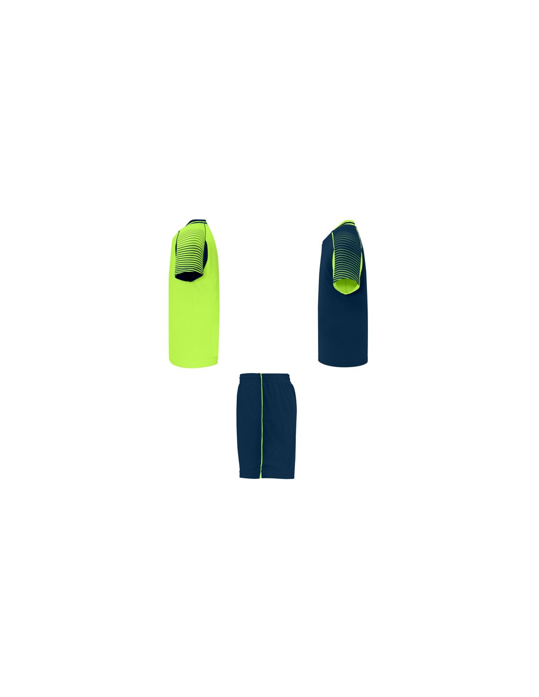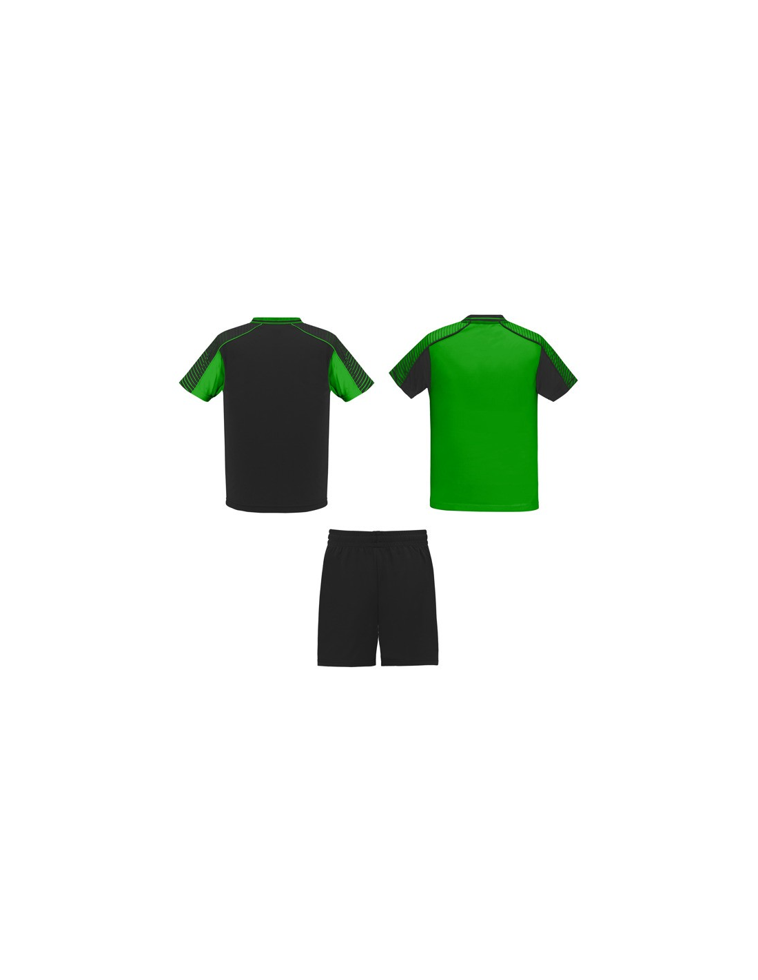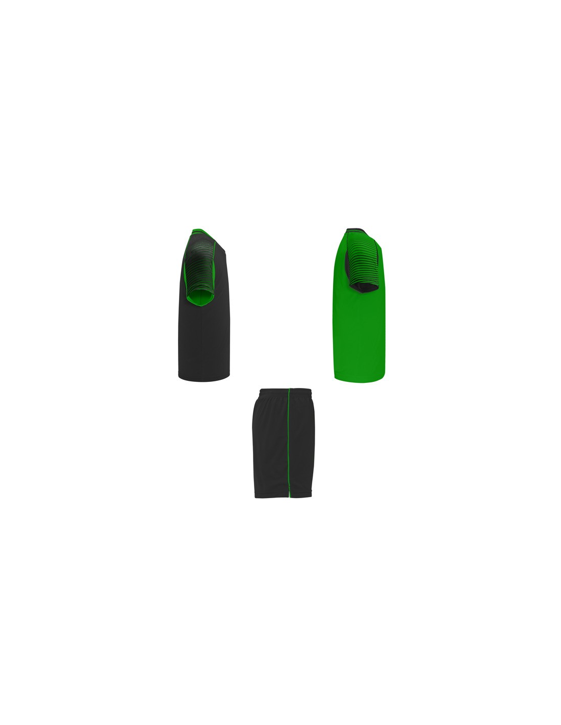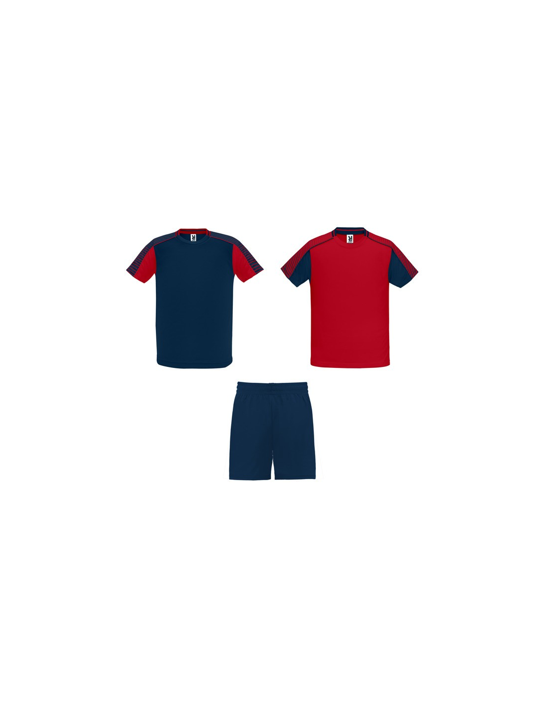 Męski komplet sportowy składający się z 2 koszulek + 1 spodni. 1. Koszulka z pół raglanowymi rękawami, zdobionymi paskami. 2. Okrągły dekolt. 3. Kolor drugiej koszulki występuje w odwróconych kolorach. 4. Elastyczne spodnie w pasie z wewnętrznym sznurkiem w tym samym kolrze ze szwami zabezpieczającymi. 5. Kontrastujące boczne paski oraz przecięcia w nogawce.