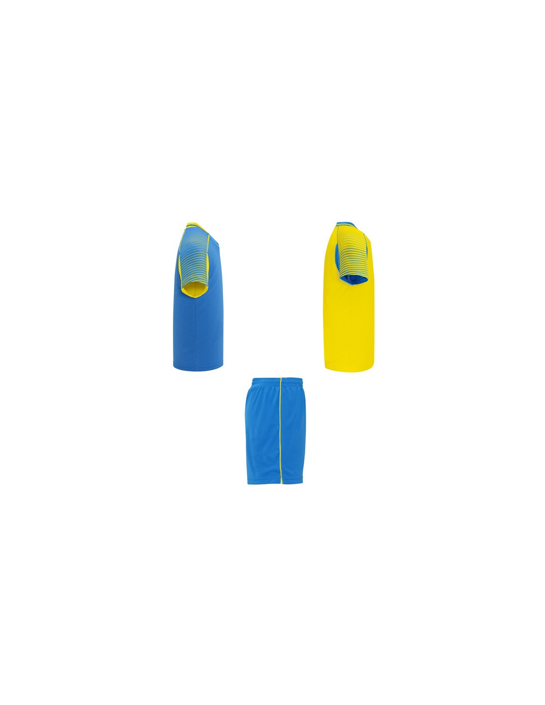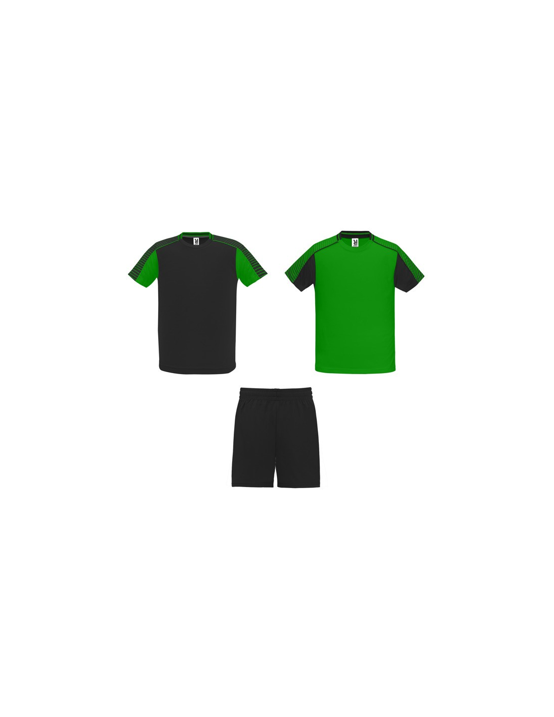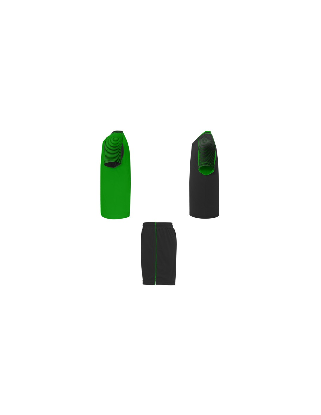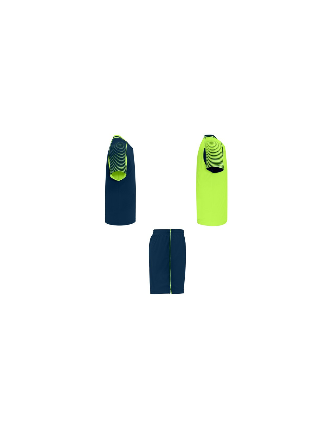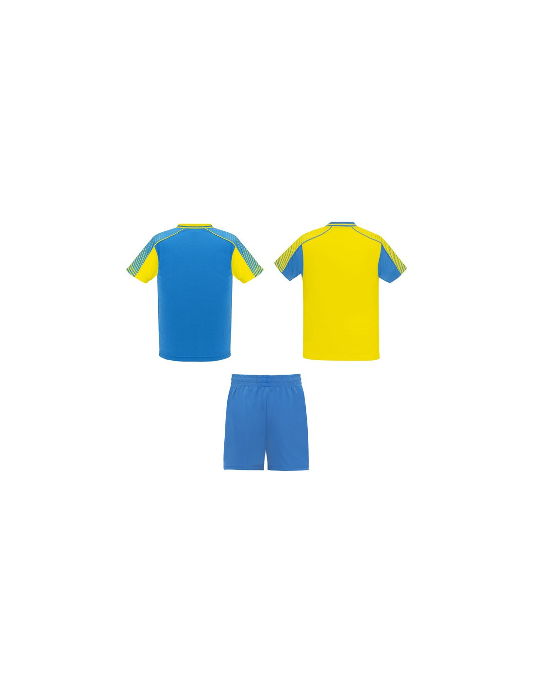 Męski komplet sportowy składający się z 2 koszulek + 1 spodni. 1. Koszulka z pół raglanowymi rękawami, zdobionymi paskami. 2. Okrągły dekolt. 3. Kolor drugiej koszulki występuje w odwróconych kolorach. 4. Elastyczne spodnie w pasie z wewnętrznym sznurkiem w tym samym kolrze ze szwami zabezpieczającymi. 5. Kontrastujące boczne paski oraz przecięcia w nogawce.