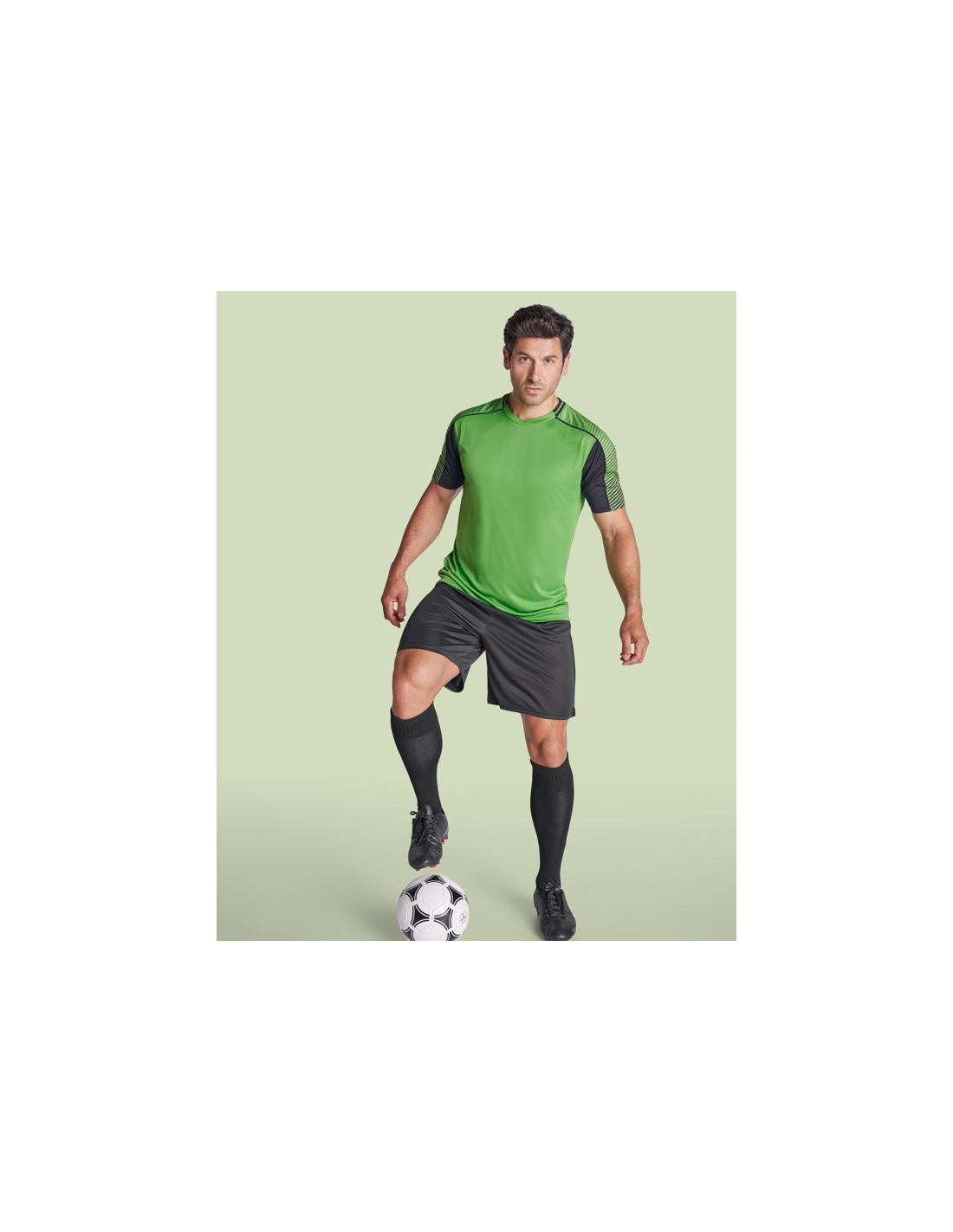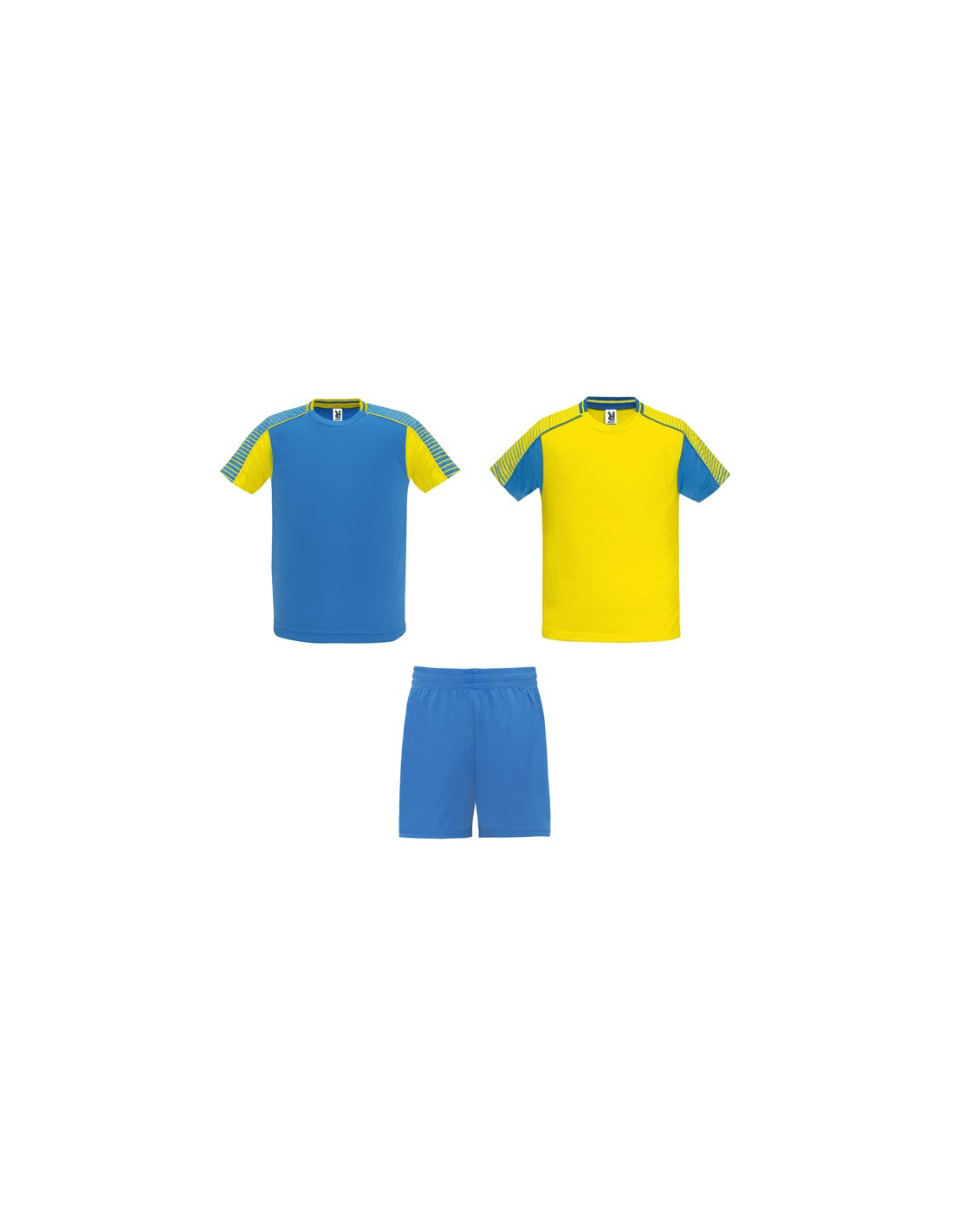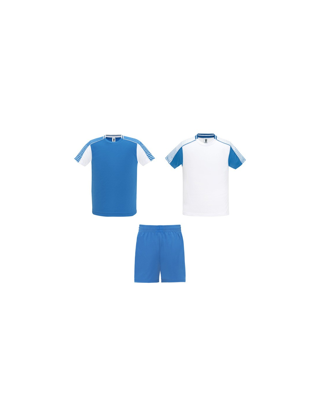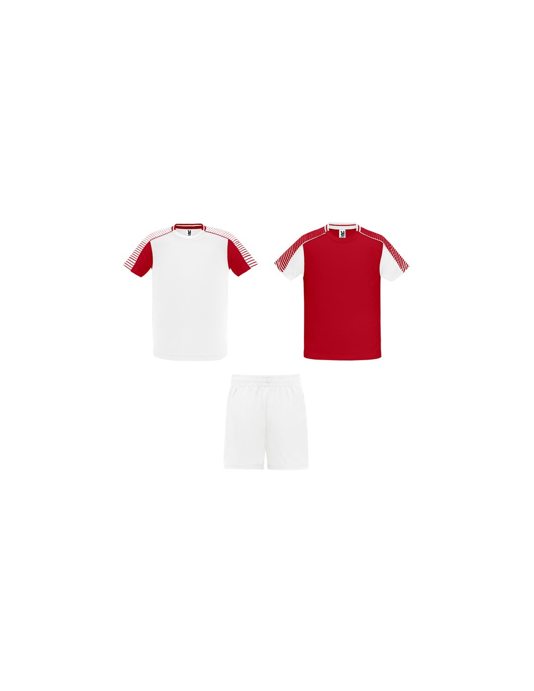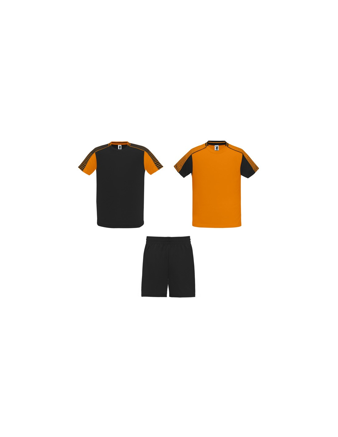 Męski komplet sportowy składający się z 2 koszulek + 1 spodni. 1. Koszulka z pół raglanowymi rękawami, zdobionymi paskami. 2. Okrągły dekolt. 3. Kolor drugiej koszulki występuje w odwróconych kolorach. 4. Elastyczne spodnie w pasie z wewnętrznym sznurkiem w tym samym kolrze ze szwami zabezpieczającymi. 5. Kontrastujące boczne paski oraz przecięcia w nogawce.