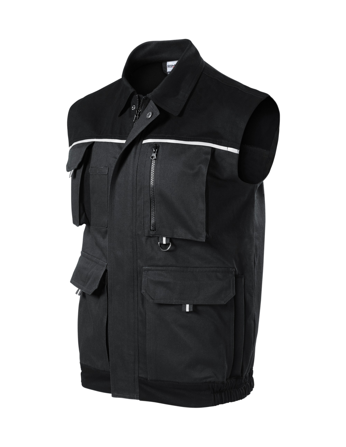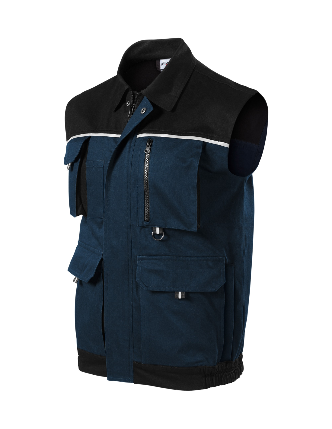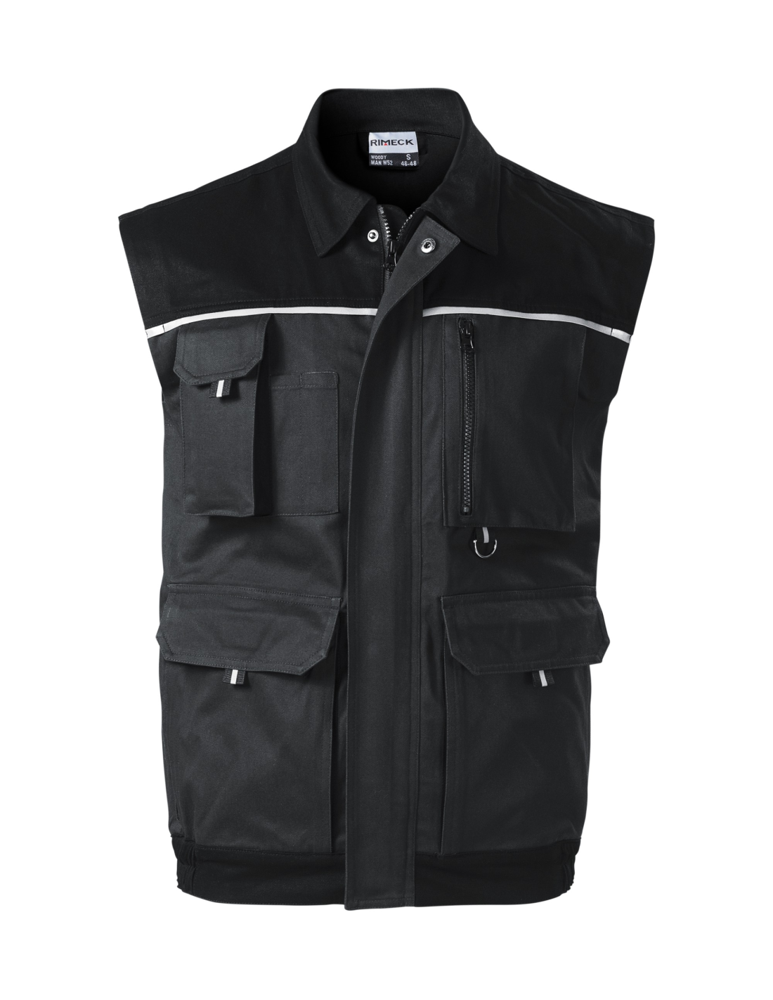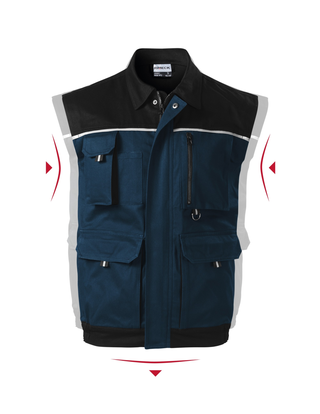 zapinany na całej długości zamek błyskawiczny z klapką, zakładki na plecach, 8 wielofunkcyjnych kieszeni, kieszenie mieszkowe z patką i kieszeniami zapinanymi na zamek, dolna lamówka kamizelki z gumką, metalowa zawieszka w kształcie litery D oraz wieszaczek na klucze i identyfikator, podwójne szwy dla większej trwałości, elementy odblaskowe