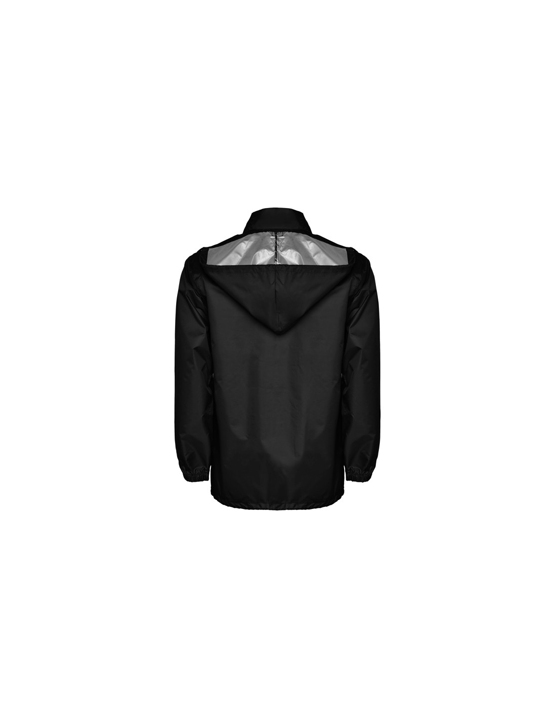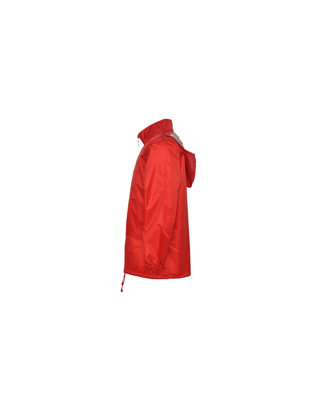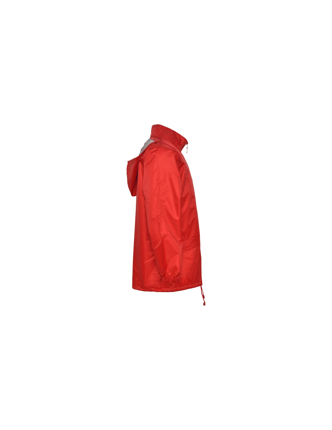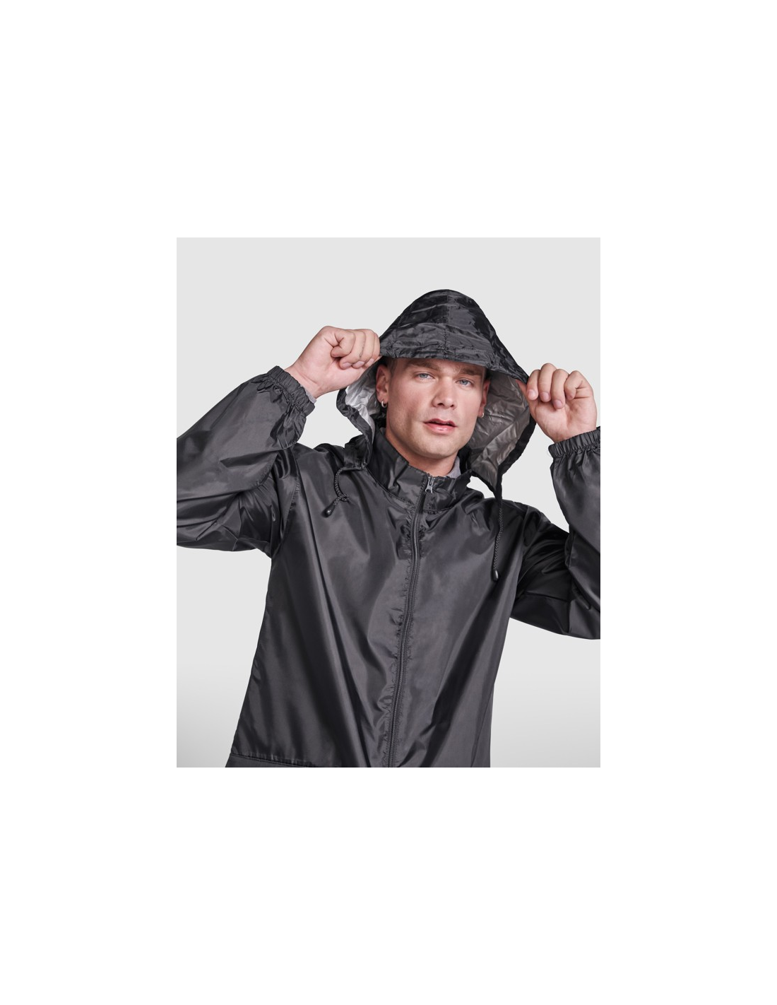Płaszcz przeciwdeszczowy uniseks. Wysoki kołnierz i odpinany kaptur z regulowanymi łokciami. Centralny zamek błyskawiczny. Dwie kieszenie boczne z klapkami. Elastyczne mankiety. Dół z regulowanymi sznurkami do ściągania wewnątrz. Wewnętrzna kieszeń z elastycznej taśmy umożliwia składanie i przechowywanie.