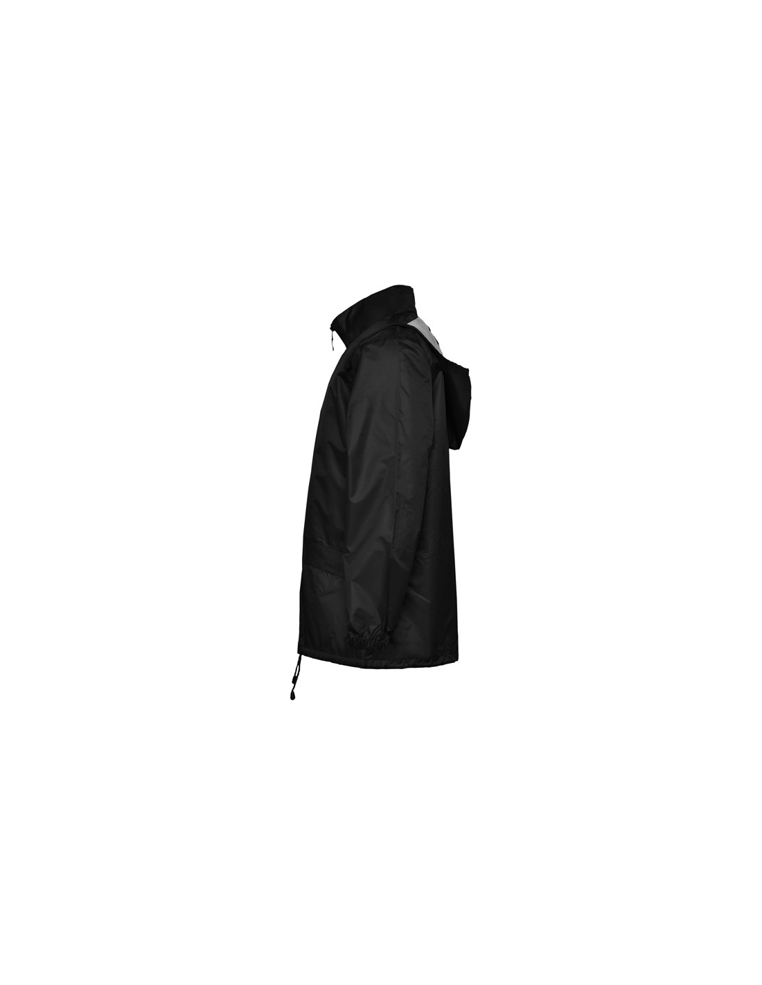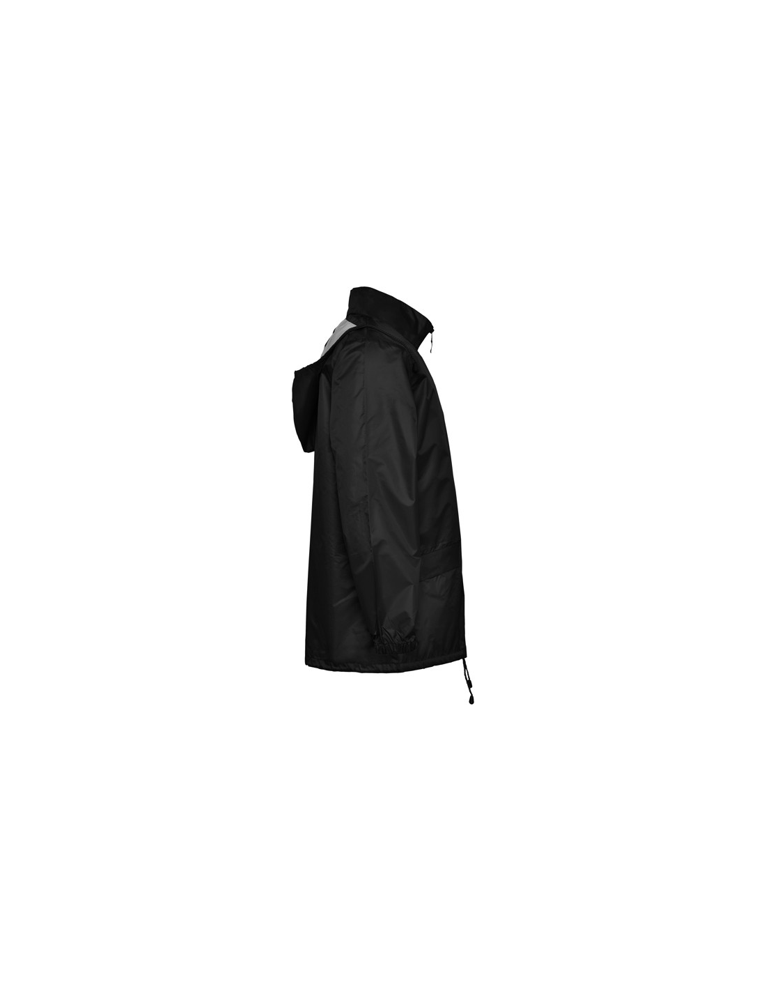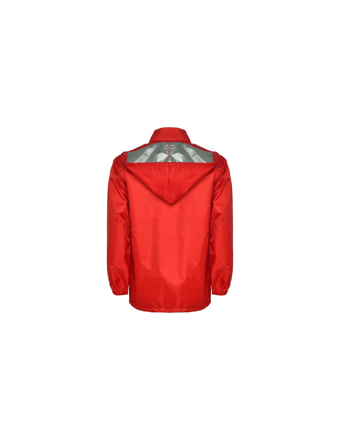 Płaszcz przeciwdeszczowy uniseks. Wysoki kołnierz i odpinany kaptur z regulowanymi łokciami. Centralny zamek błyskawiczny. Dwie kieszenie boczne z klapkami. Elastyczne mankiety. Dół z regulowanymi sznurkami do ściągania wewnątrz. Wewnętrzna kieszeń z elastycznej taśmy umożliwia składanie i przechowywanie.