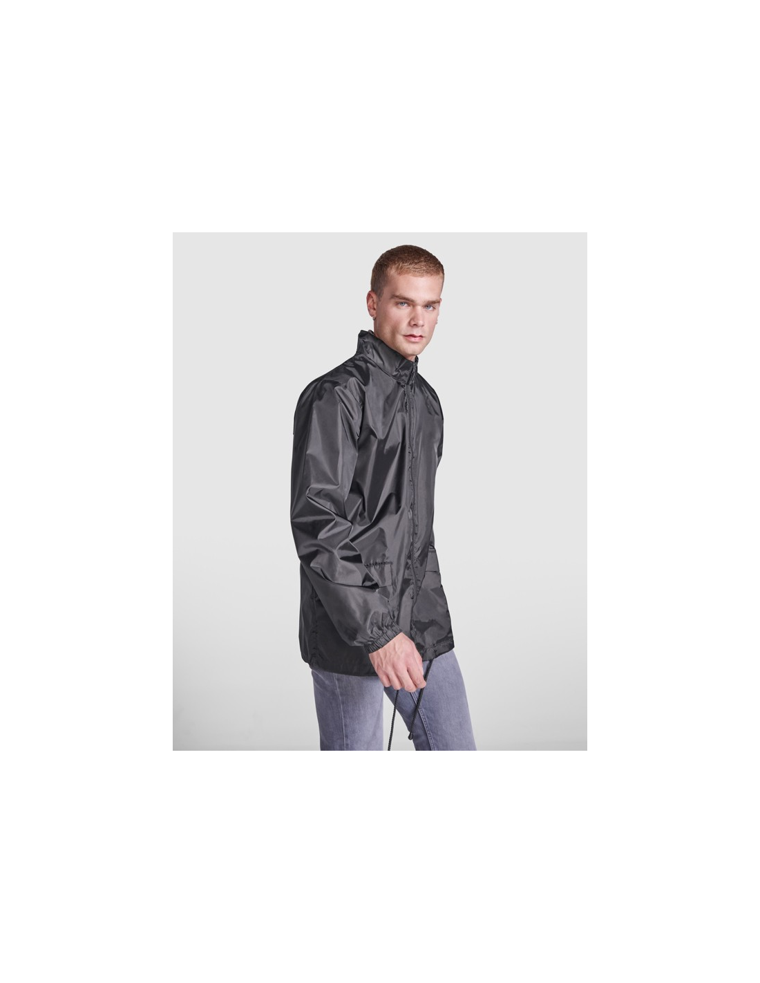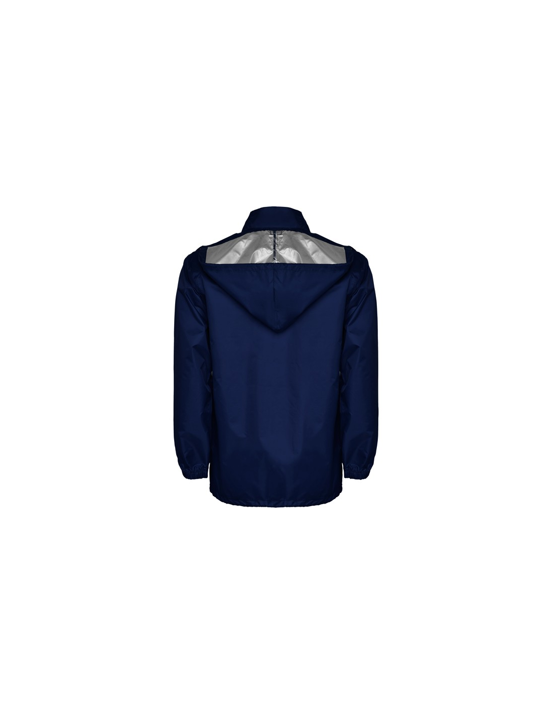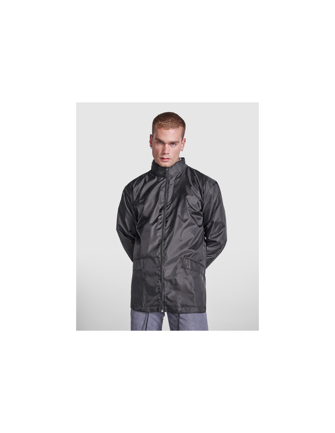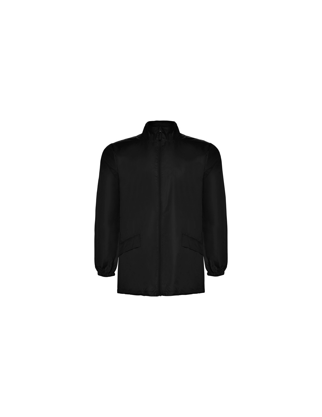Płaszcz przeciwdeszczowy uniseks. Wysoki kołnierz i odpinany kaptur z regulowanymi łokciami. Centralny zamek błyskawiczny. Dwie kieszenie boczne z klapkami. Elastyczne mankiety. Dół z regulowanymi sznurkami do ściągania wewnątrz. Wewnętrzna kieszeń z elastycznej taśmy umożliwia składanie i przechowywanie.