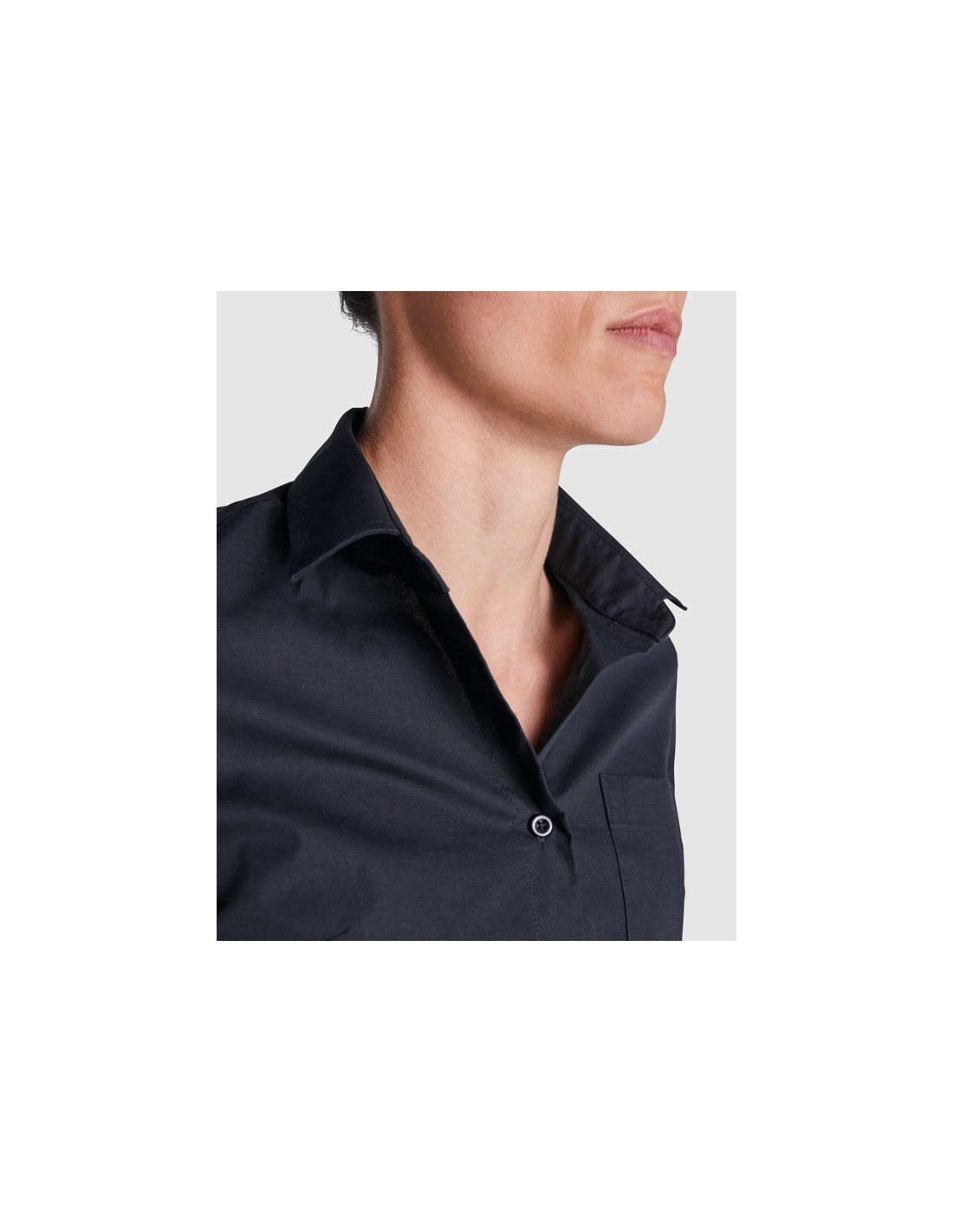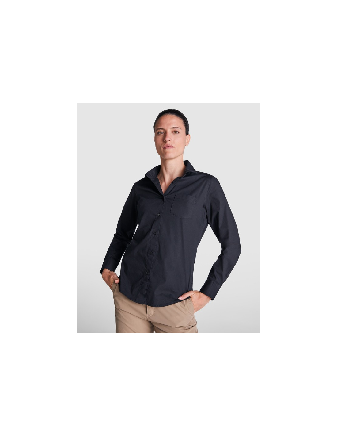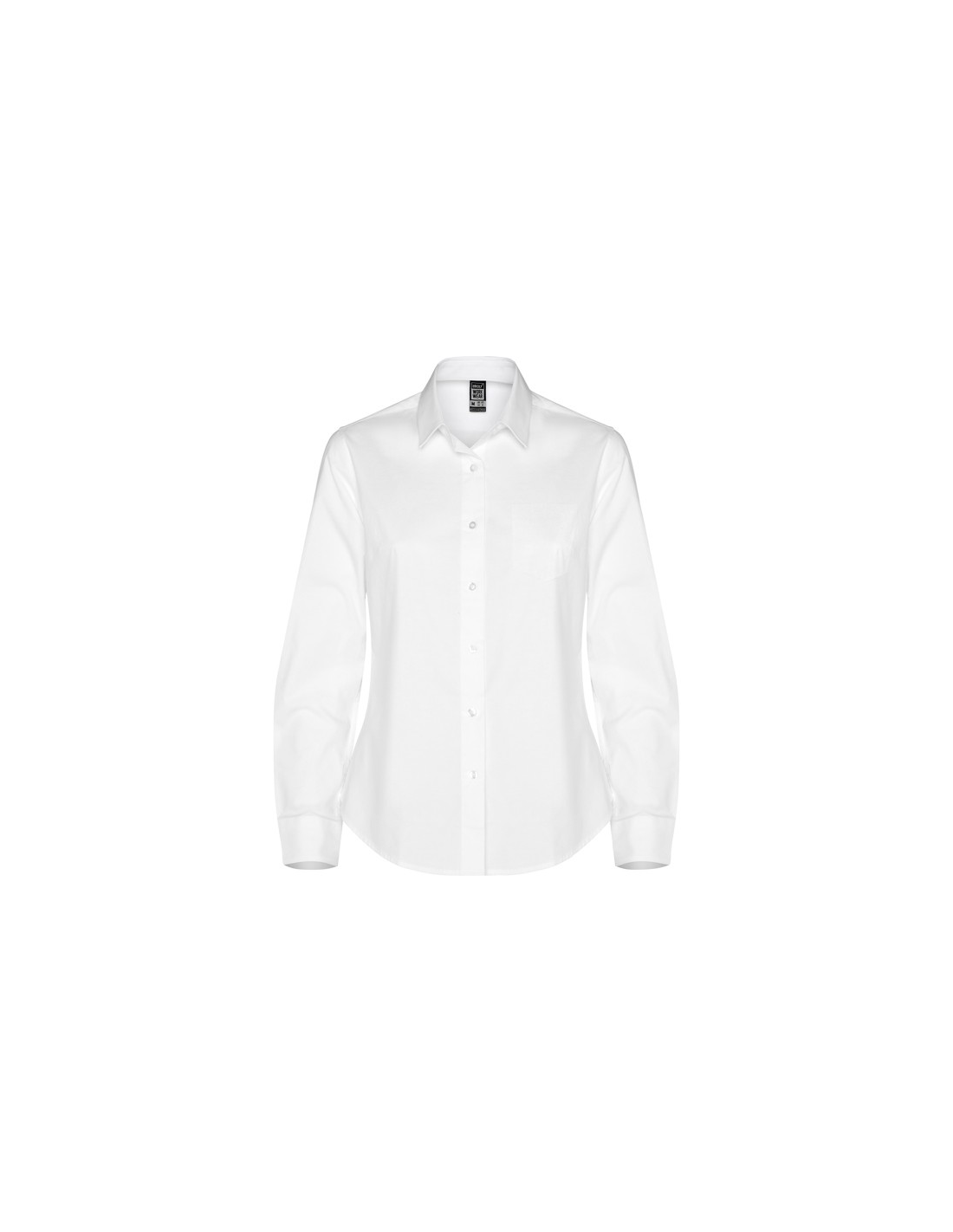 Damska koszula z długim rękawem wykonana z elastycznego materiału. · Podszewka kołnierza. · Przednie plisy na klatce piersiowej i na plecach. · Przednia kieszeń z widocznymi guzikami. · Dwa guziki w mankietach. · Tylny karczek. · Zaokrąglone obszycie.