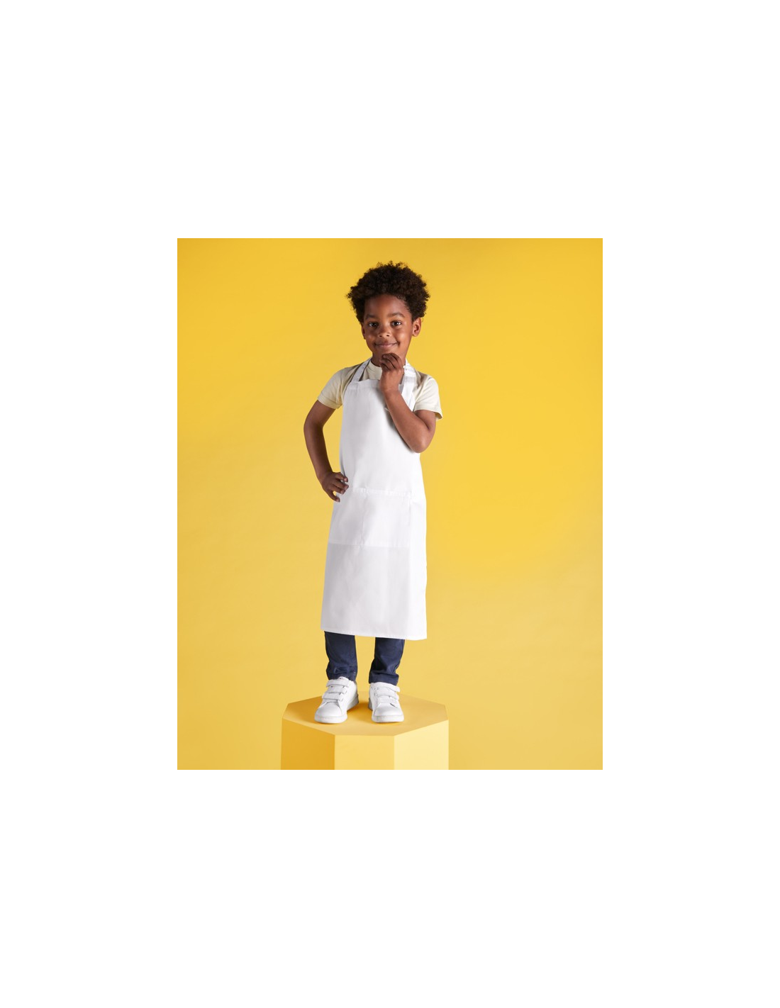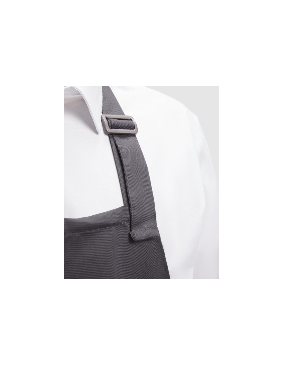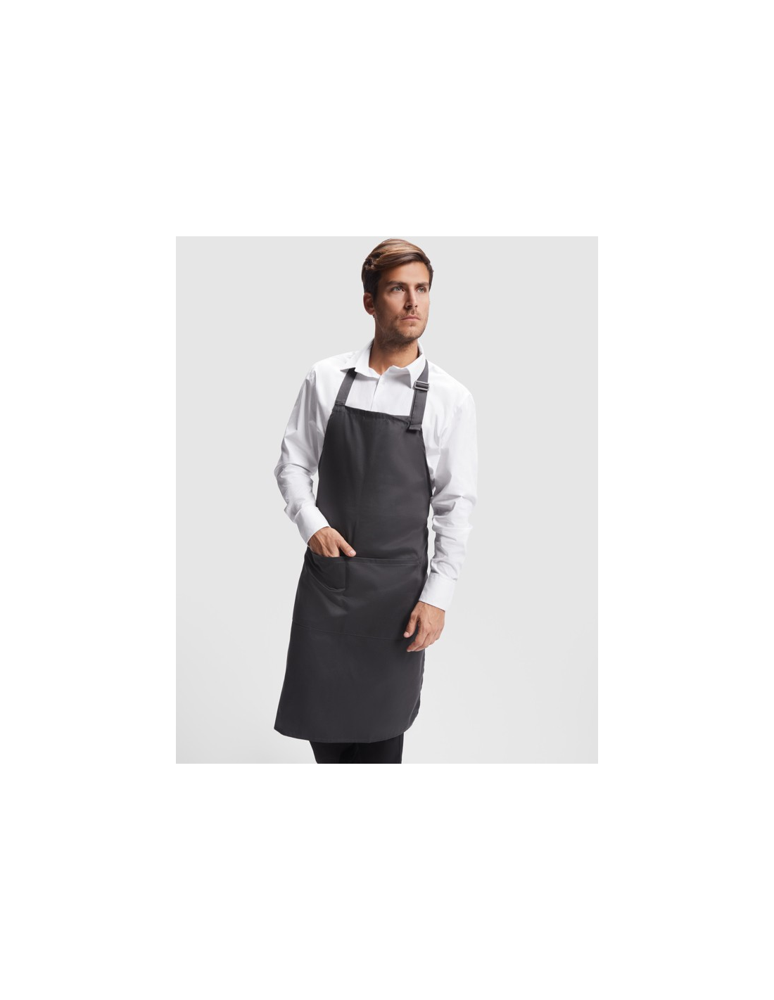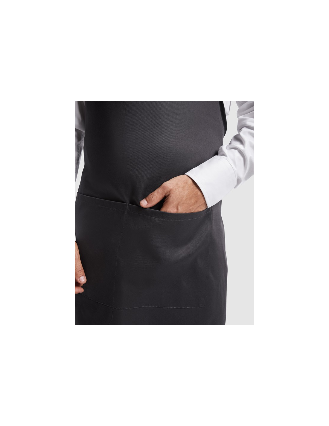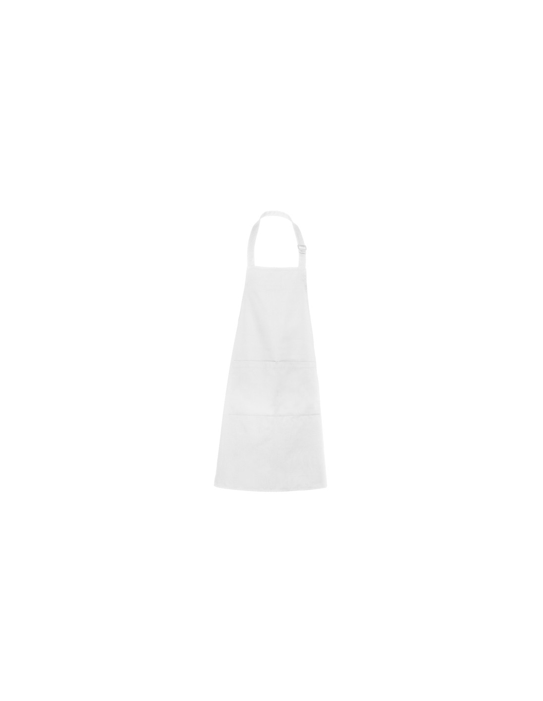Długi fartuch z twillu. · Plastikowy pasek z regulowanym zapięciem. · Boczne paski do sznurowania. · Dwie przednie kieszenie.