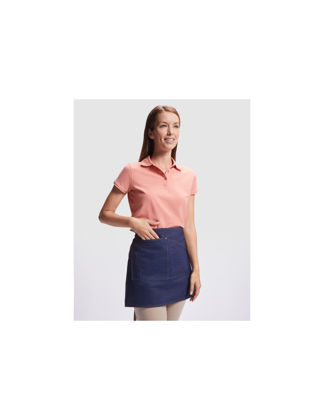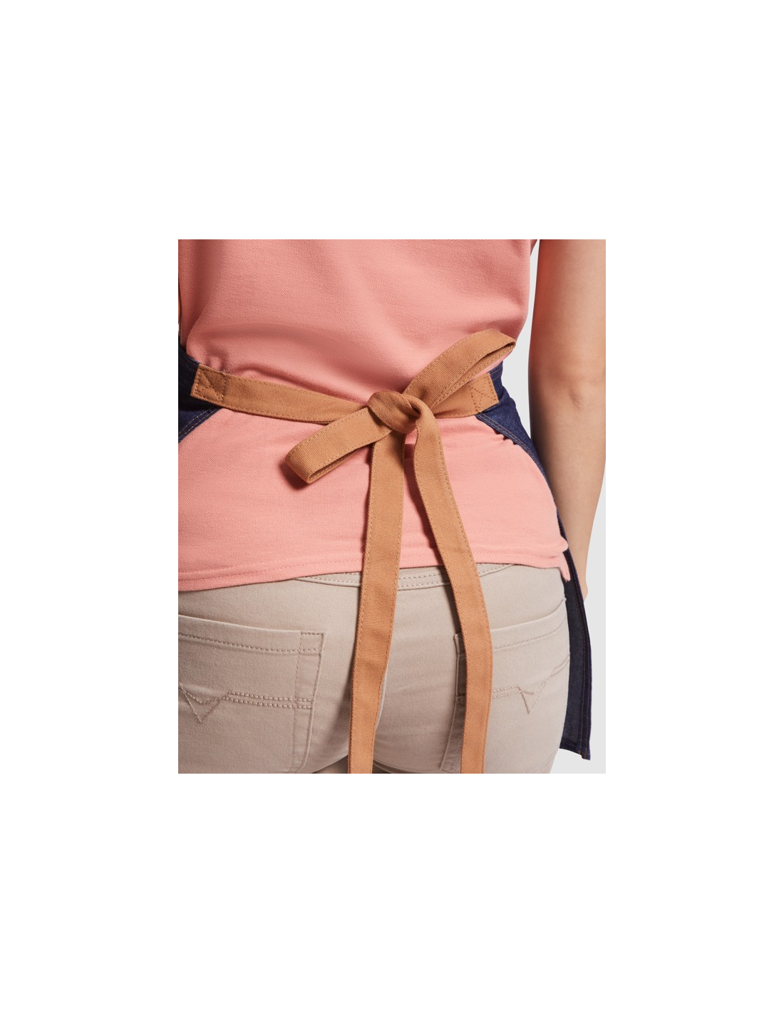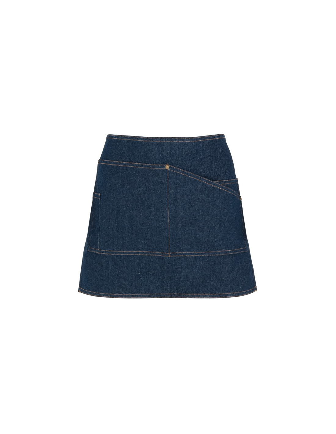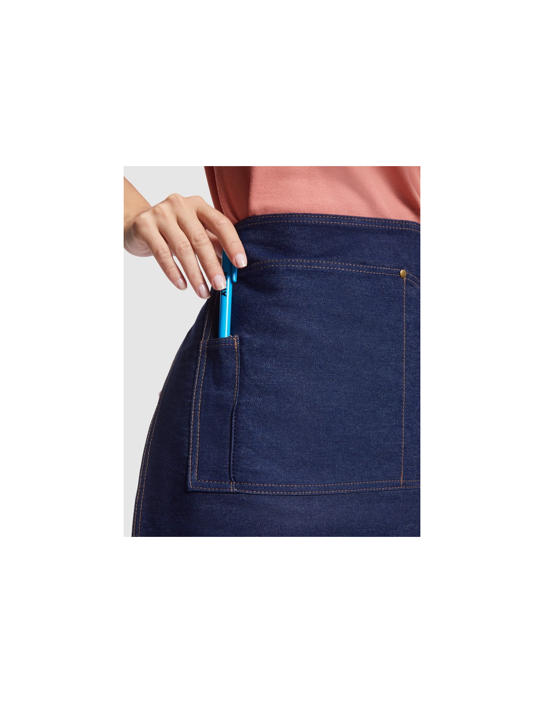 Krótki fartuch z tkaniny dżinsowej: · Cztery kieszenie z przodu z nitami, z których jedna z nich jest przeznaczona na długopis. · Kontrastowe taśmy do wiązania.