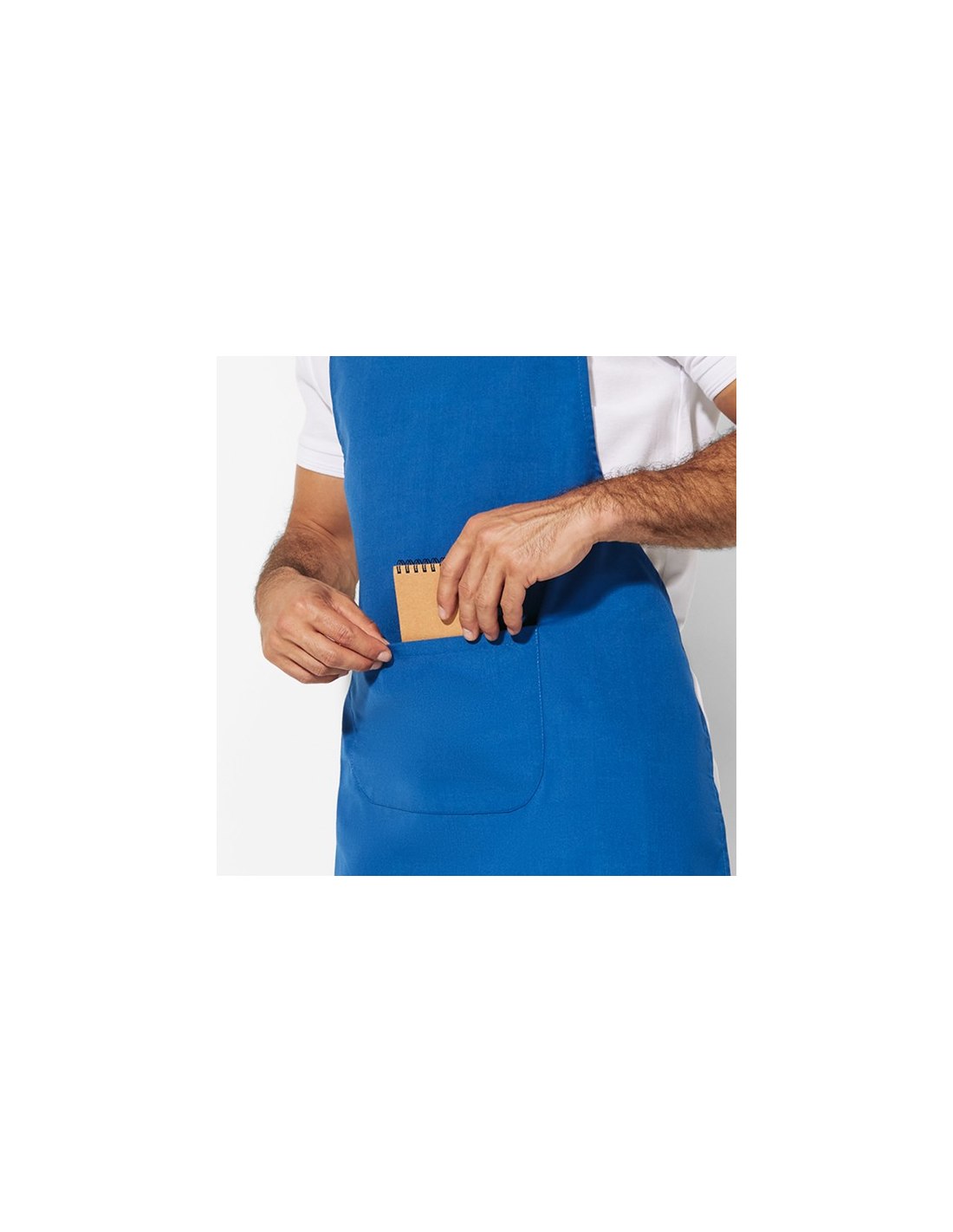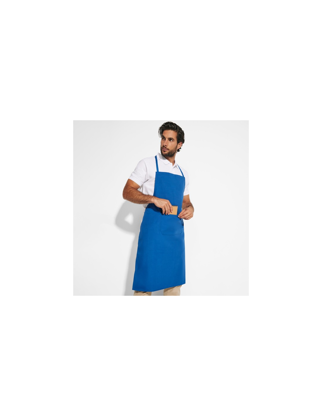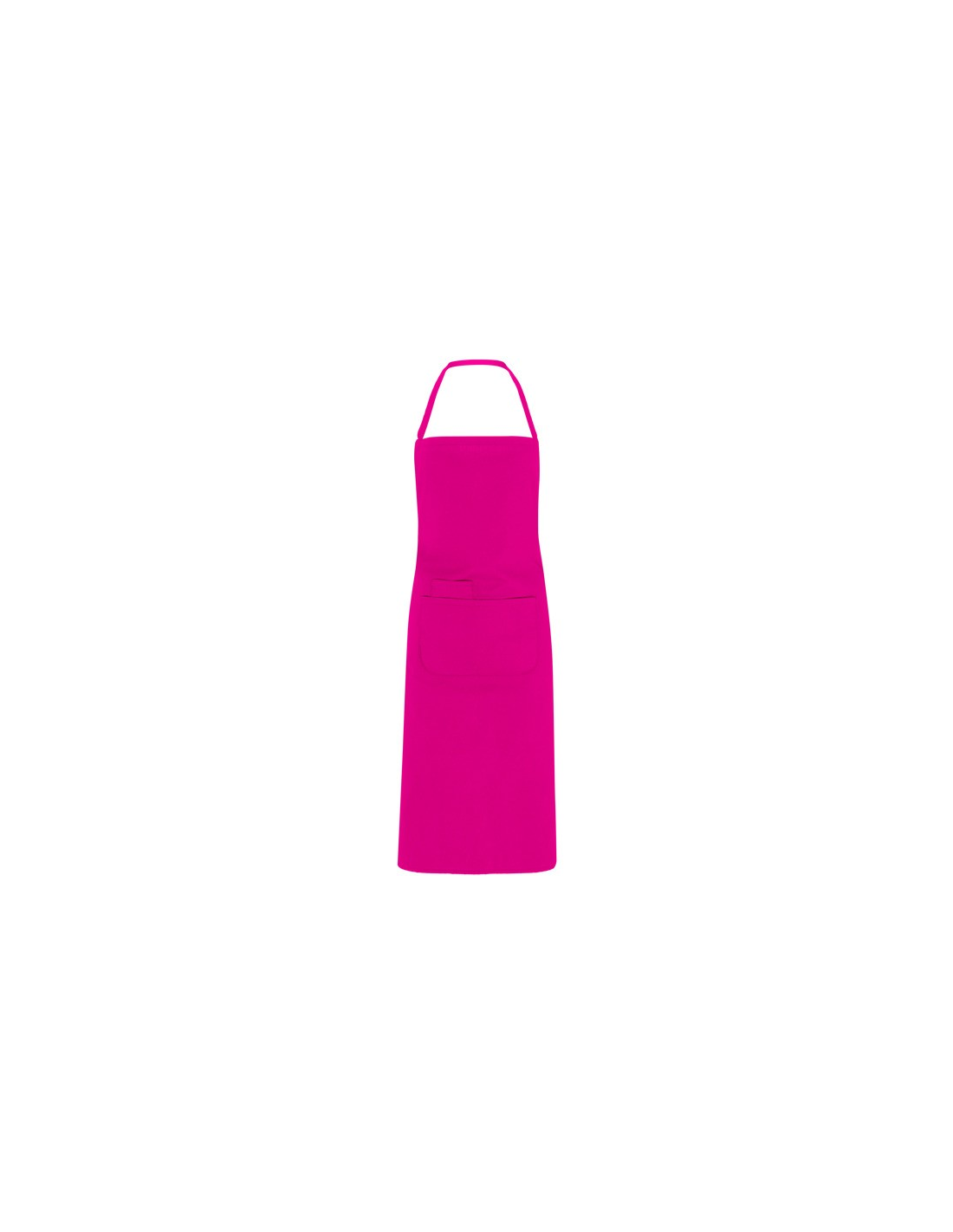 Długi fartuch popelinowy: · Tasiemka na karku w kolorze. · Wiązanie po bokach do sznurowania. · Dwie kieszenie z przodu, jedna wewnętrzna i jedna duża naszywana kieszeń.