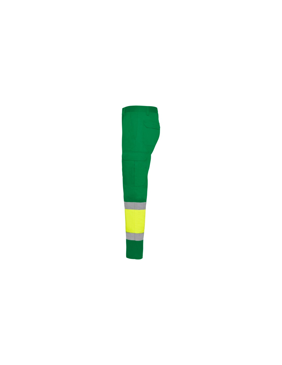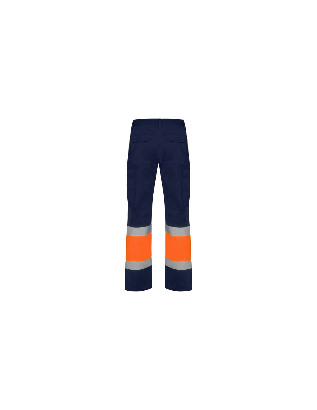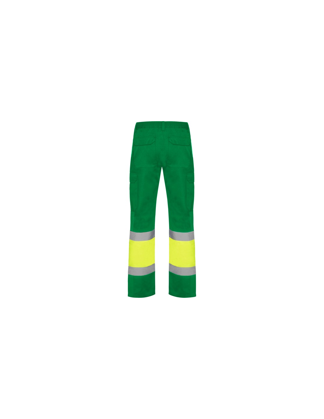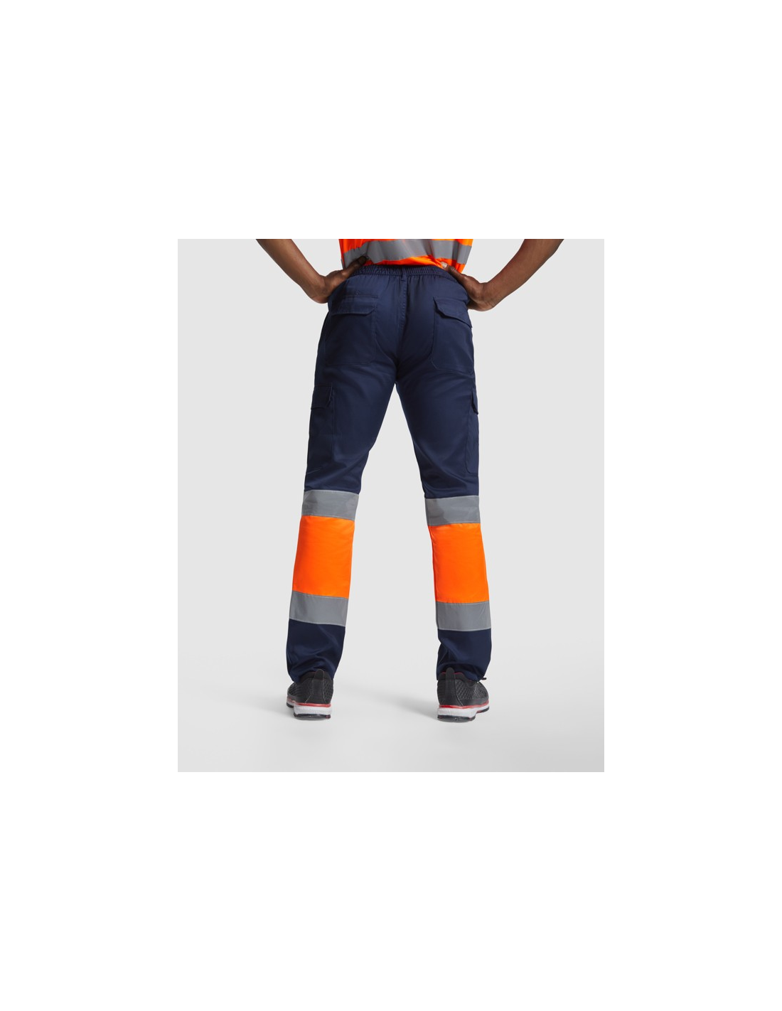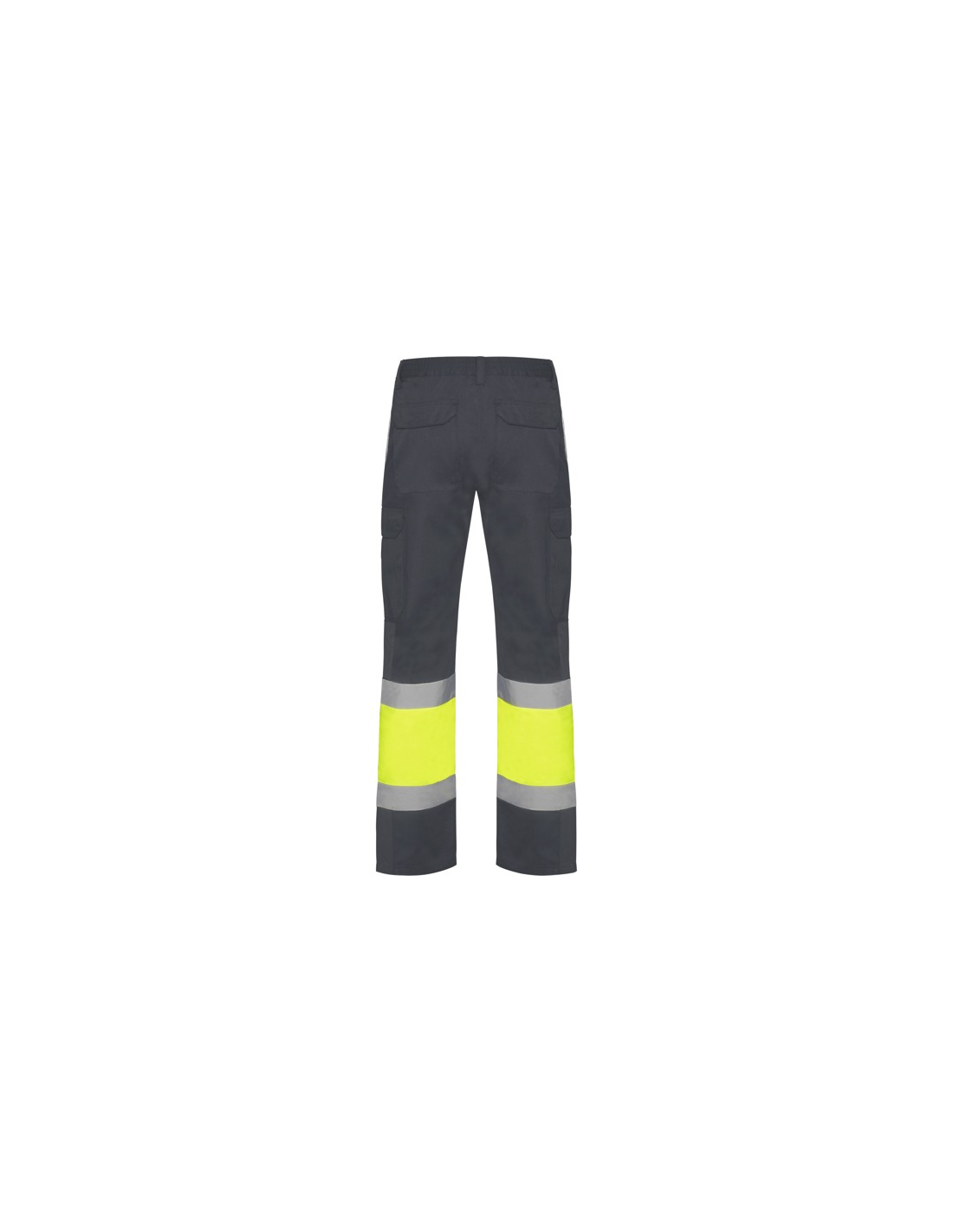 Odblaskowe letnie spodnie robocze. · Elastyczna talia z tyłu. · Dwie kieszenie z klapką z tyłu zapinane na rzep. · Dwie kieszenie z przodu i dwie kieszenie boczne z klapą zapinaną na rzep. · Łączone w dwóch kolorach i z taśmami odblaskowymi.