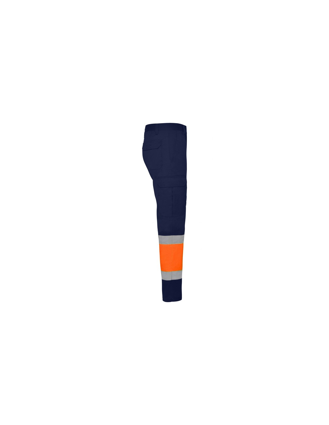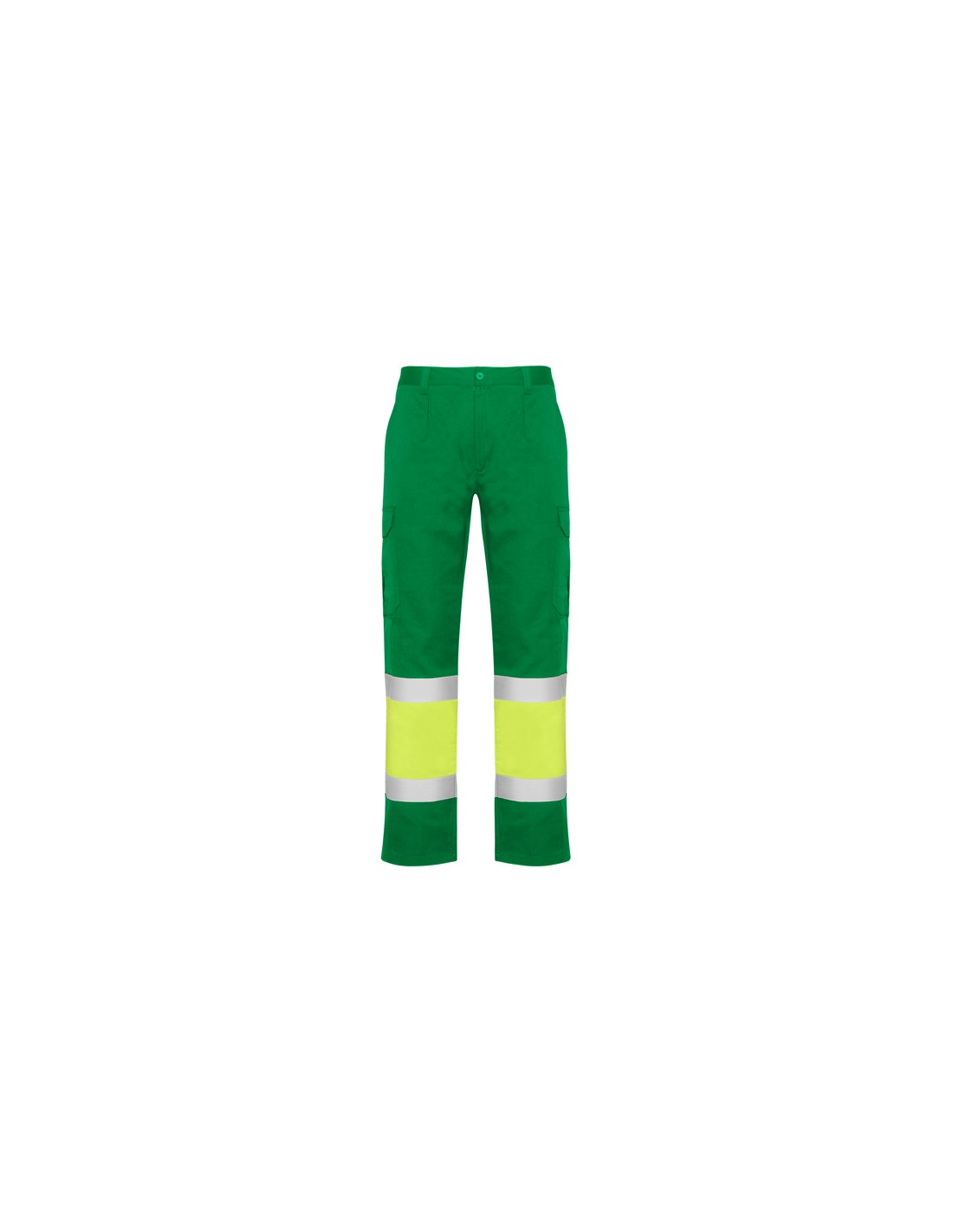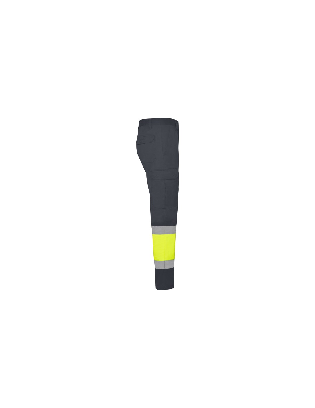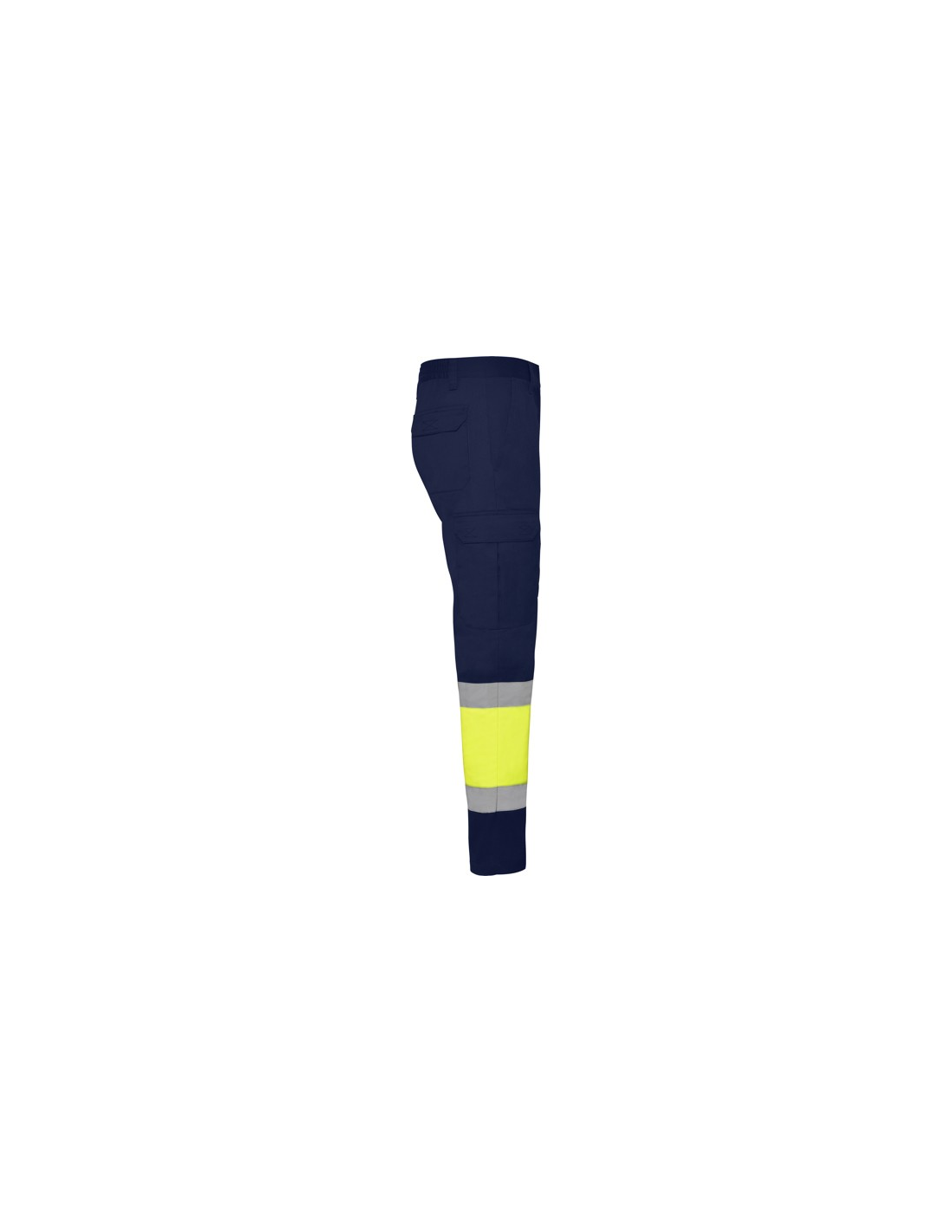 Odblaskowe letnie spodnie robocze. · Elastyczna talia z tyłu. · Dwie kieszenie z klapką z tyłu zapinane na rzep. · Dwie kieszenie z przodu i dwie kieszenie boczne z klapą zapinaną na rzep. · Łączone w dwóch kolorach i z taśmami odblaskowymi.