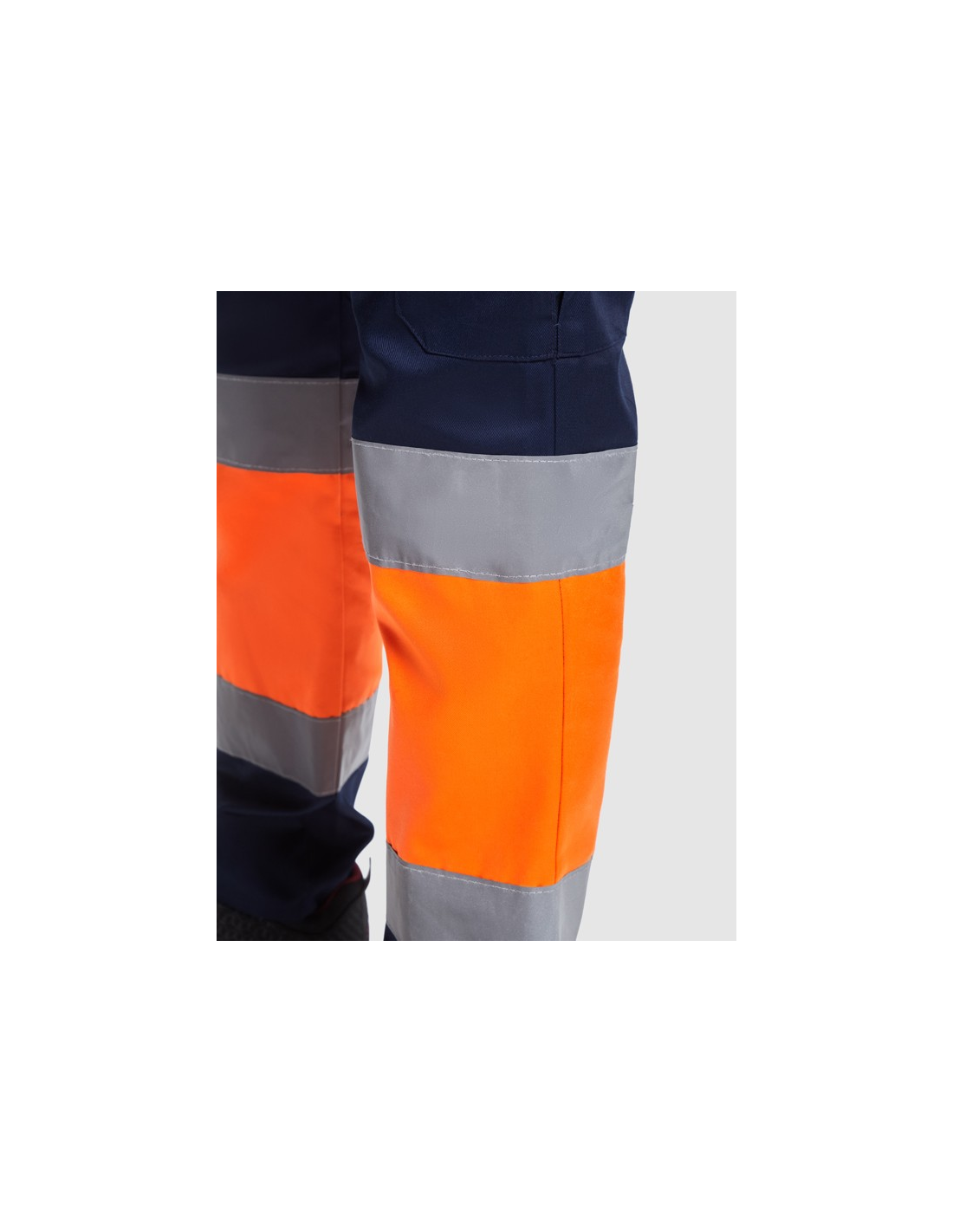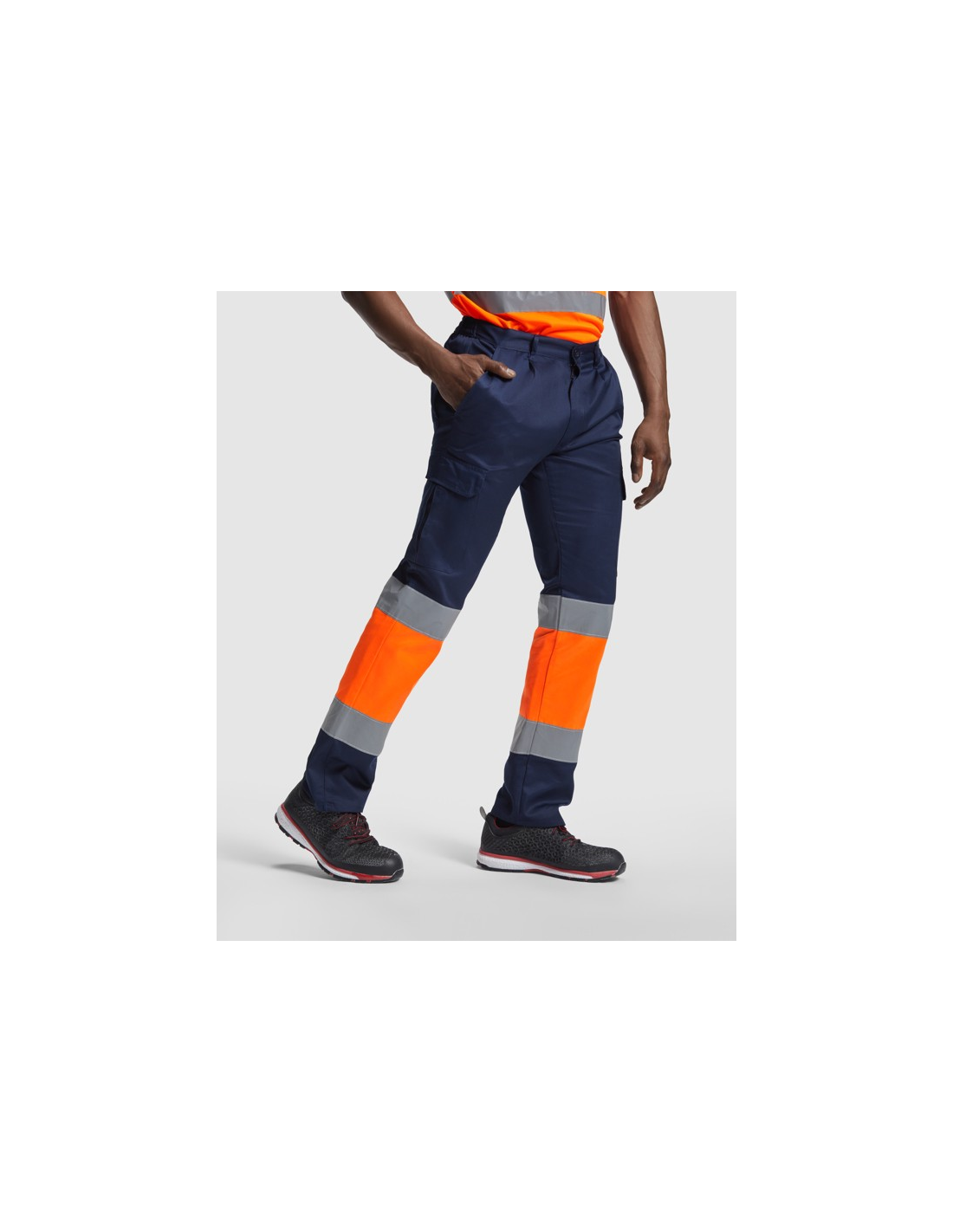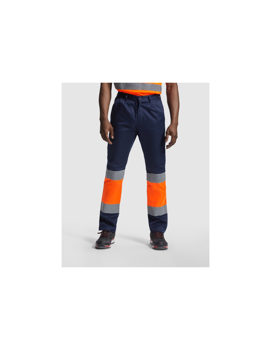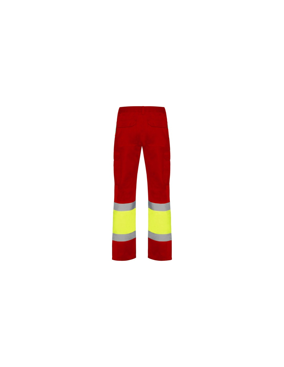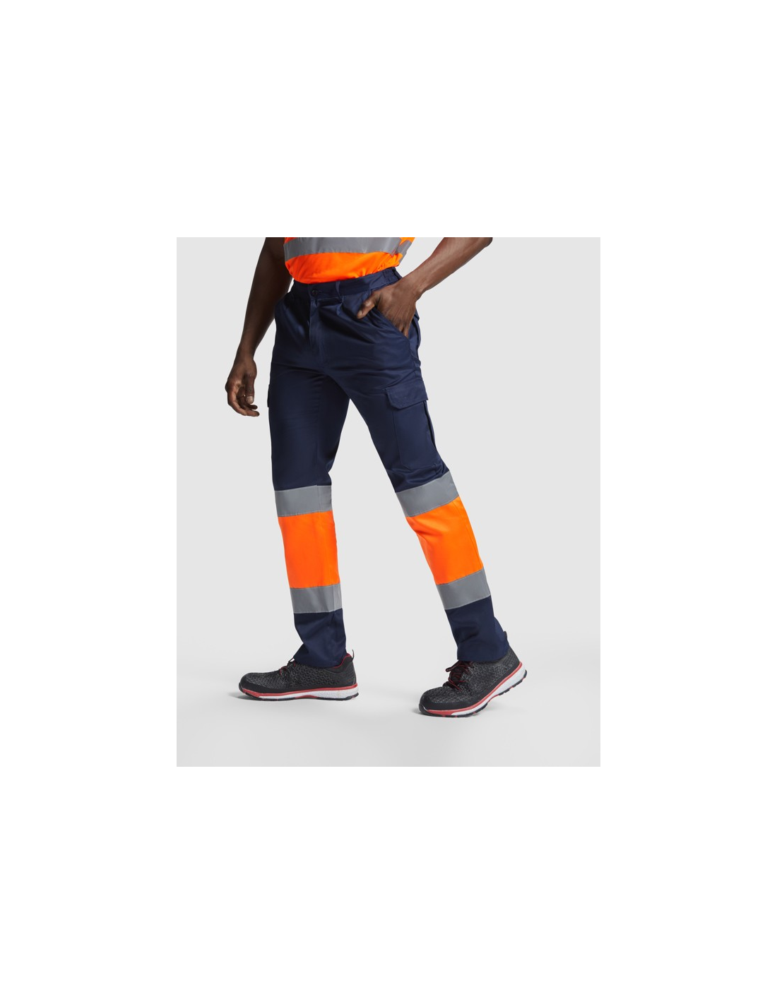 Odblaskowe letnie spodnie robocze. · Elastyczna talia z tyłu. · Dwie kieszenie z klapką z tyłu zapinane na rzep. · Dwie kieszenie z przodu i dwie kieszenie boczne z klapą zapinaną na rzep. · Łączone w dwóch kolorach i z taśmami odblaskowymi.