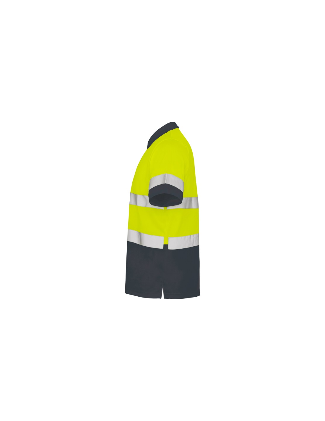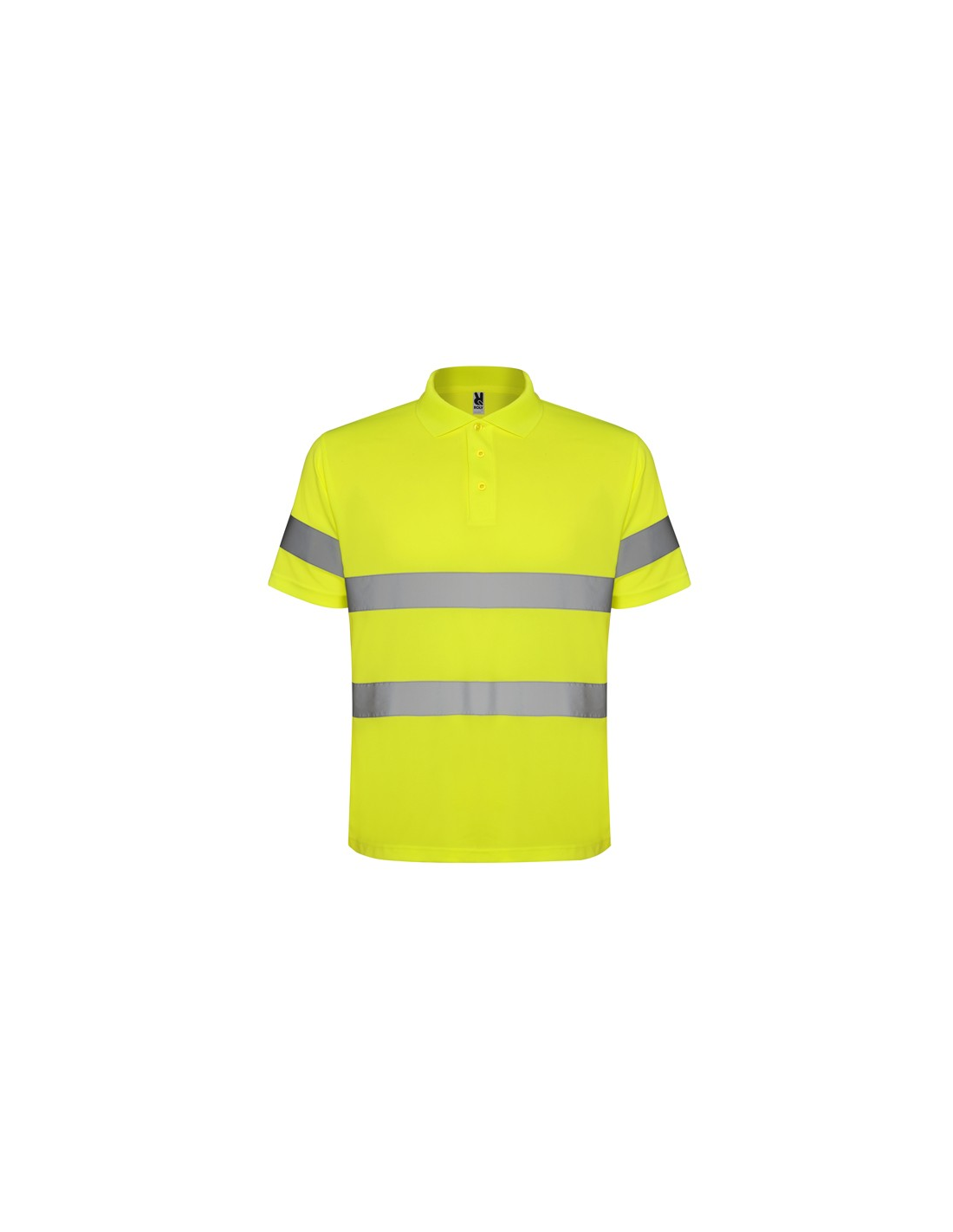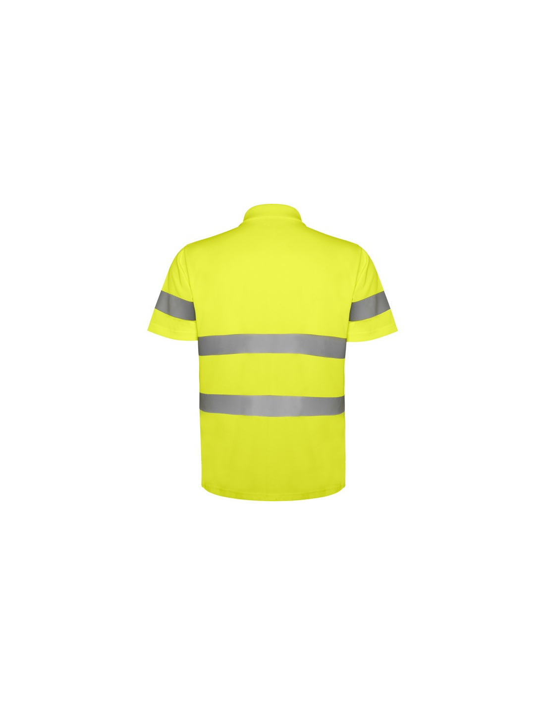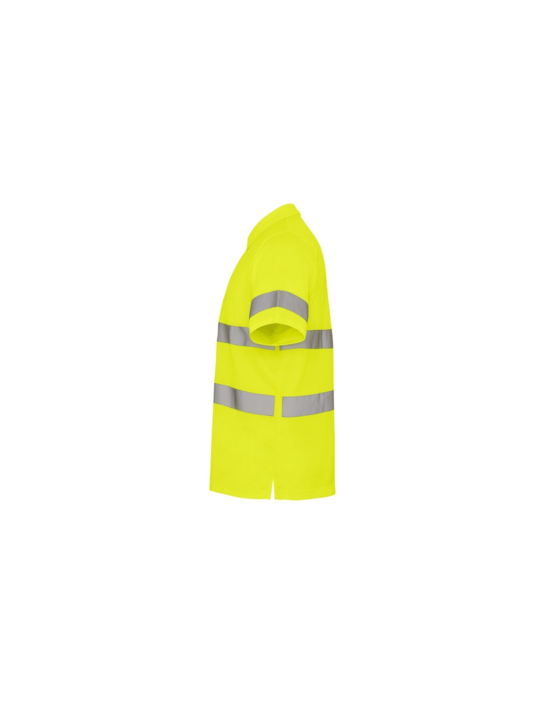 Techniczna koszulka polo o wysokiej widzialności z krótkim rękawem. · Z plisą na 3 guziki. · Kołnierz z dzianiny ściągaczowej 1x1. · Dwa poziome paski odblaskowe na tułowiu i rękawach. · Tkanina antypoślizgowa.