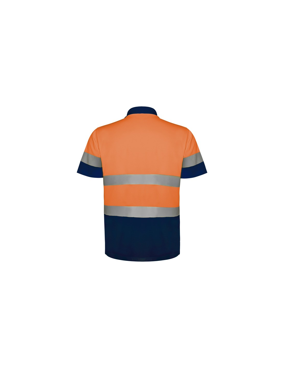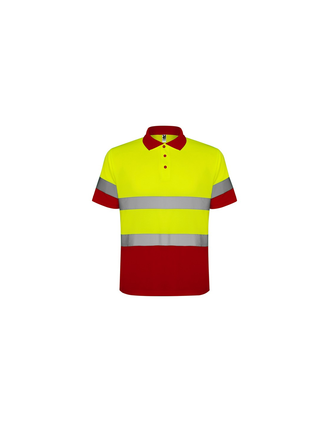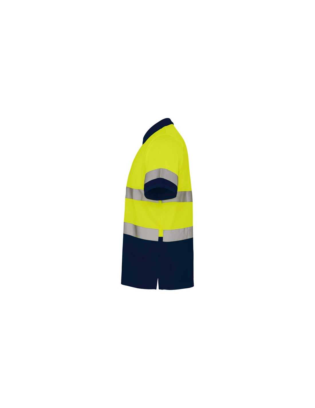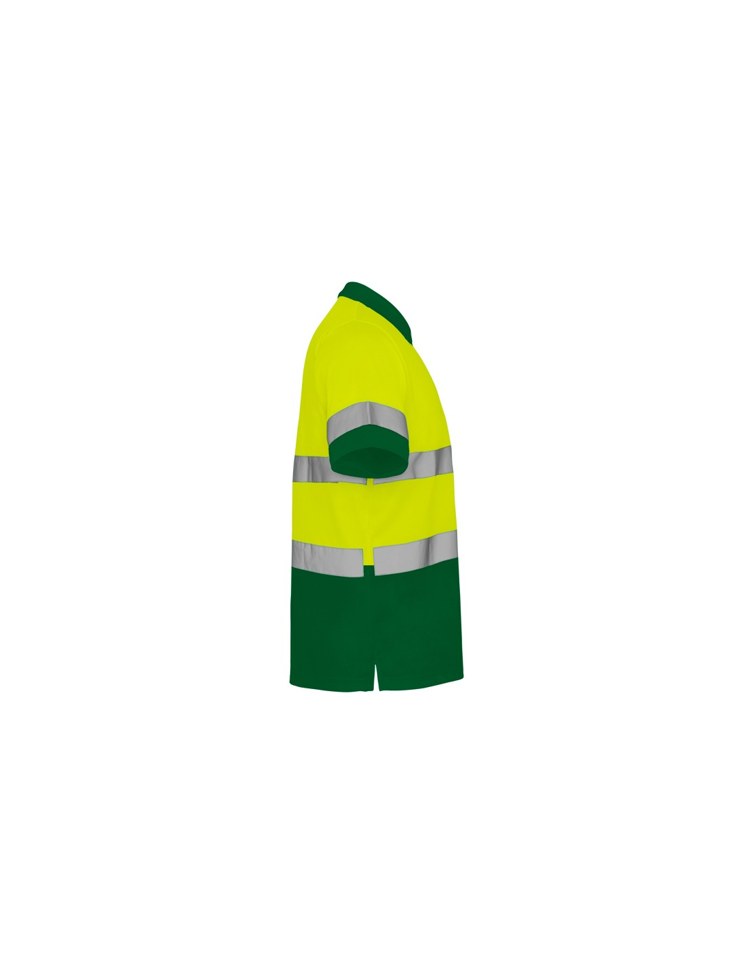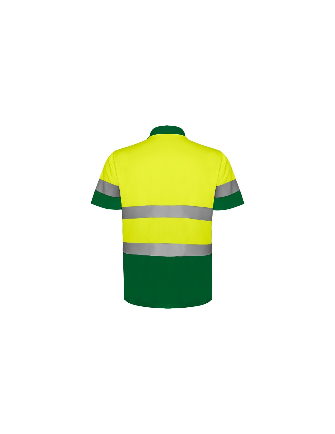Techniczna koszulka polo o wysokiej widzialności z krótkim rękawem. · Z plisą na 3 guziki. · Kołnierz z dzianiny ściągaczowej 1x1. · Dwa poziome paski odblaskowe na tułowiu i rękawach. · Tkanina antypoślizgowa.