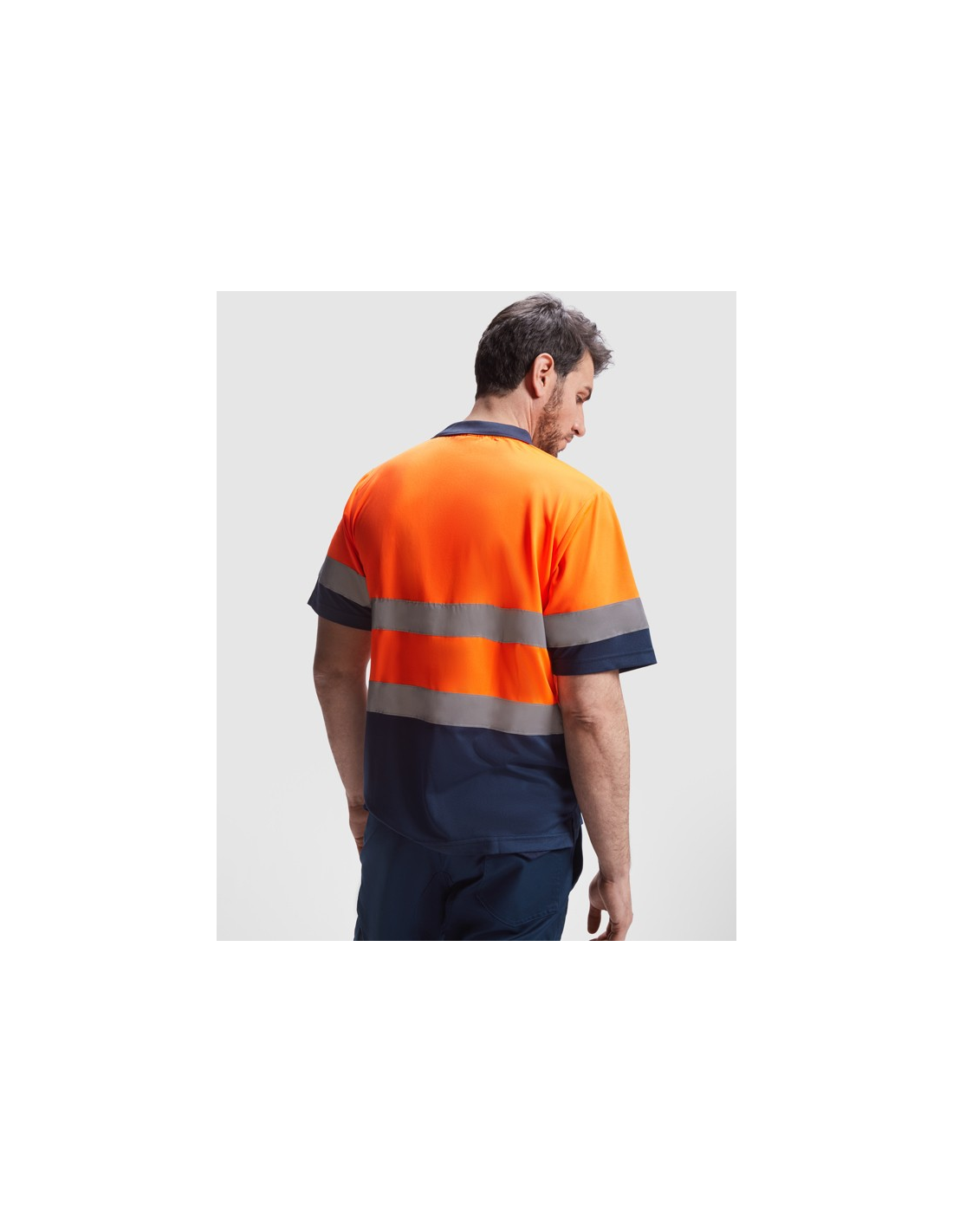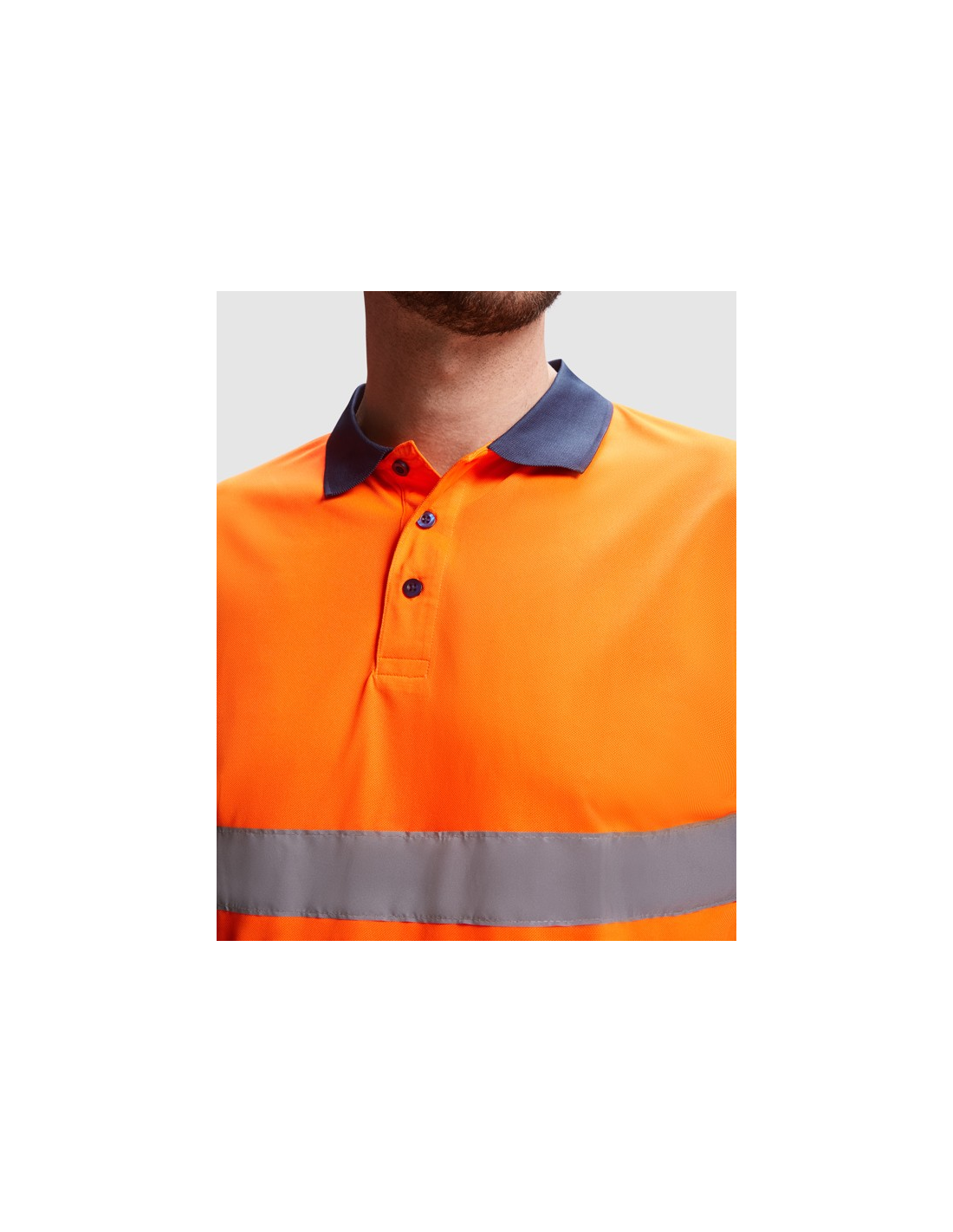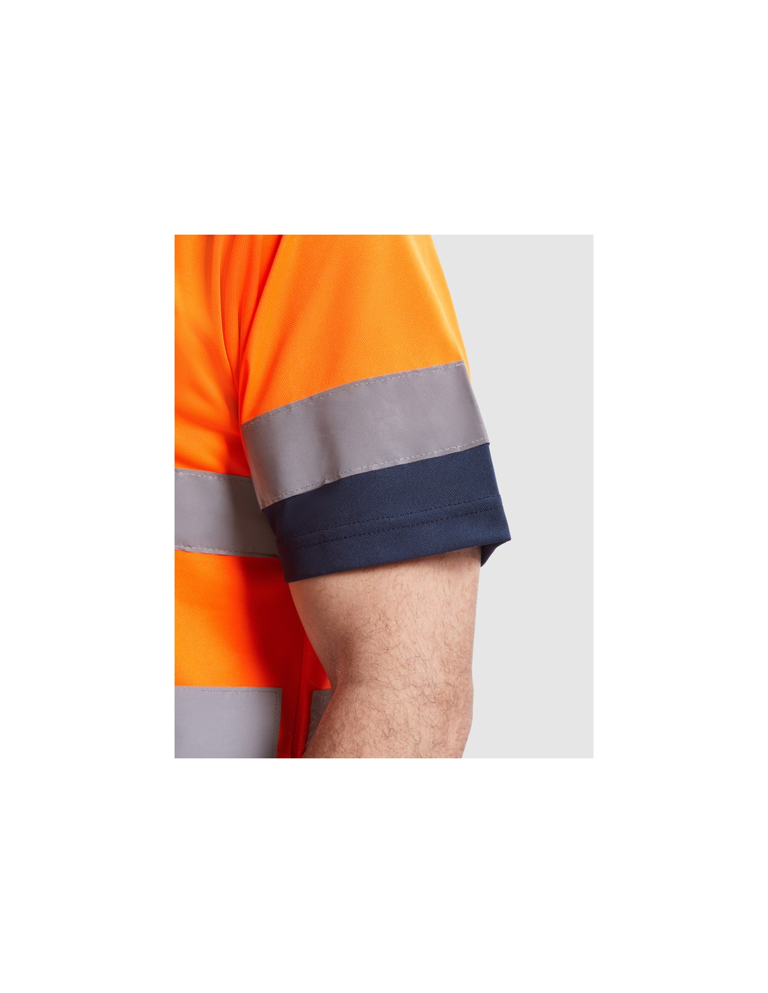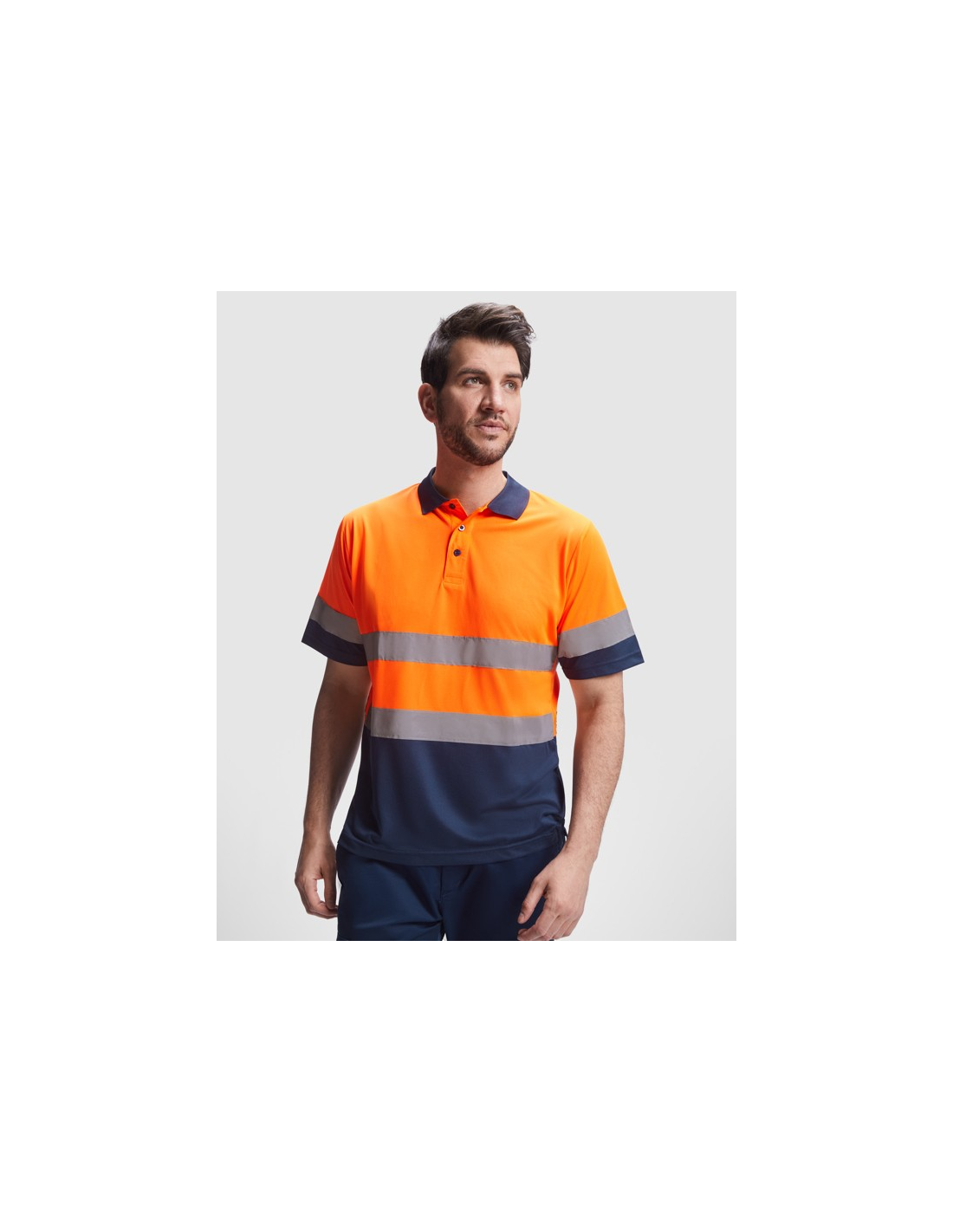 Techniczna koszulka polo o wysokiej widzialności z krótkim rękawem. · Z plisą na 3 guziki. · Kołnierz z dzianiny ściągaczowej 1x1. · Dwa poziome paski odblaskowe na tułowiu i rękawach. · Tkanina antypoślizgowa.