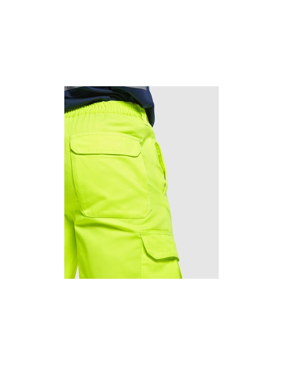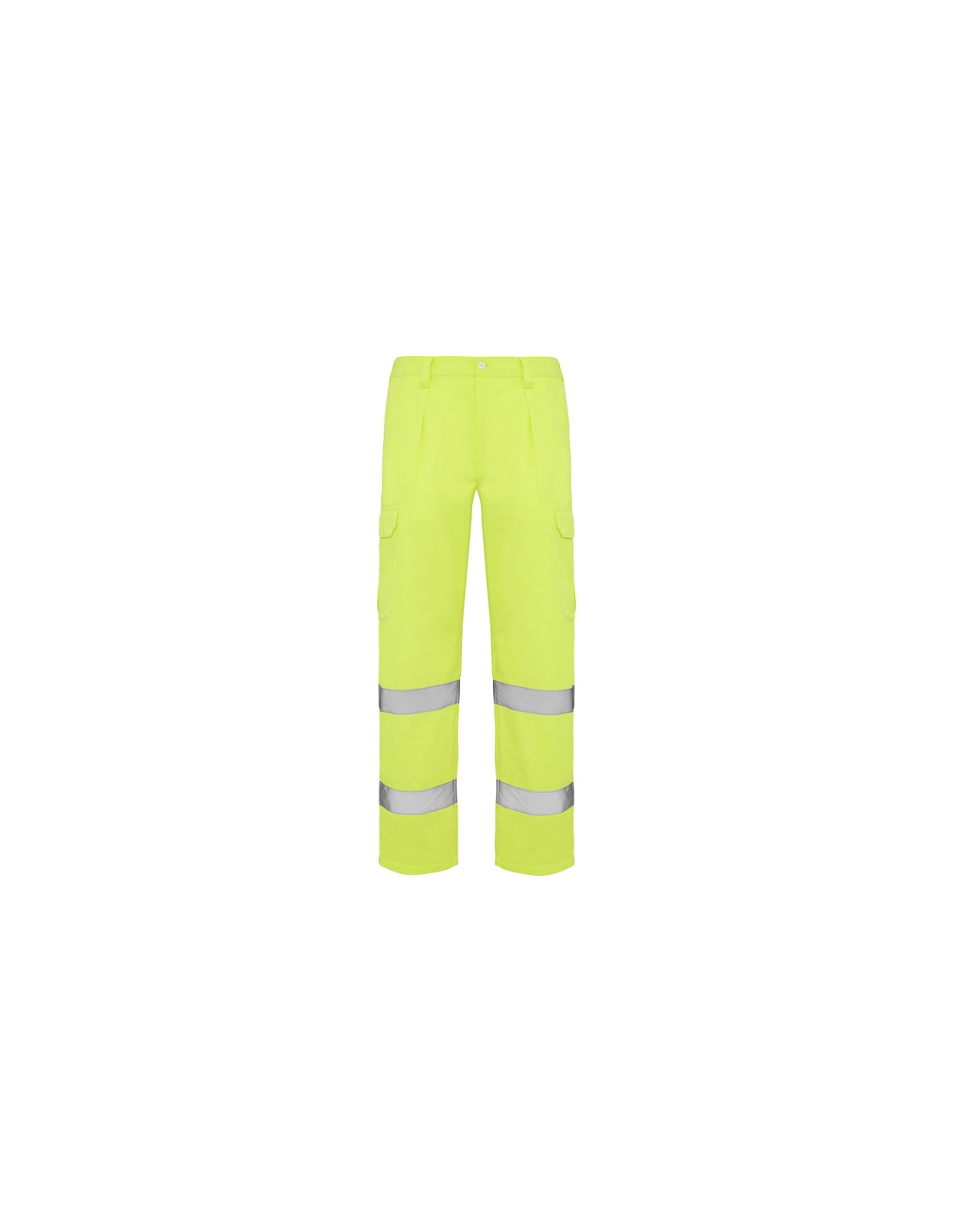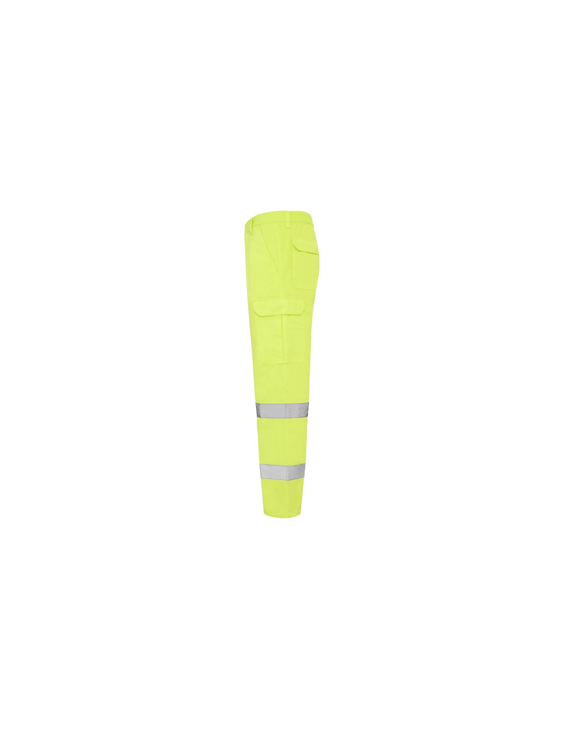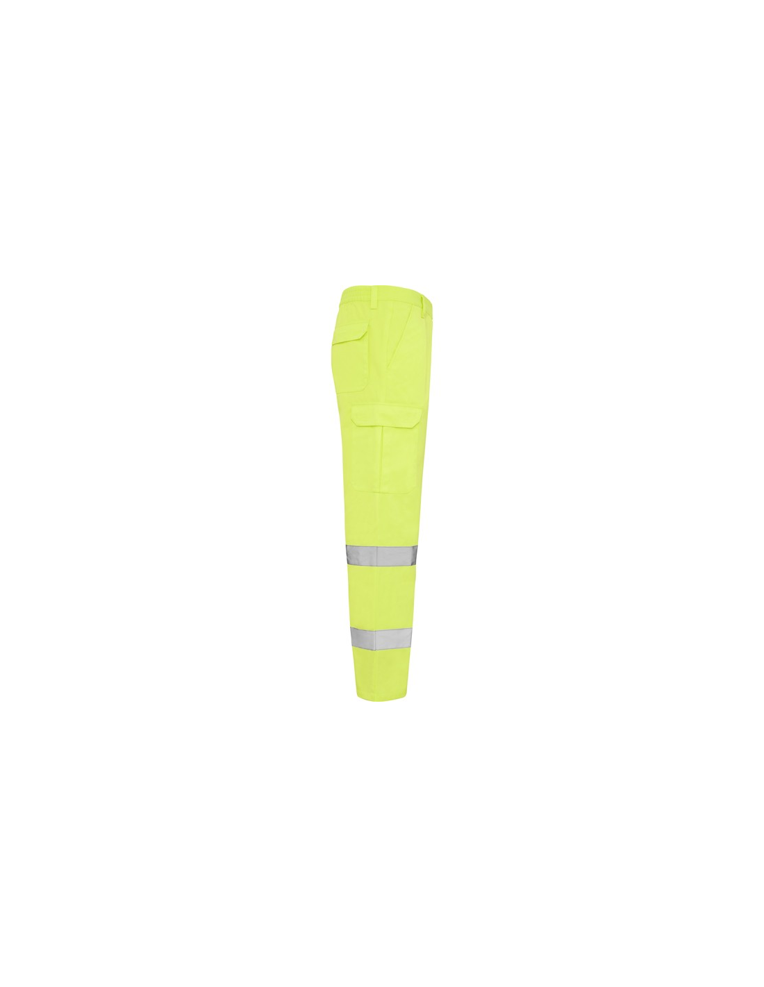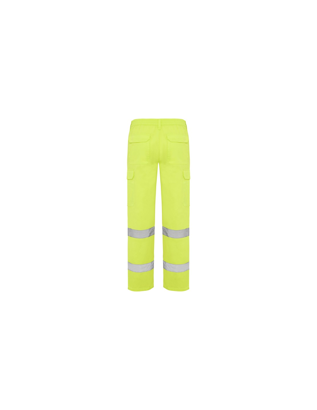 Fluorowe żółte spodnie o wysokiej widzialności. · Regulowana, elastyczna talia z tyłu. · Dwie kieszenie przednie. · Dwie tylne kieszenie z klapką i zapięciem na rzep. · Dwie kieszenie boczne z klinem i klapą zapinaną na rzep. · Dwie poziome taśmy odblaskowe.