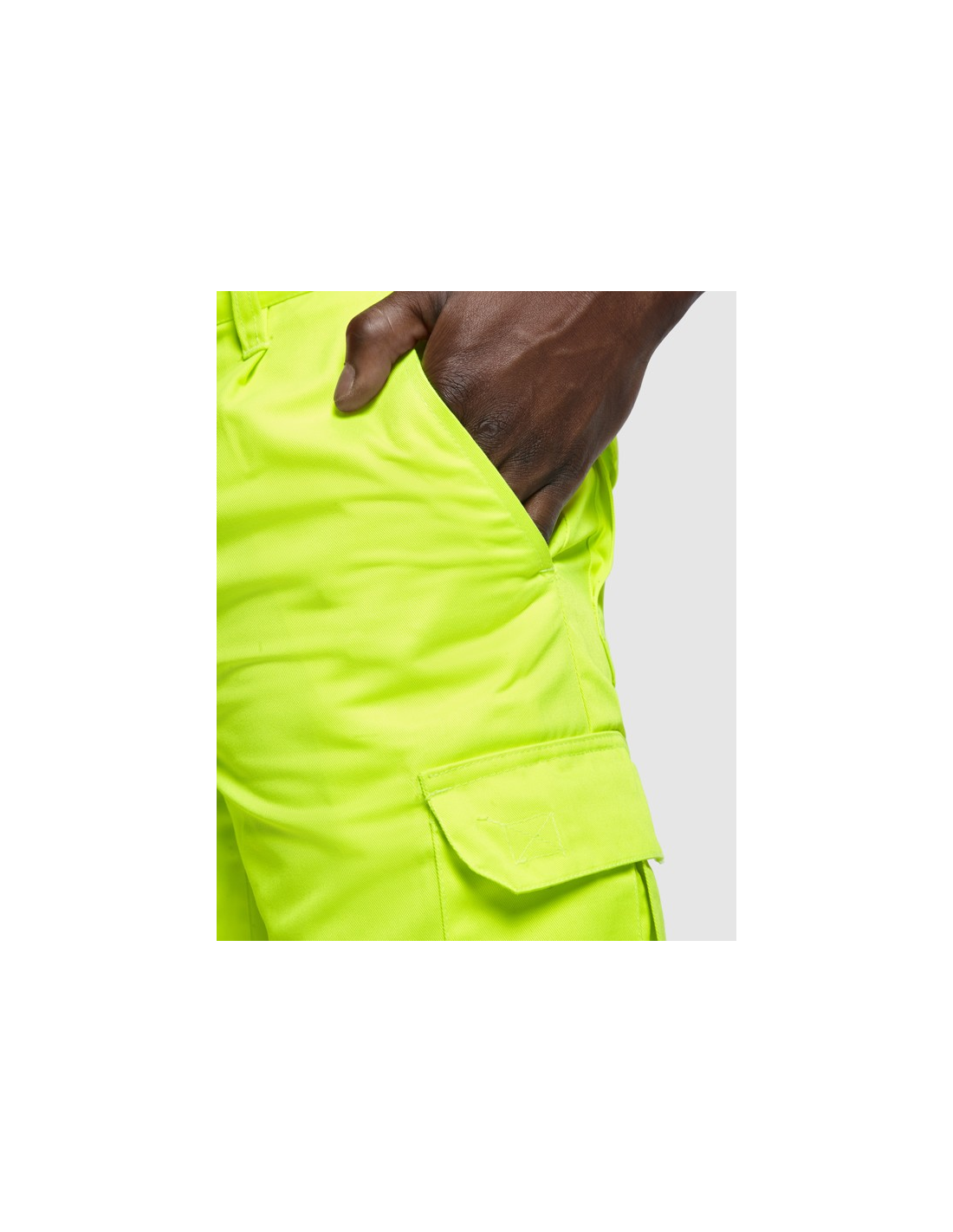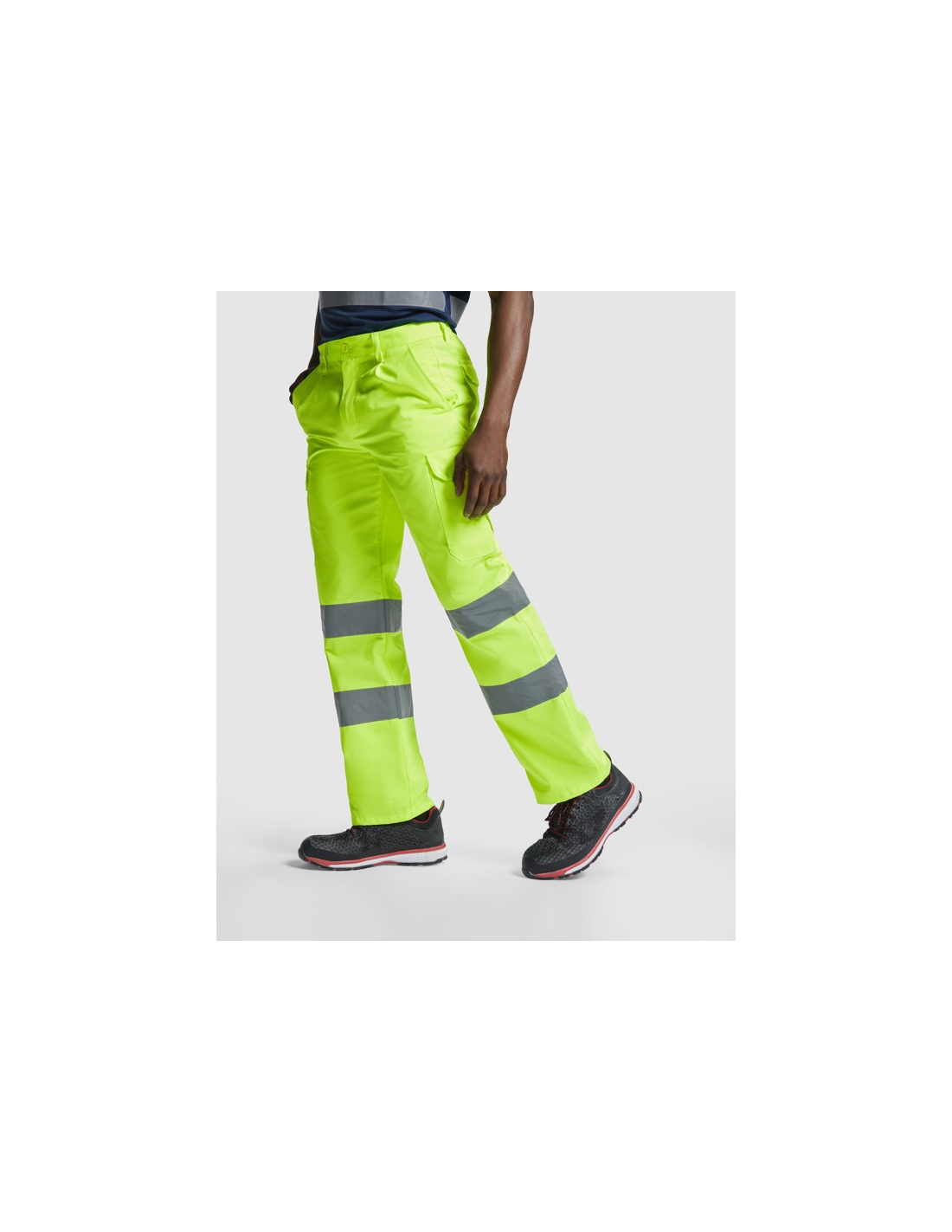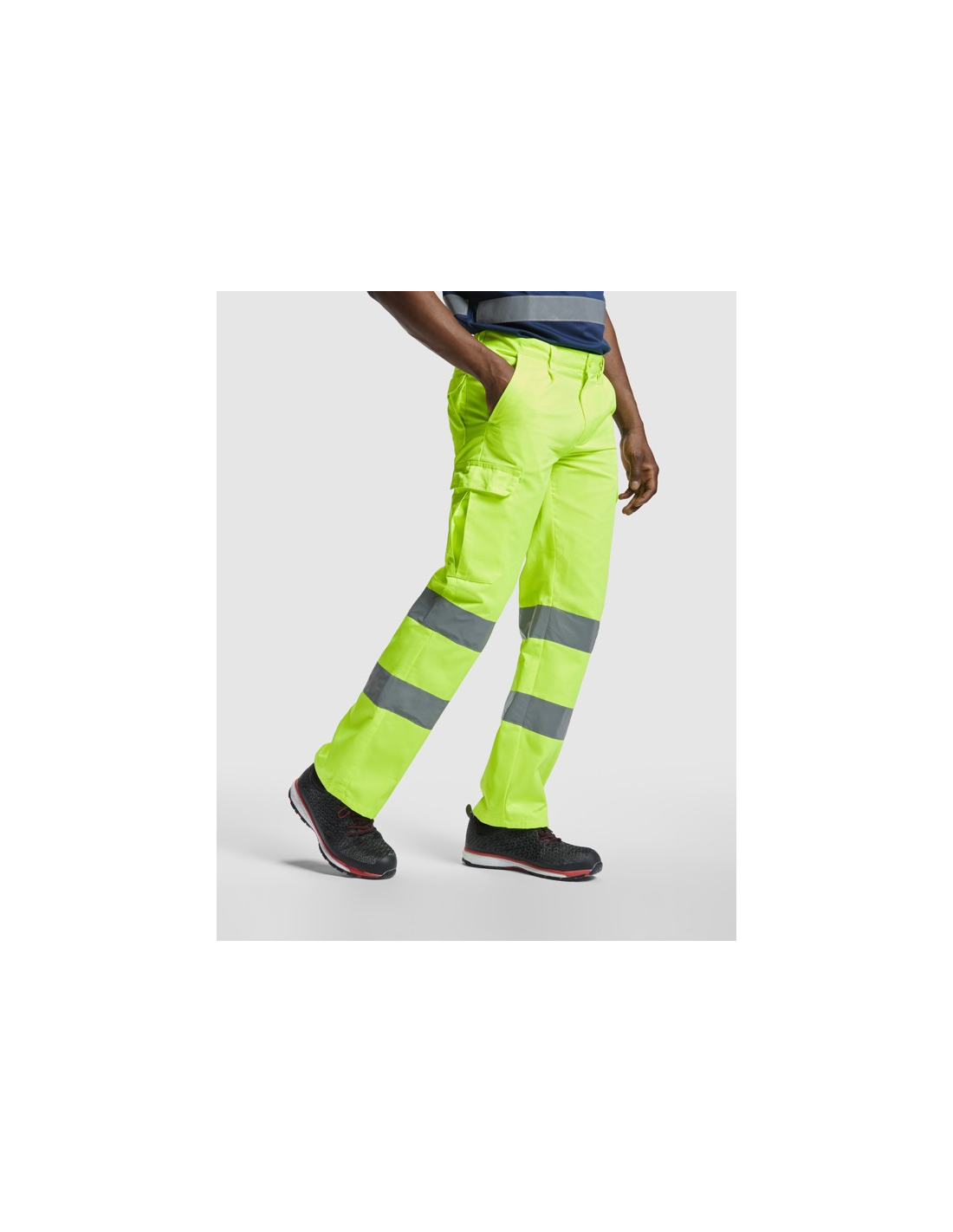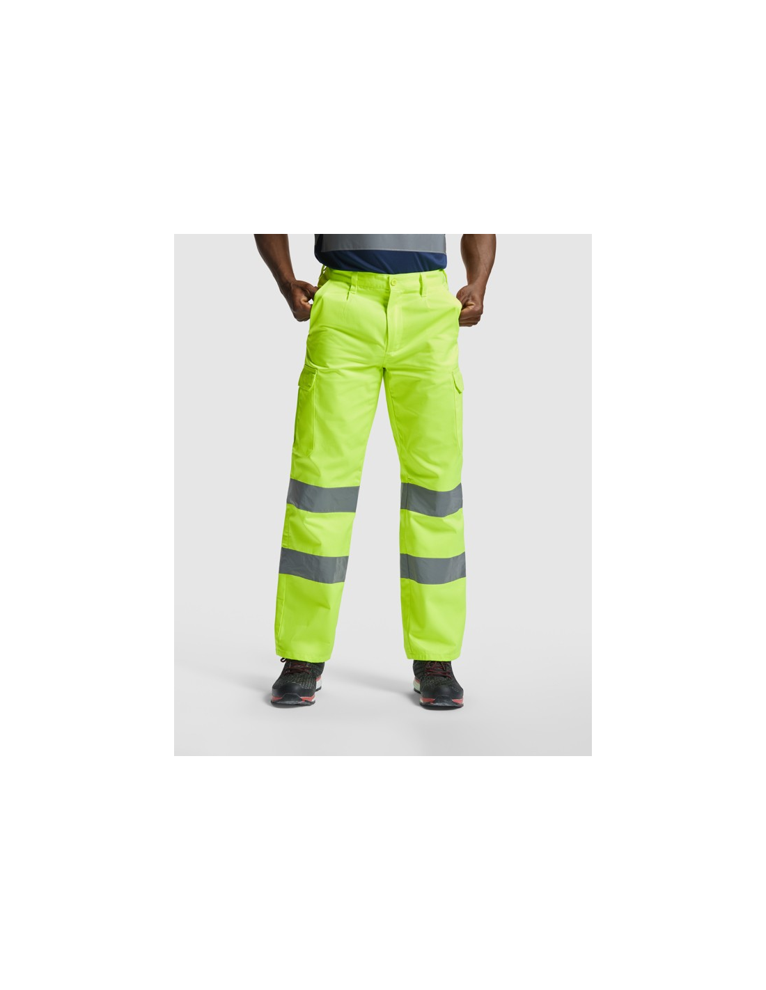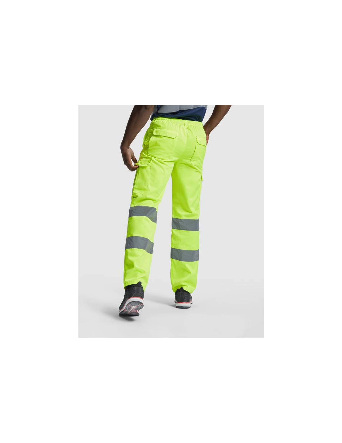 Fluorowe żółte spodnie o wysokiej widzialności. · Regulowana, elastyczna talia z tyłu. · Dwie kieszenie przednie. · Dwie tylne kieszenie z klapką i zapięciem na rzep. · Dwie kieszenie boczne z klinem i klapą zapinaną na rzep. · Dwie poziome taśmy odblaskowe.