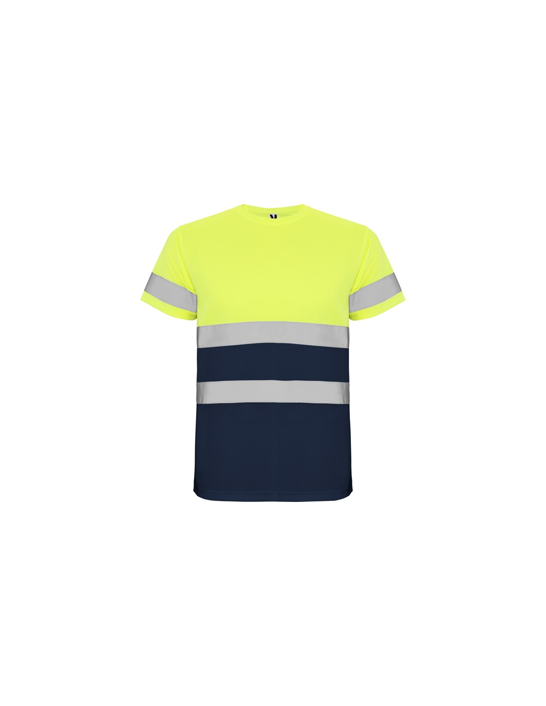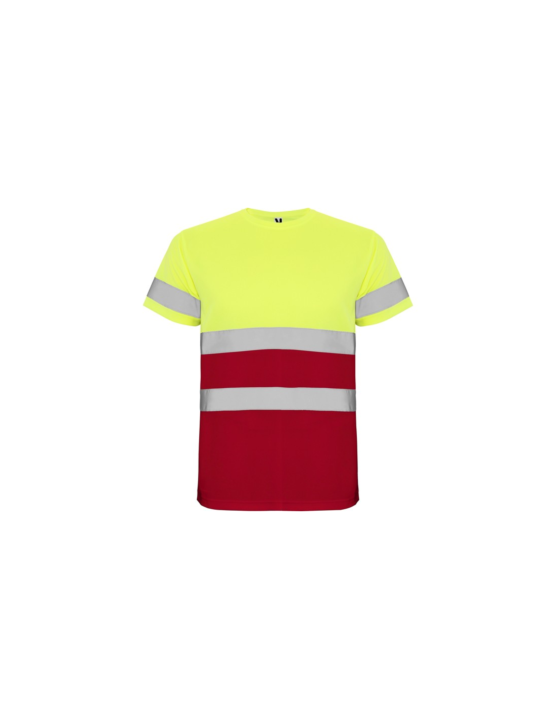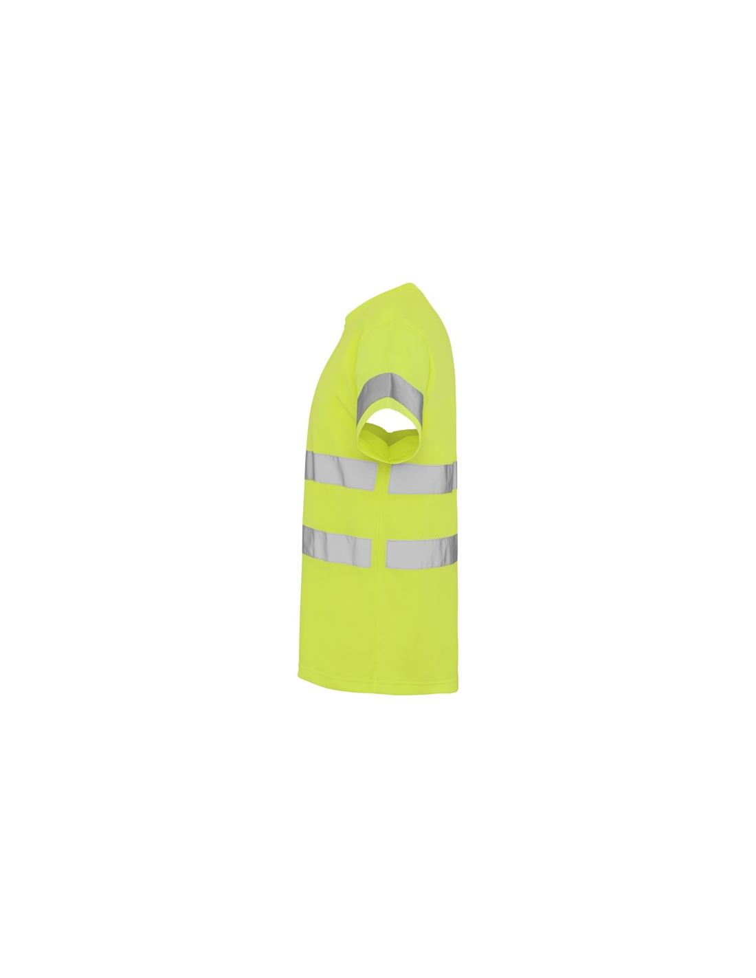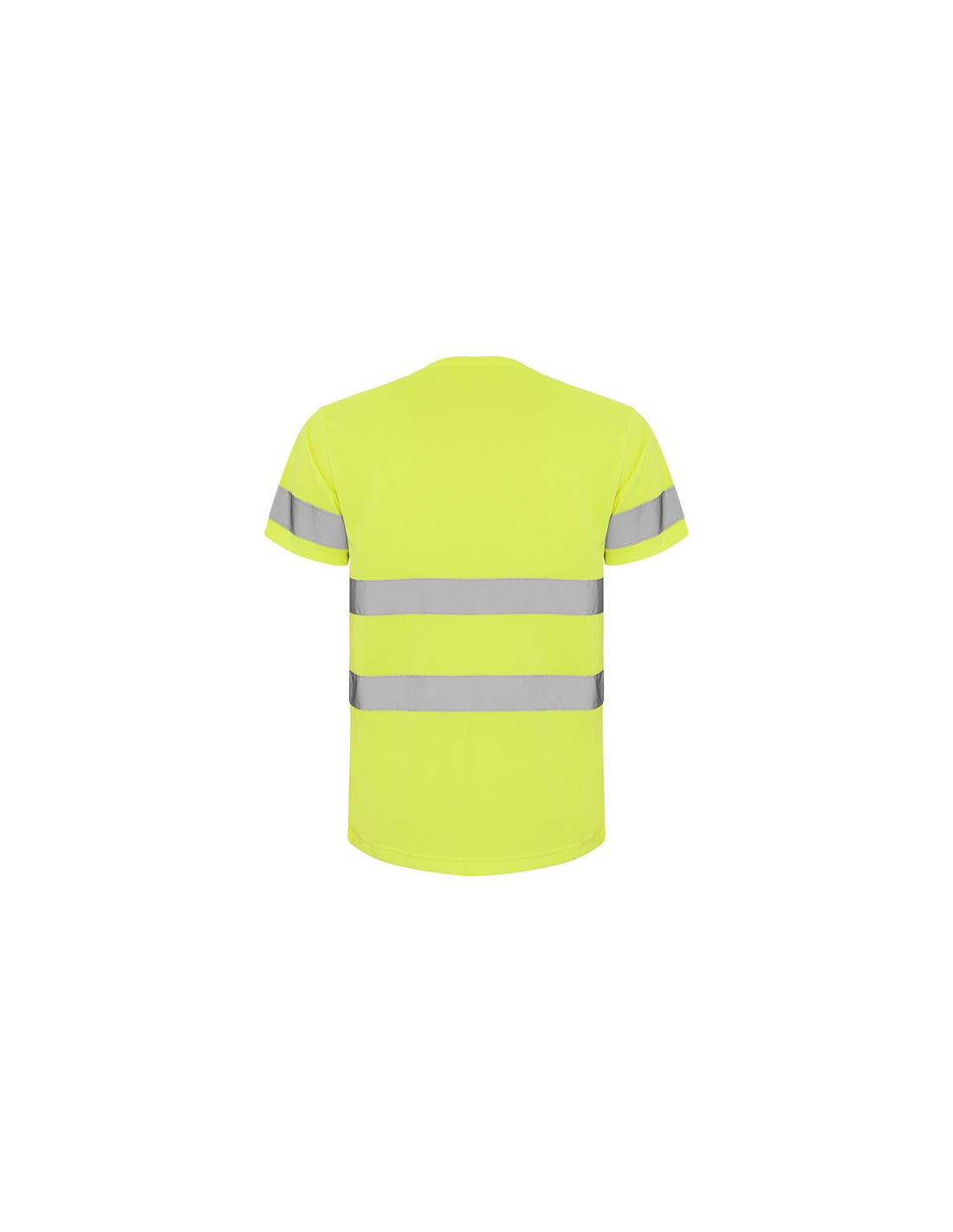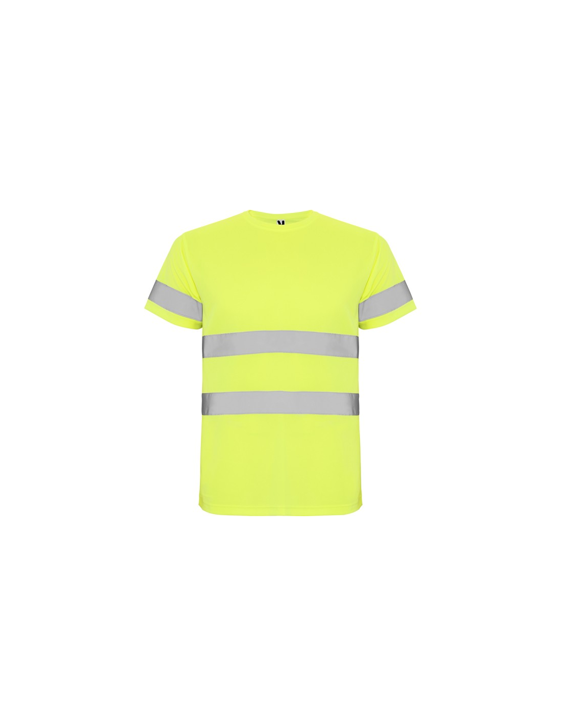 Techniczna koszulka o wysokiej widzialności z krótkim rękawem. · Okrągły kołnierz z tego samego materiału, ze wzmocnioną osłoną szwów po wewnętrznej stronie szyi. · Dwie poziome taśmy odblaskowe na tułowiu i jedna na rękawach.