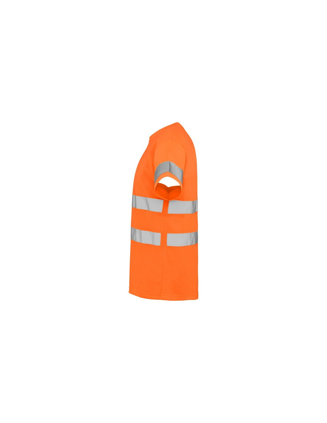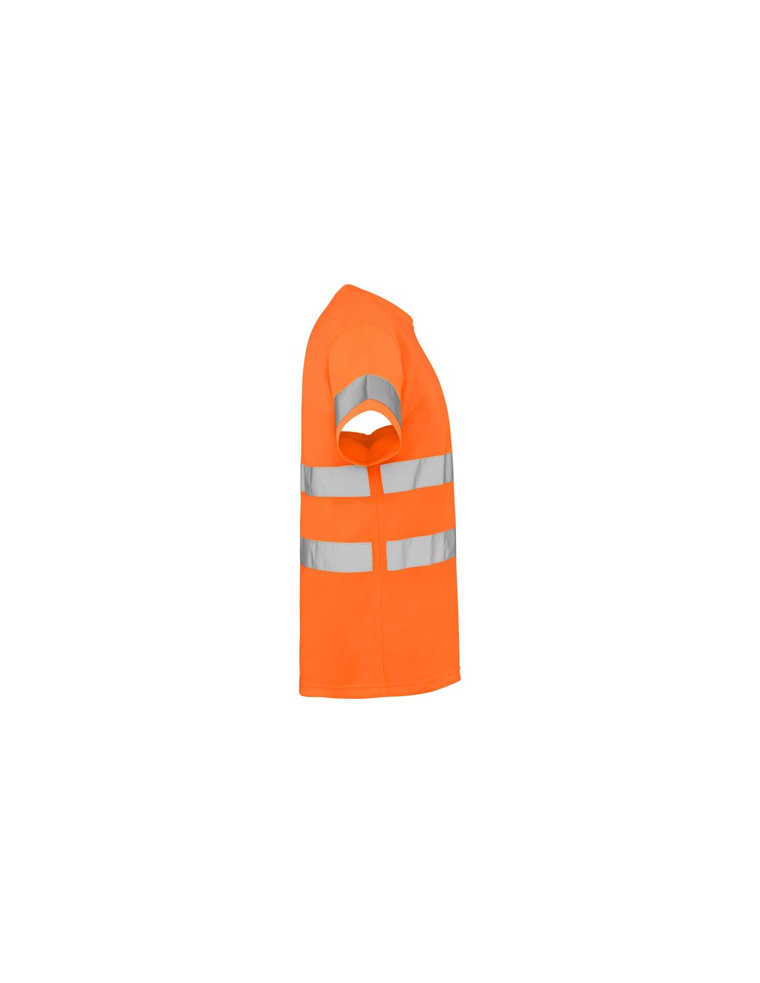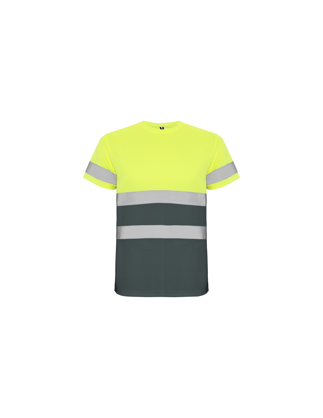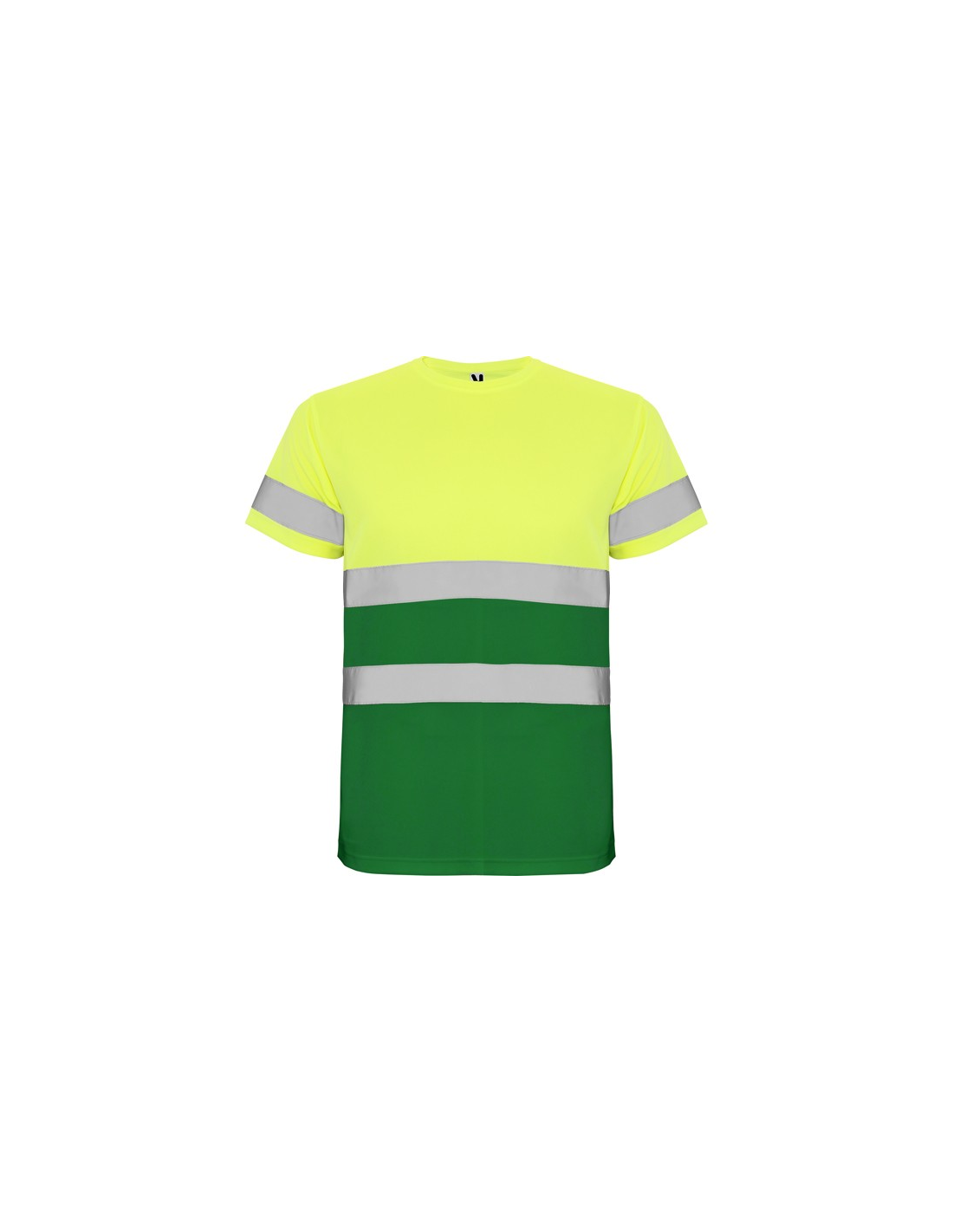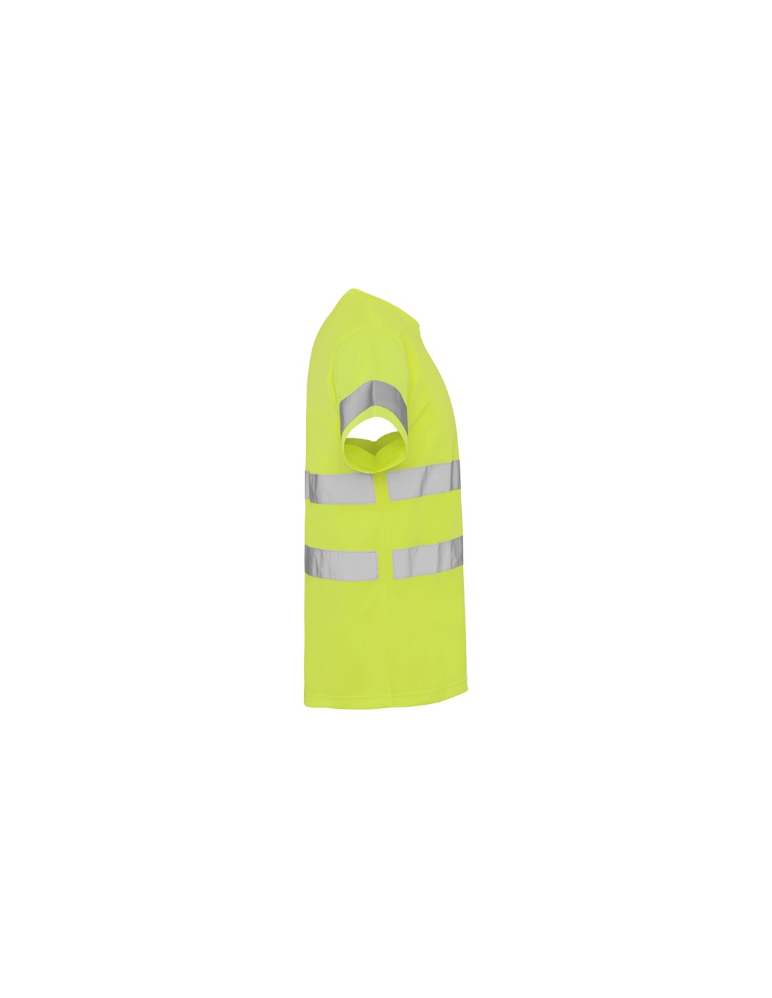 Techniczna koszulka o wysokiej widzialności z krótkim rękawem. · Okrągły kołnierz z tego samego materiału, ze wzmocnioną osłoną szwów po wewnętrznej stronie szyi. · Dwie poziome taśmy odblaskowe na tułowiu i jedna na rękawach.