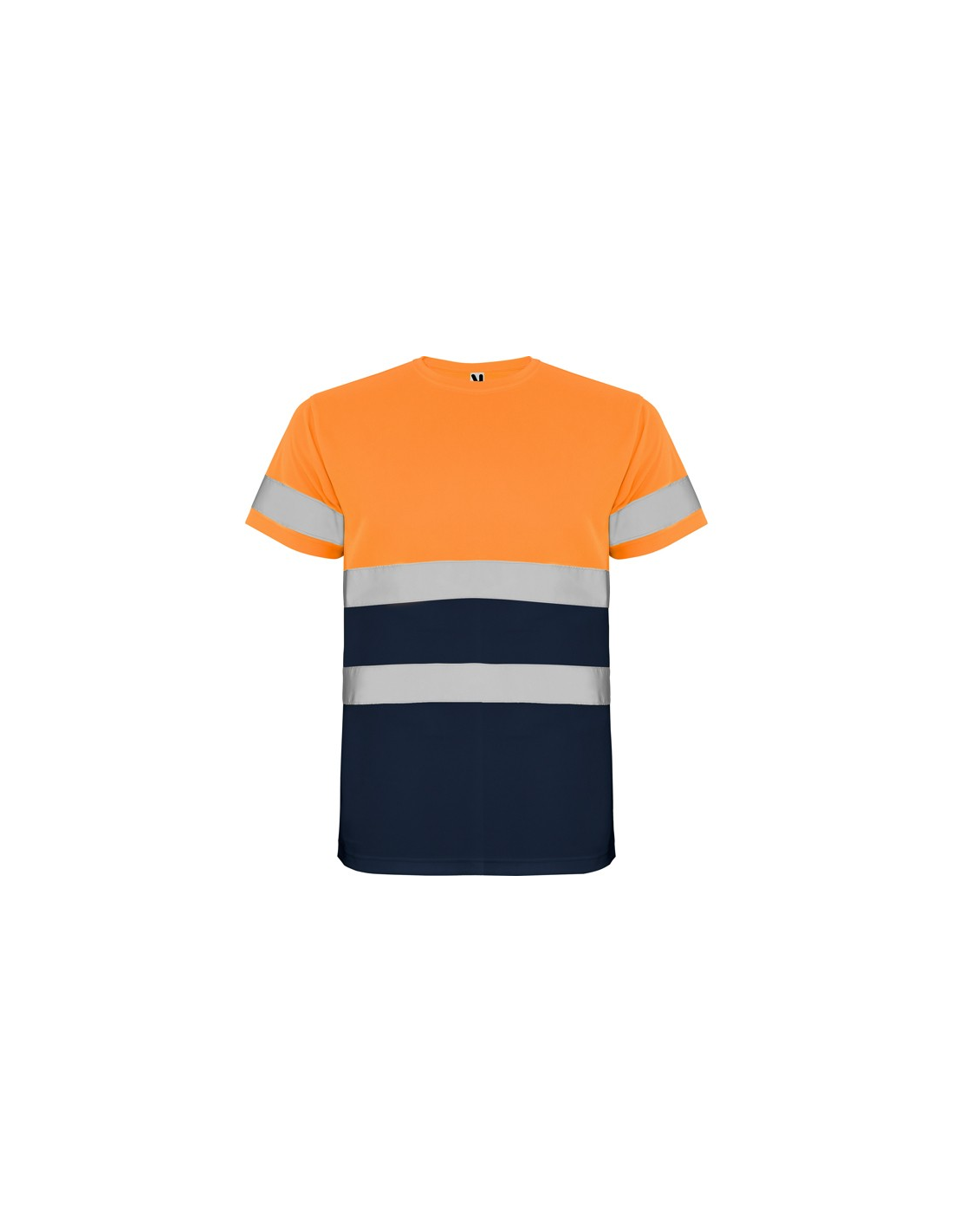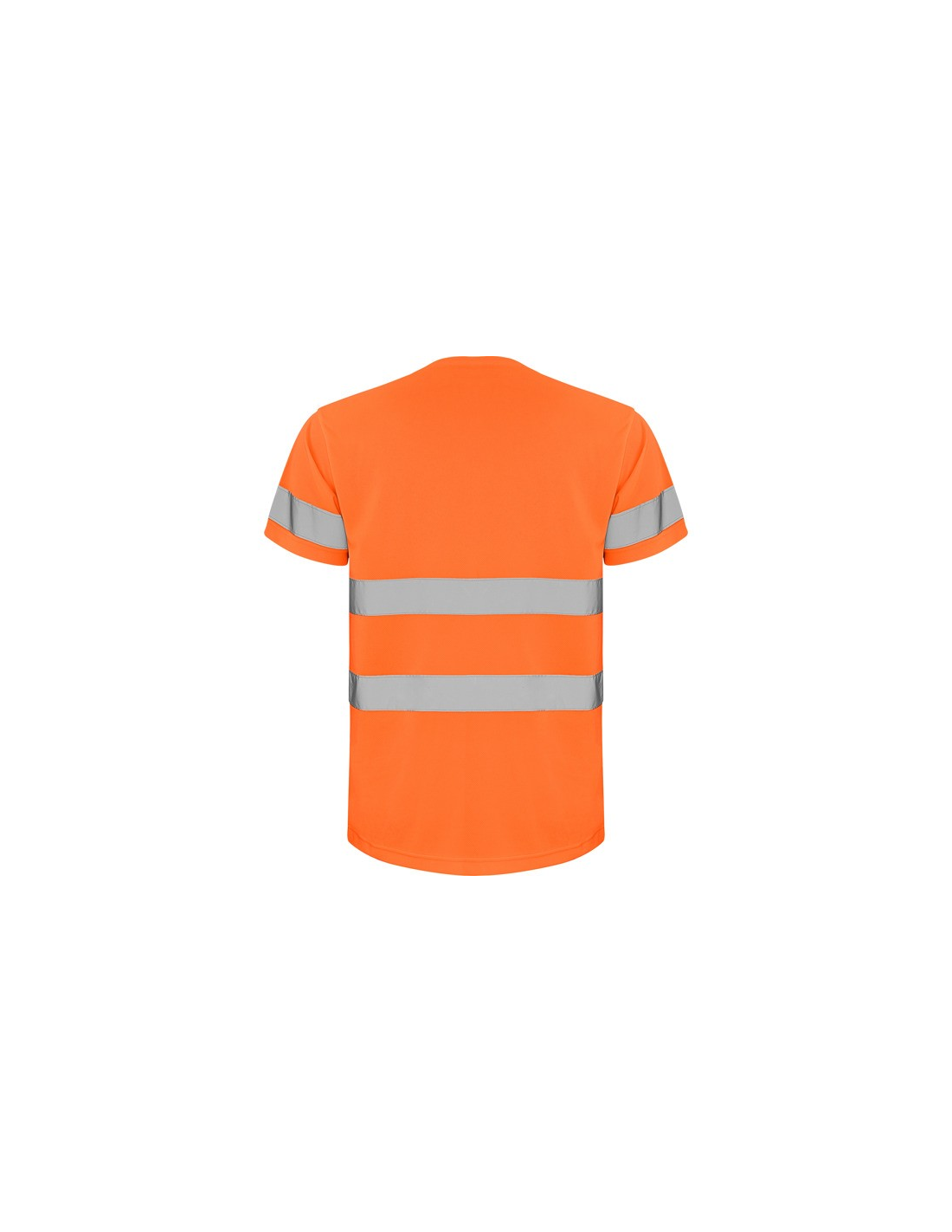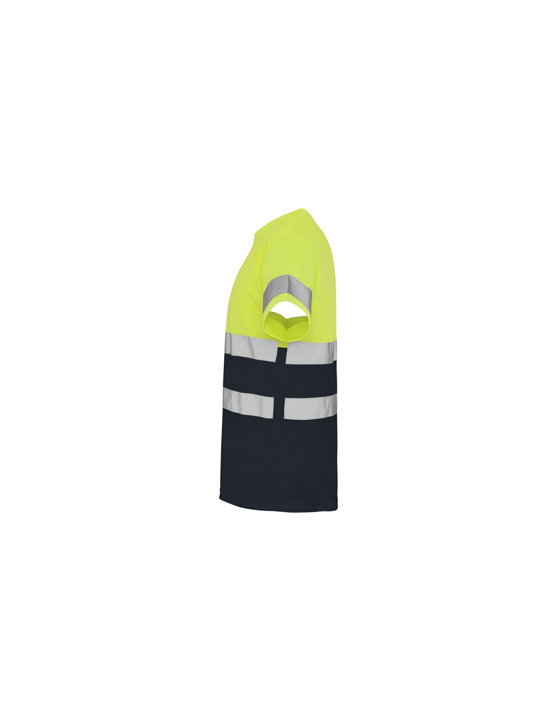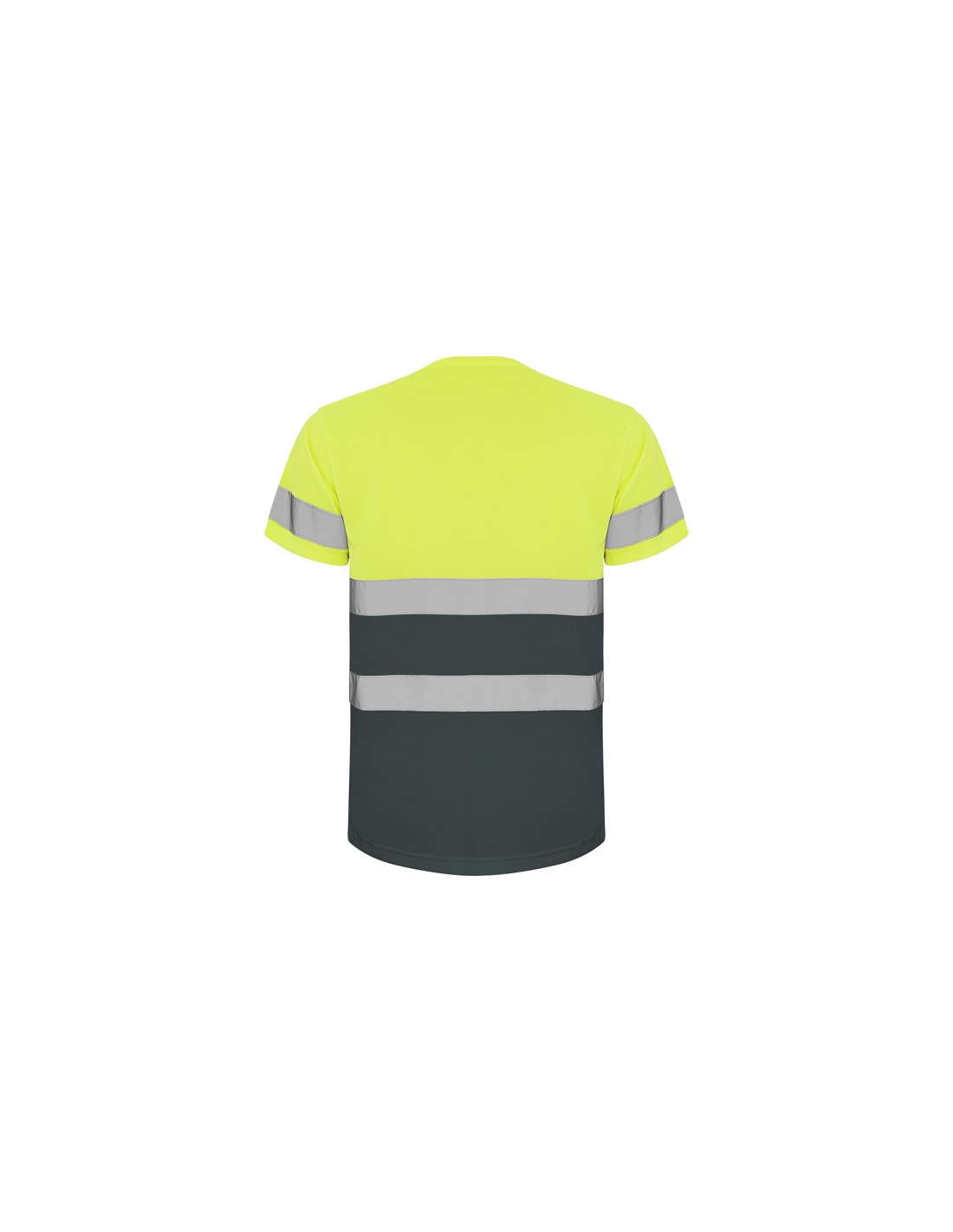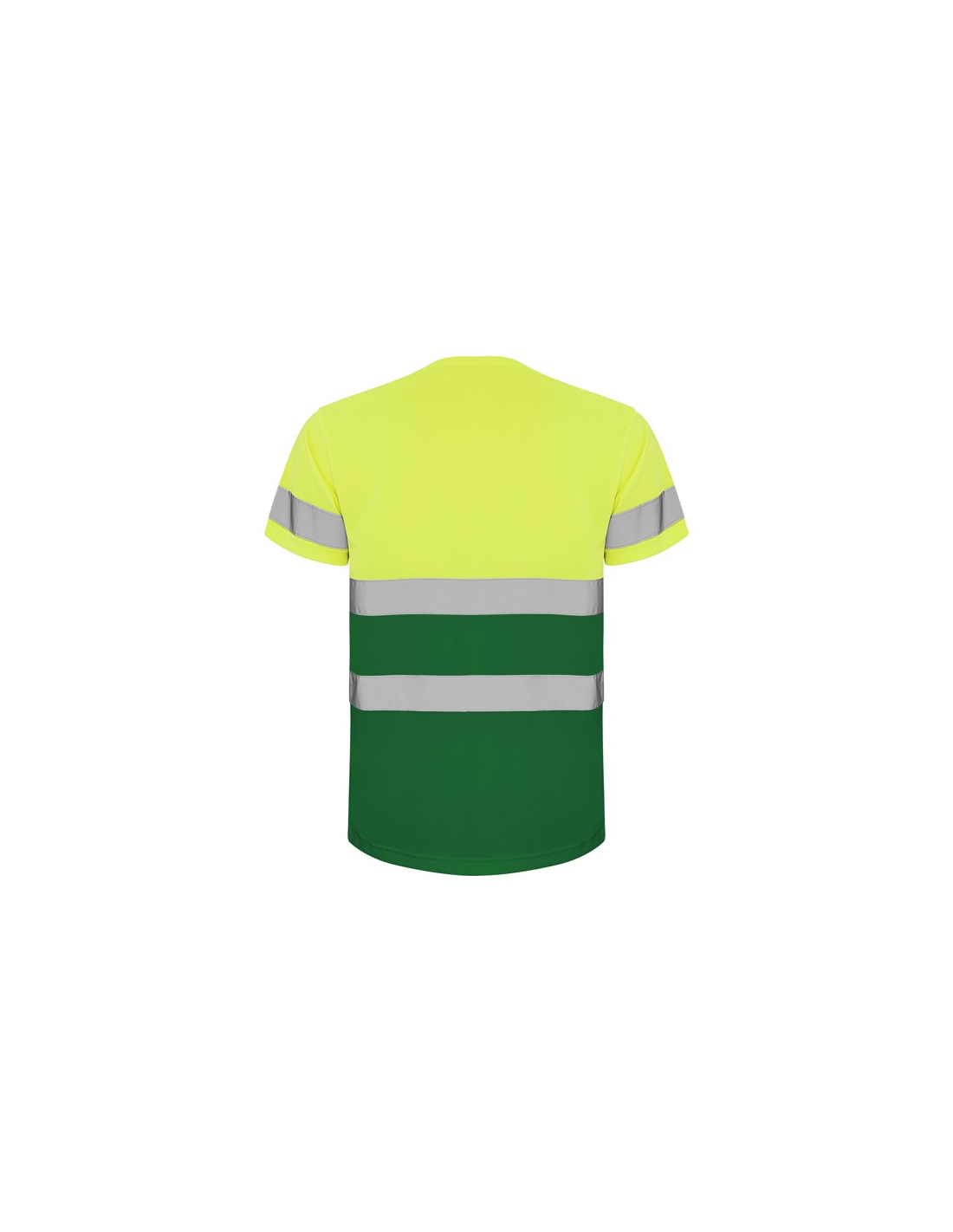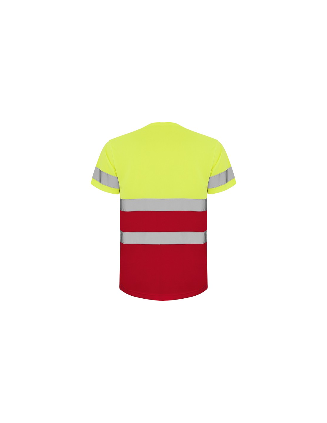 Techniczna koszulka o wysokiej widzialności z krótkim rękawem. · Okrągły kołnierz z tego samego materiału, ze wzmocnioną osłoną szwów po wewnętrznej stronie szyi. · Dwie poziome taśmy odblaskowe na tułowiu i jedna na rękawach.