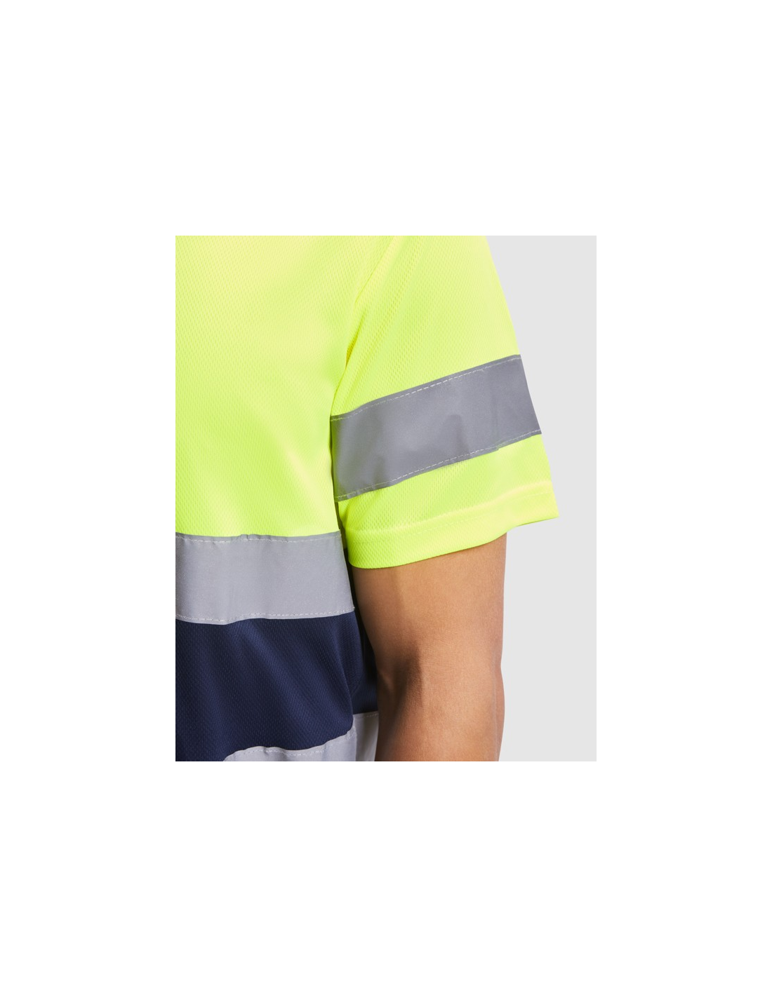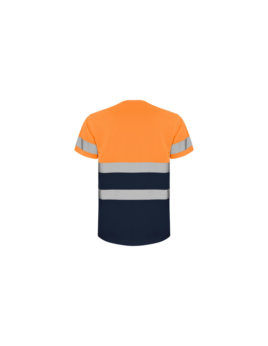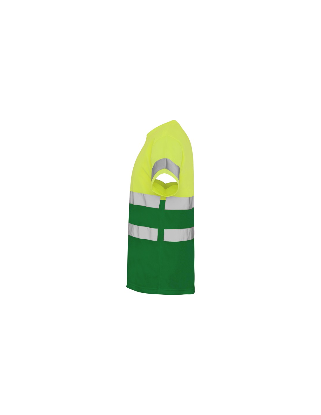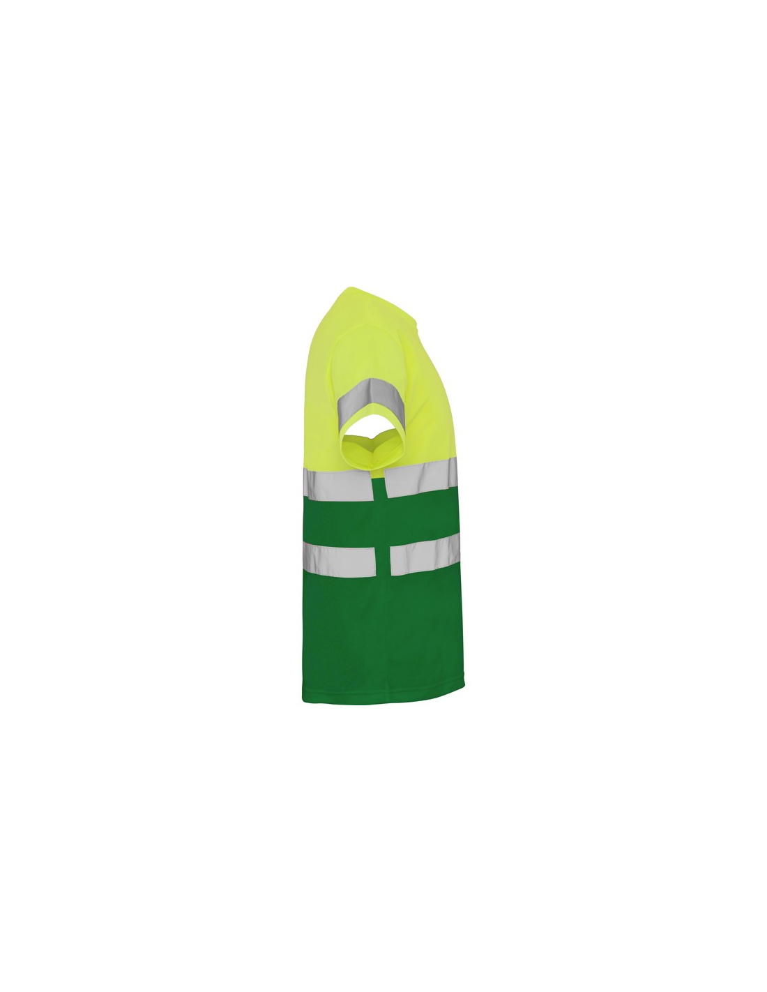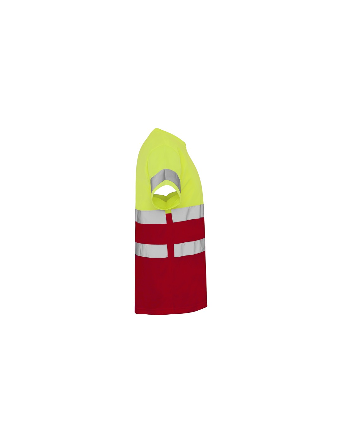 Techniczna koszulka o wysokiej widzialności z krótkim rękawem. · Okrągły kołnierz z tego samego materiału, ze wzmocnioną osłoną szwów po wewnętrznej stronie szyi. · Dwie poziome taśmy odblaskowe na tułowiu i jedna na rękawach.