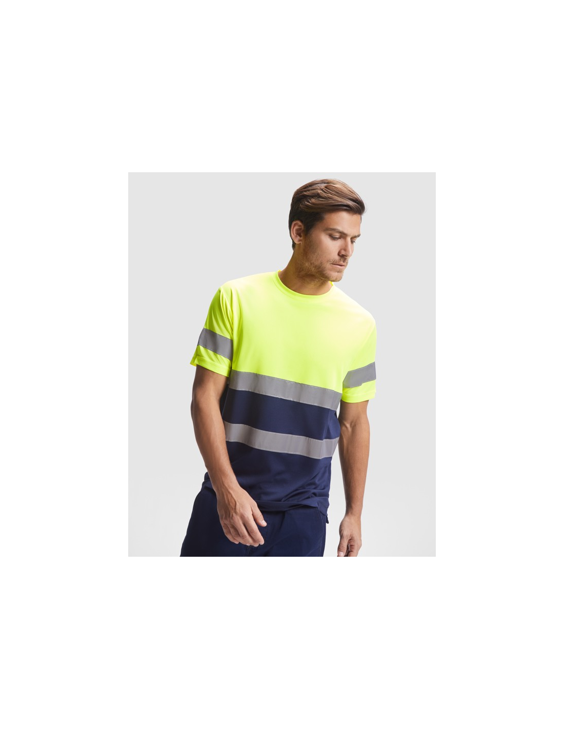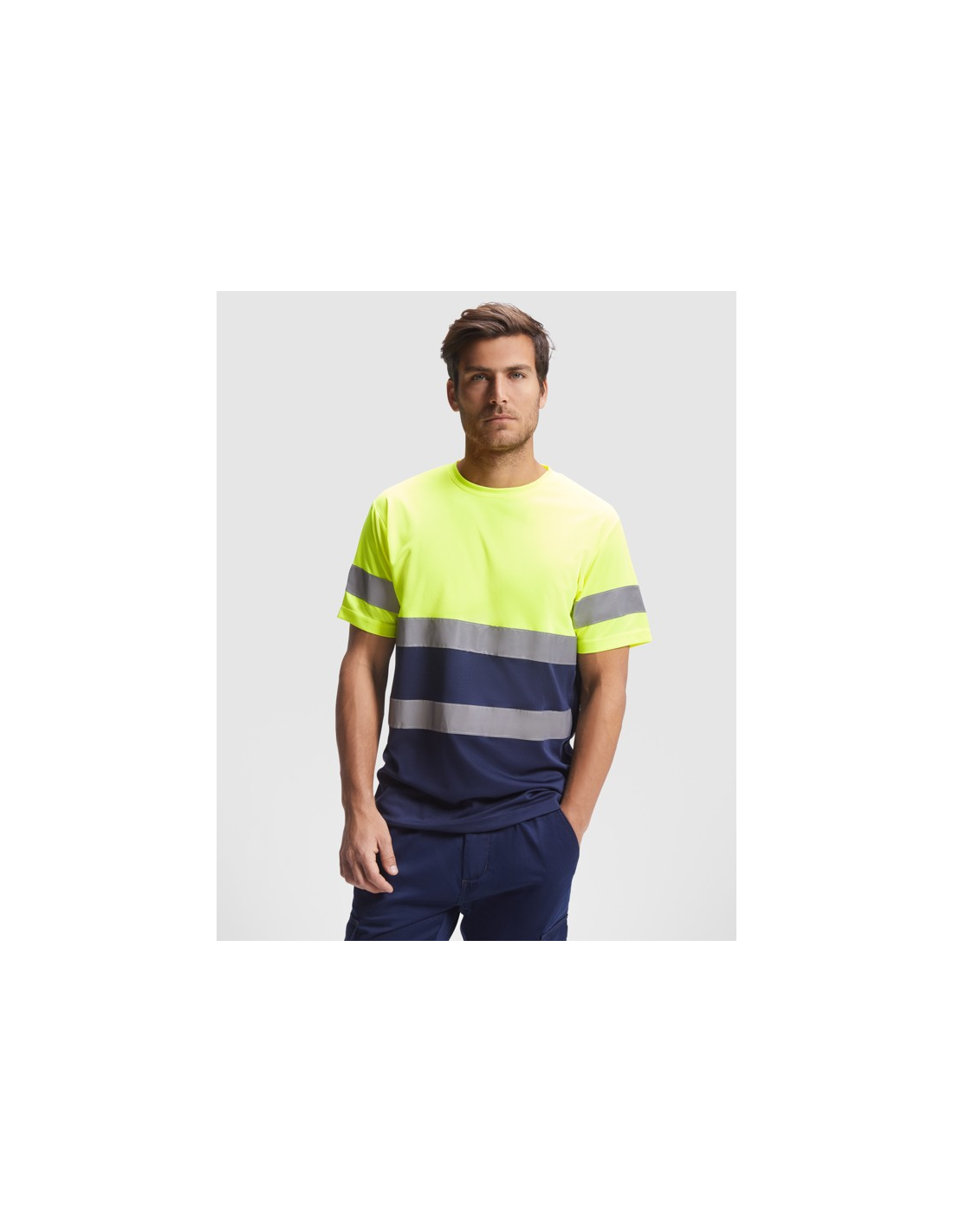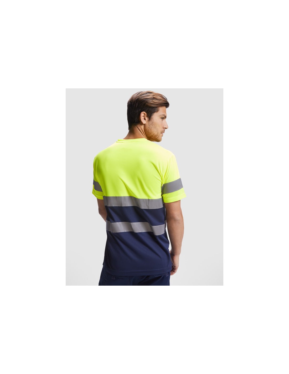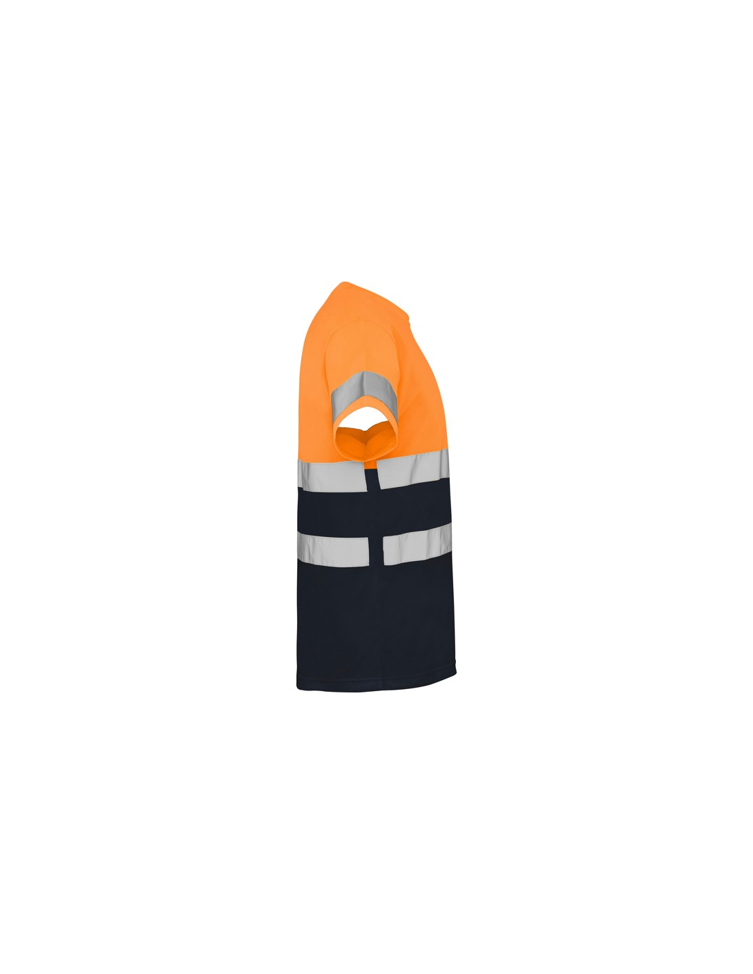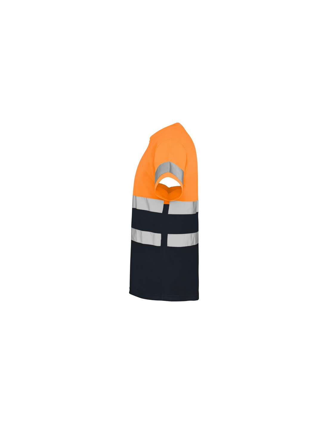 Techniczna koszulka o wysokiej widzialności z krótkim rękawem. · Okrągły kołnierz z tego samego materiału, ze wzmocnioną osłoną szwów po wewnętrznej stronie szyi. · Dwie poziome taśmy odblaskowe na tułowiu i jedna na rękawach.