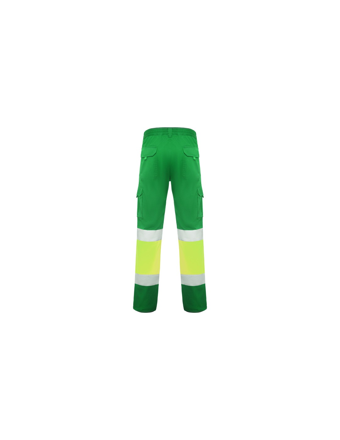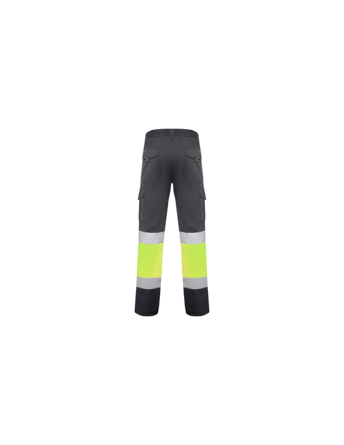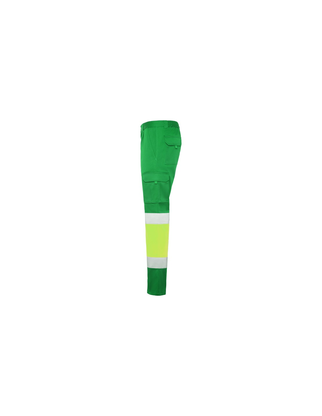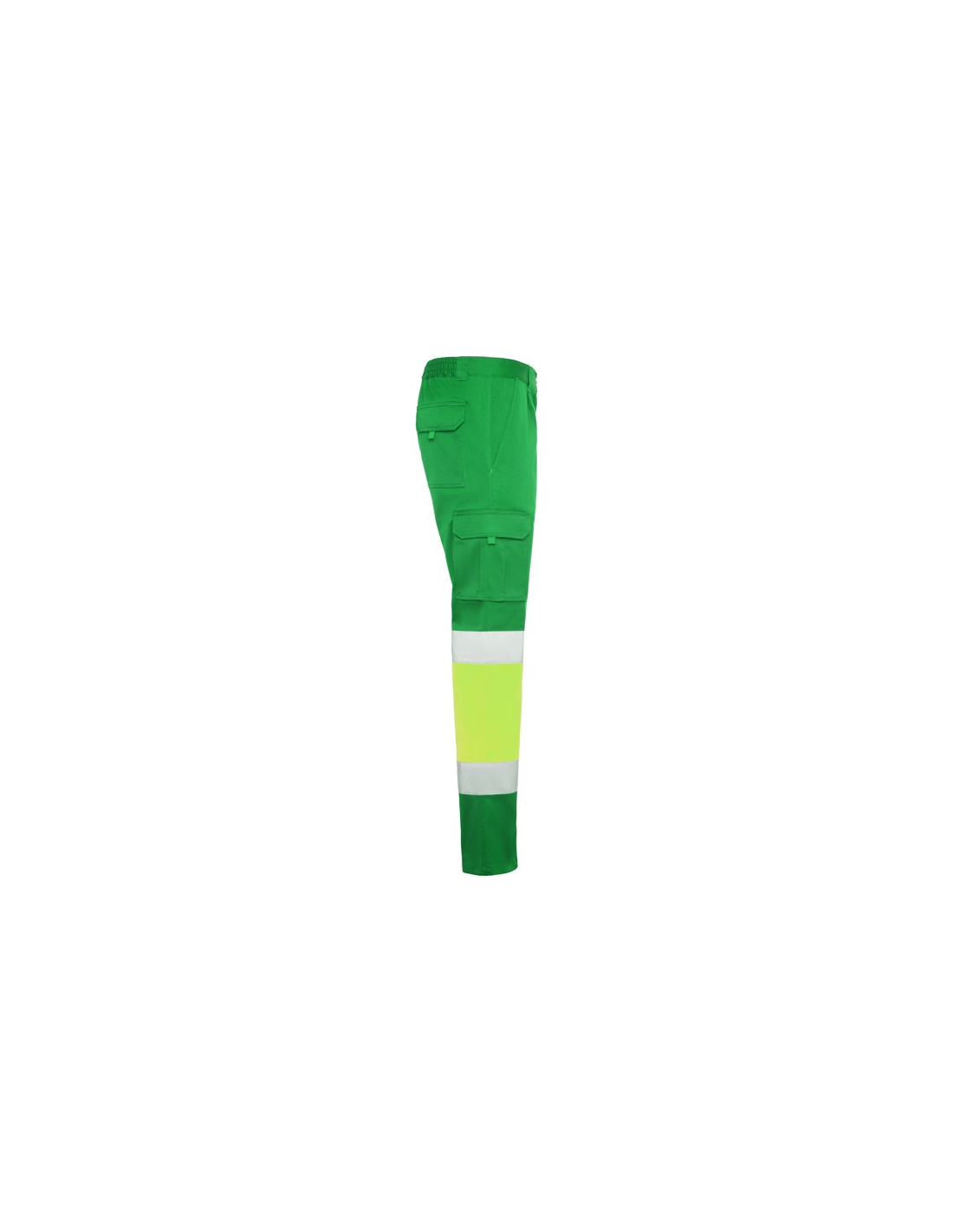 Długie spodnie z wieloma kieszeniami, widoczne z daleka. · Elastyczny i wygodny materiał. · Elastyczne w pasie z regulacją z tyłu. · Dwie kieszenie przednie. · Dwie kieszenie tylne z klapą i zapięciem na rzep. · Dwie kieszenie boczne z mieszkiem i klapą i zapięciem na rzep. · Połączenie dwóch kolorów i taśm odblaskowych.