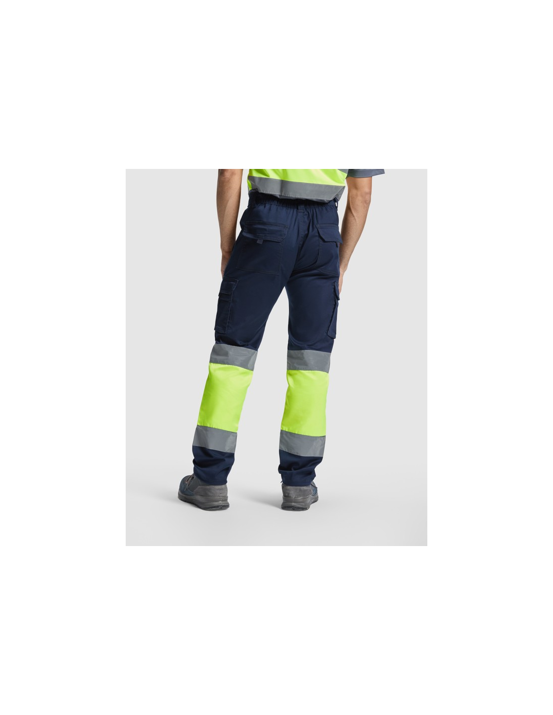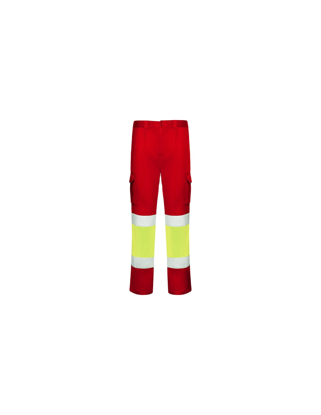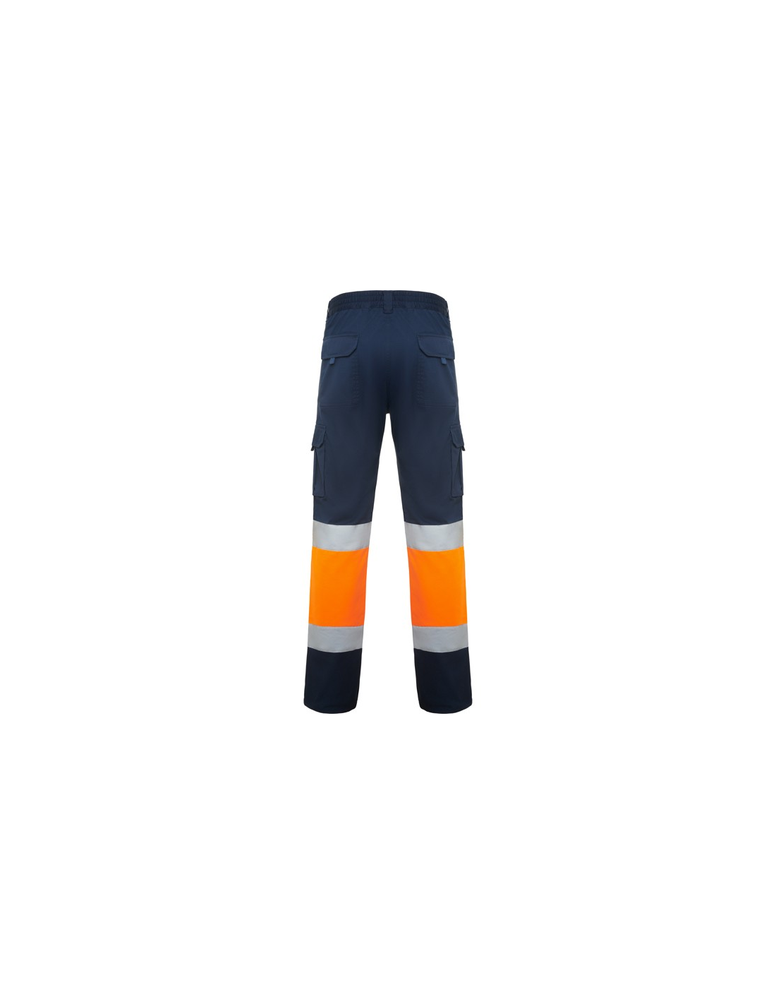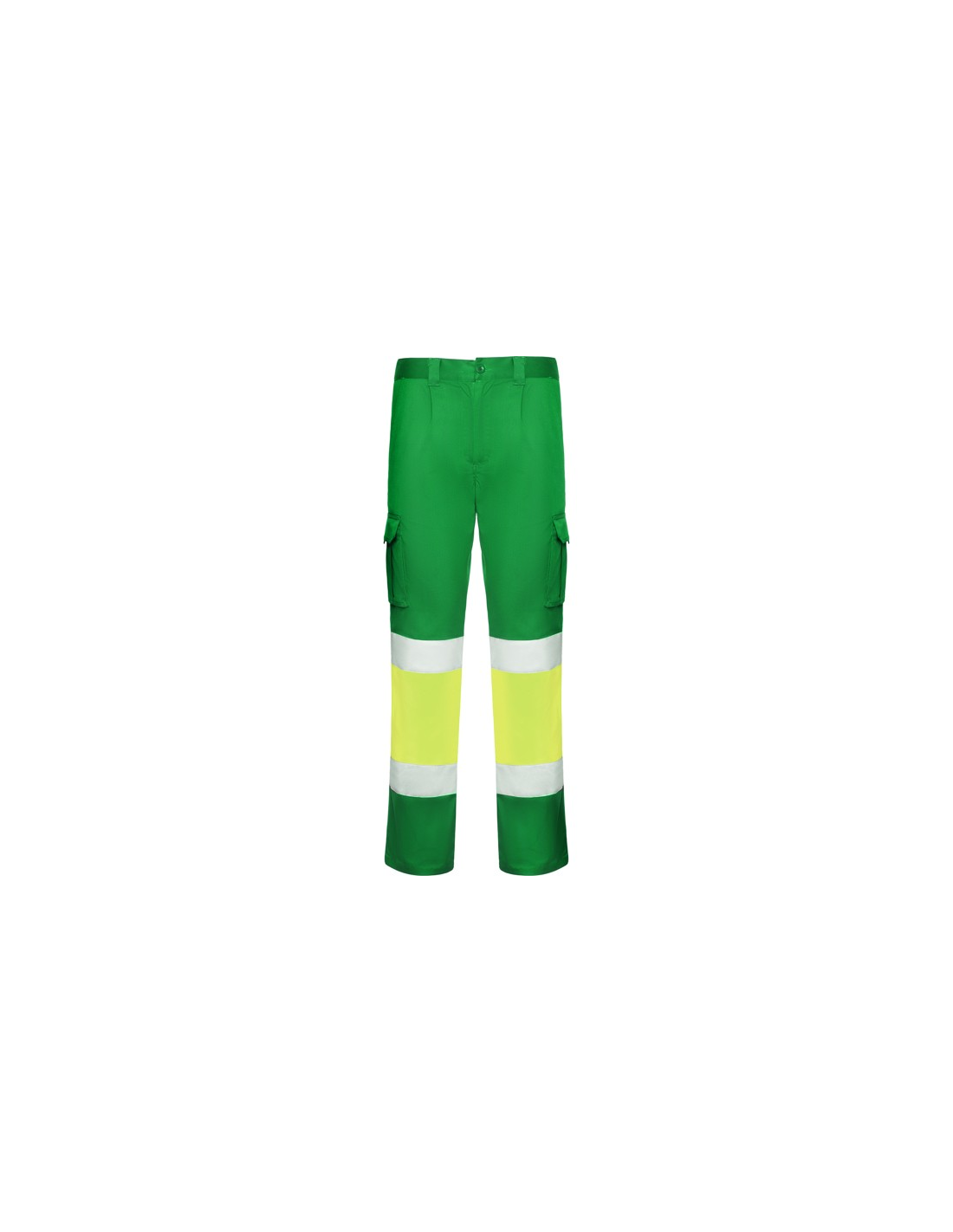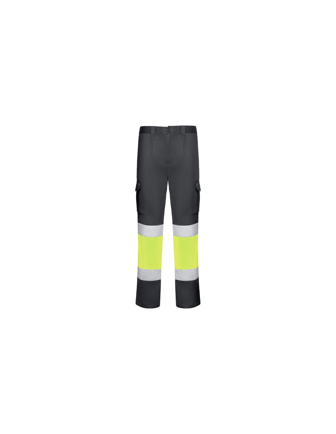 Długie spodnie z wieloma kieszeniami, widoczne z daleka. · Elastyczny i wygodny materiał. · Elastyczne w pasie z regulacją z tyłu. · Dwie kieszenie przednie. · Dwie kieszenie tylne z klapą i zapięciem na rzep. · Dwie kieszenie boczne z mieszkiem i klapą i zapięciem na rzep. · Połączenie dwóch kolorów i taśm odblaskowych.
