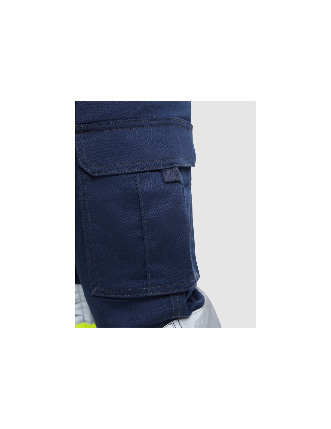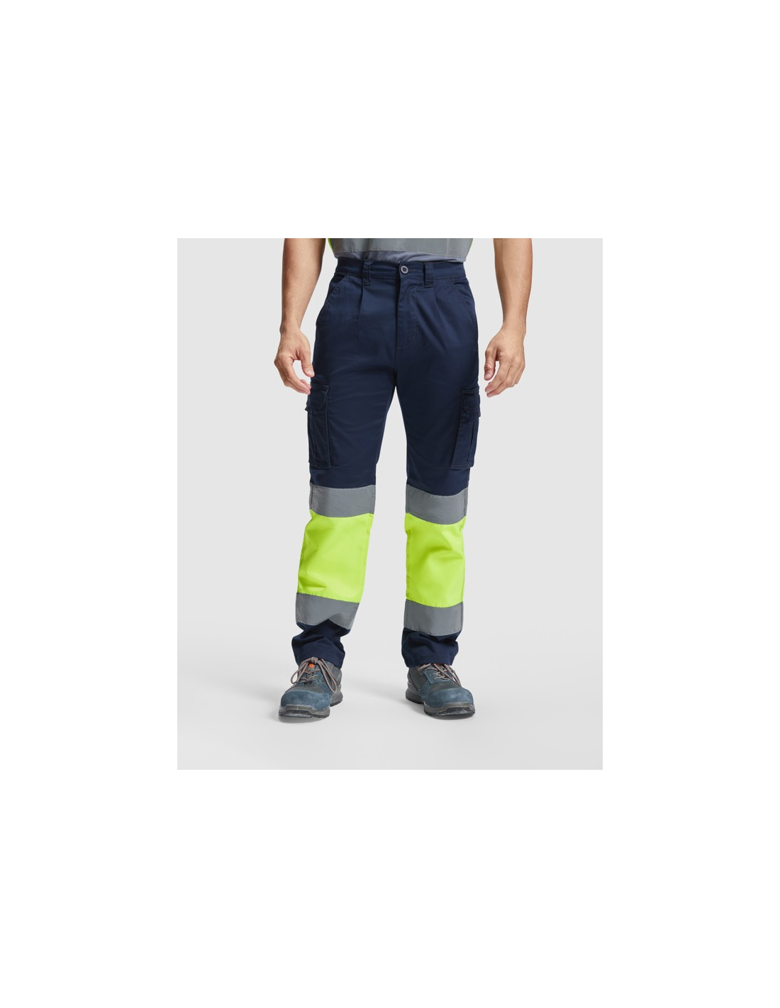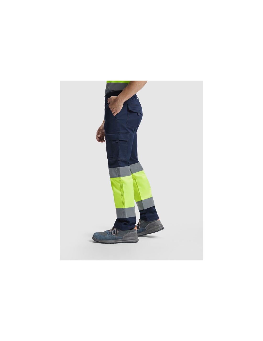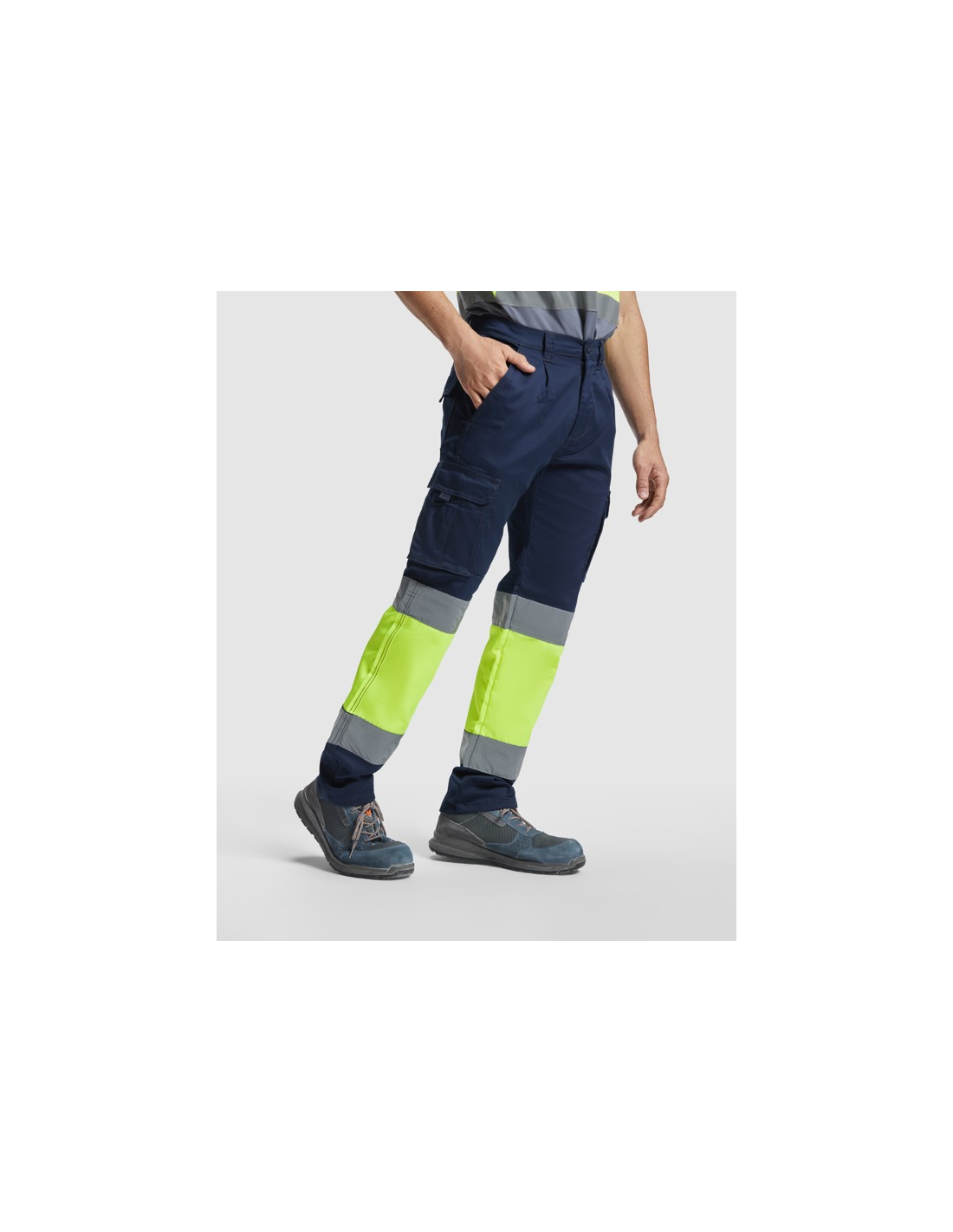 Długie spodnie z wieloma kieszeniami, widoczne z daleka. · Elastyczny i wygodny materiał. · Elastyczne w pasie z regulacją z tyłu. · Dwie kieszenie przednie. · Dwie kieszenie tylne z klapą i zapięciem na rzep. · Dwie kieszenie boczne z mieszkiem i klapą i zapięciem na rzep. · Połączenie dwóch kolorów i taśm odblaskowych.