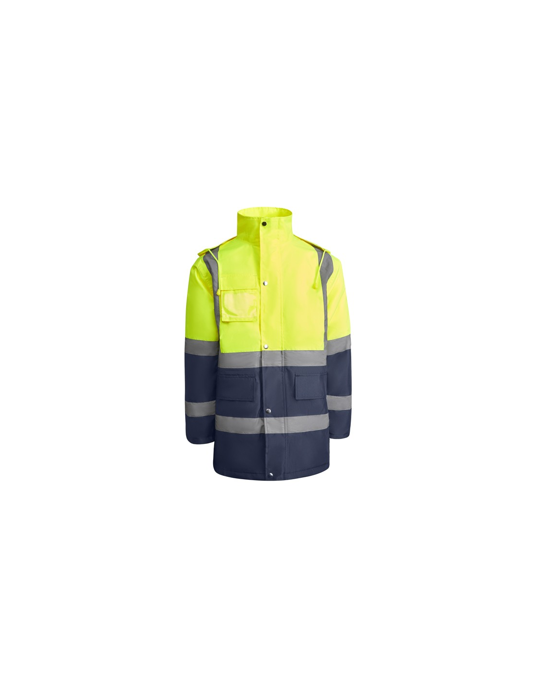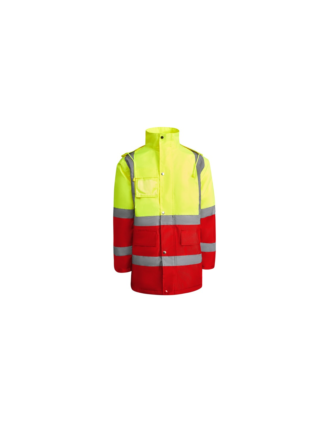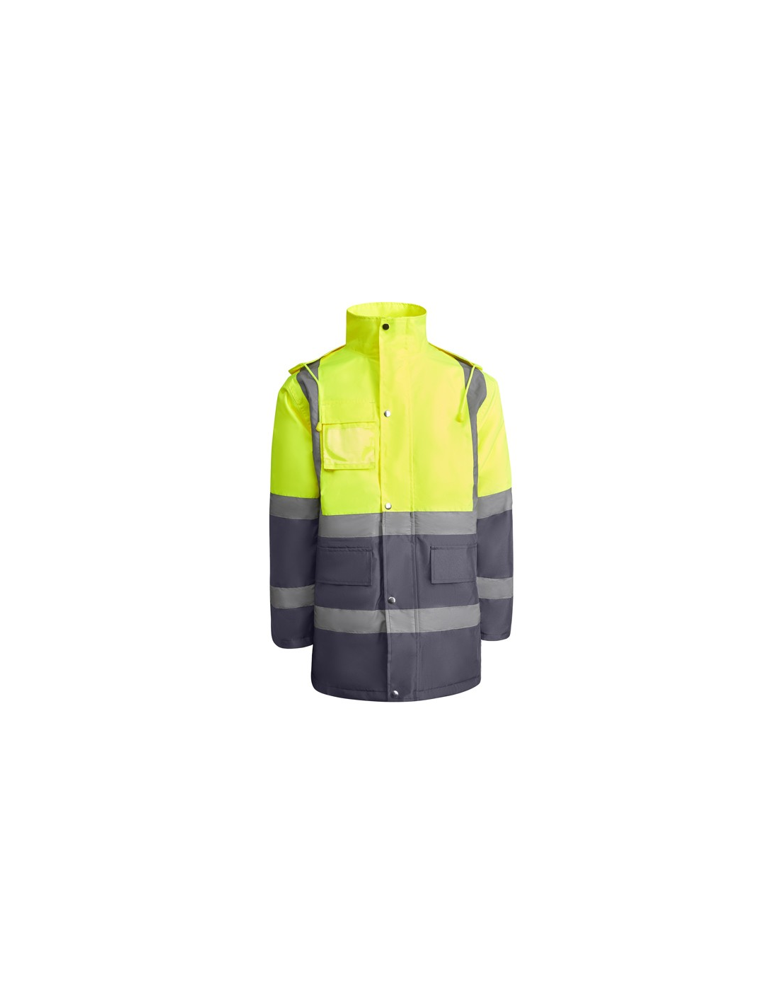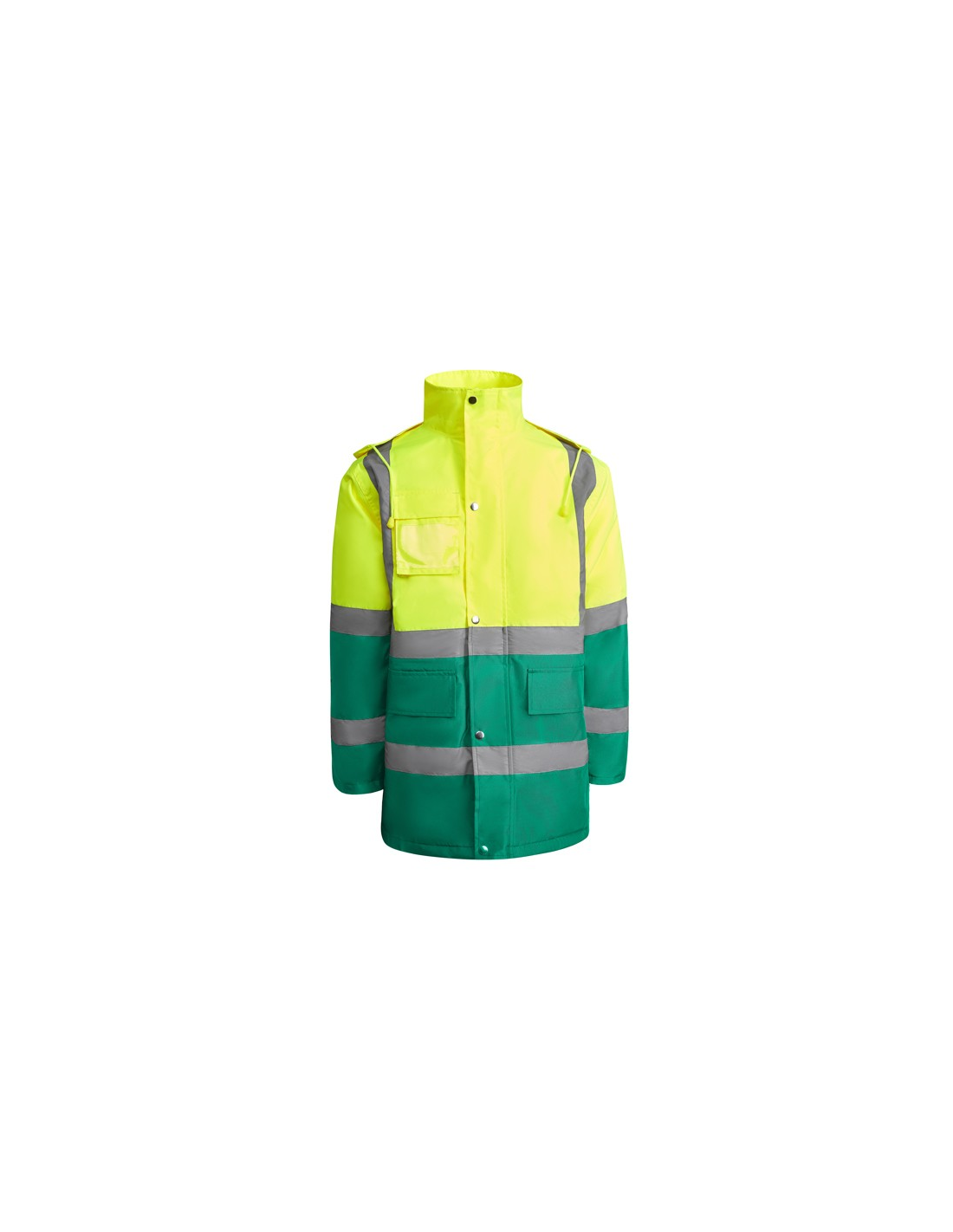 Łączona i wyściełana parka o wysokiej widoczności. · Wodoodporna tkanina z uszczelnionymi szwami. · Dwa poziome paski o wysokiej widoczności na klatce piersiowej i rękawach oraz pionowe paski na ramionach. · Składany kaptur ze ściągaczem do regulacji. · Kieszeń na piersi z klapką, zapięciem na rzepem i identyfikatorem. · Dwie przednie kieszenie z klapkami. · Wewnętrzna kieszeń z zapięciem na zamek błyskawiczny. · Ukryte mankiety ze ściągaczem 1x1. · Przednie rozcięcie z zapięciem na metalowe guziki z podwójnym zamkiem błyskawicznym z przodu. · Wewnętrzny dostęp do sitodruku.