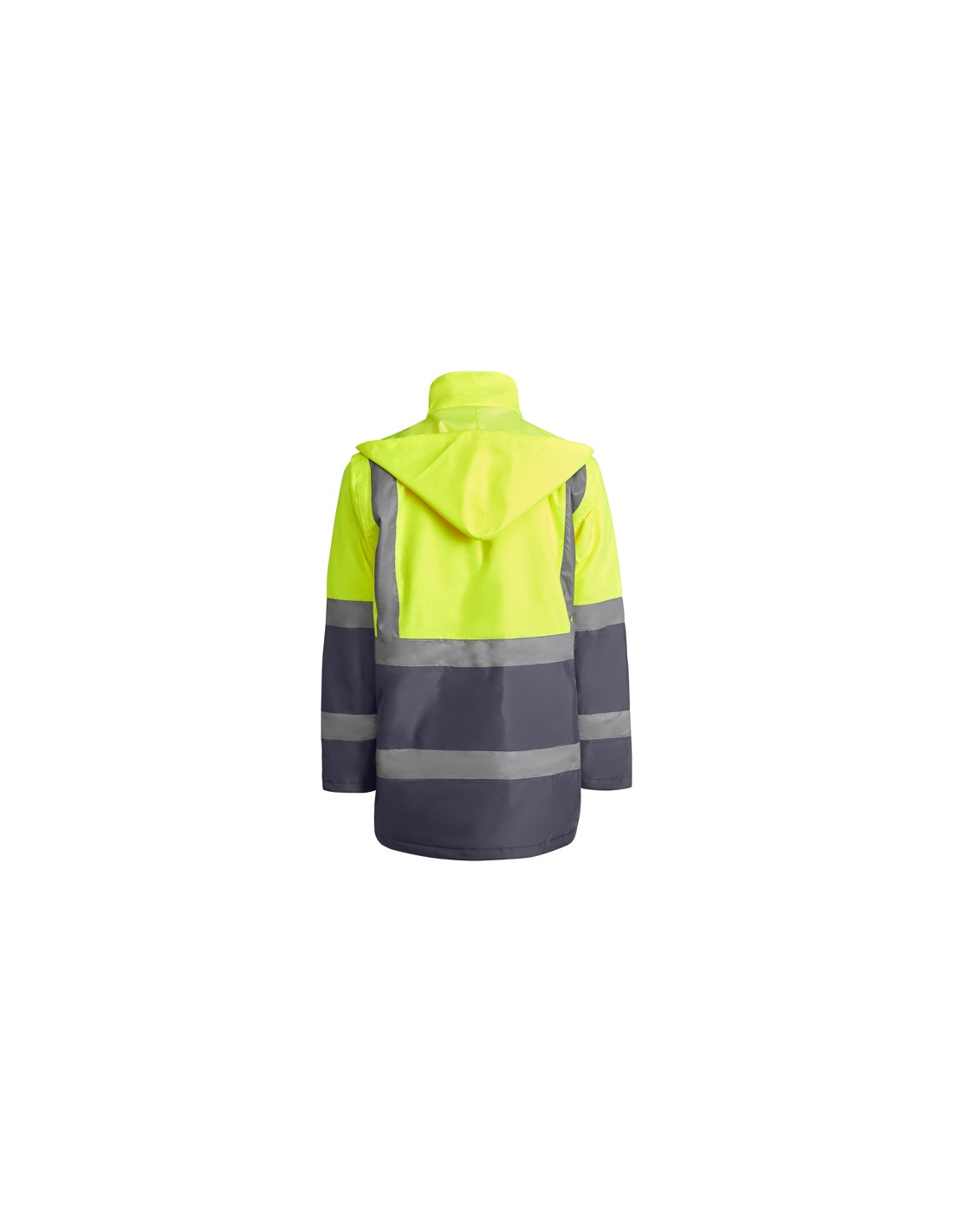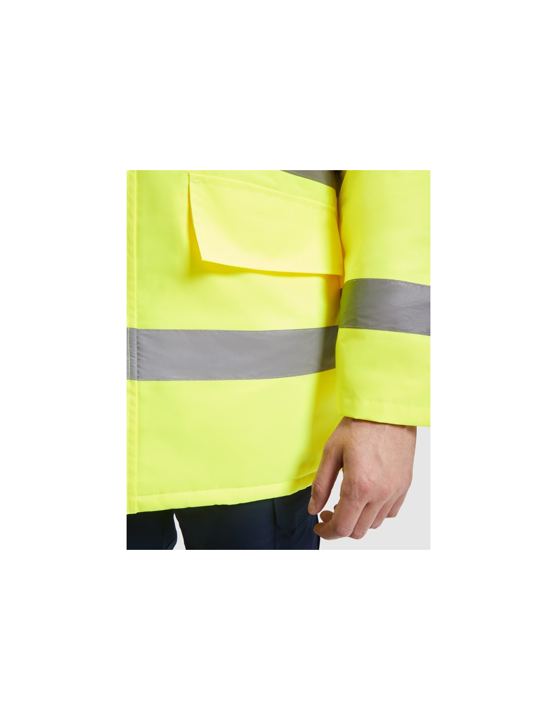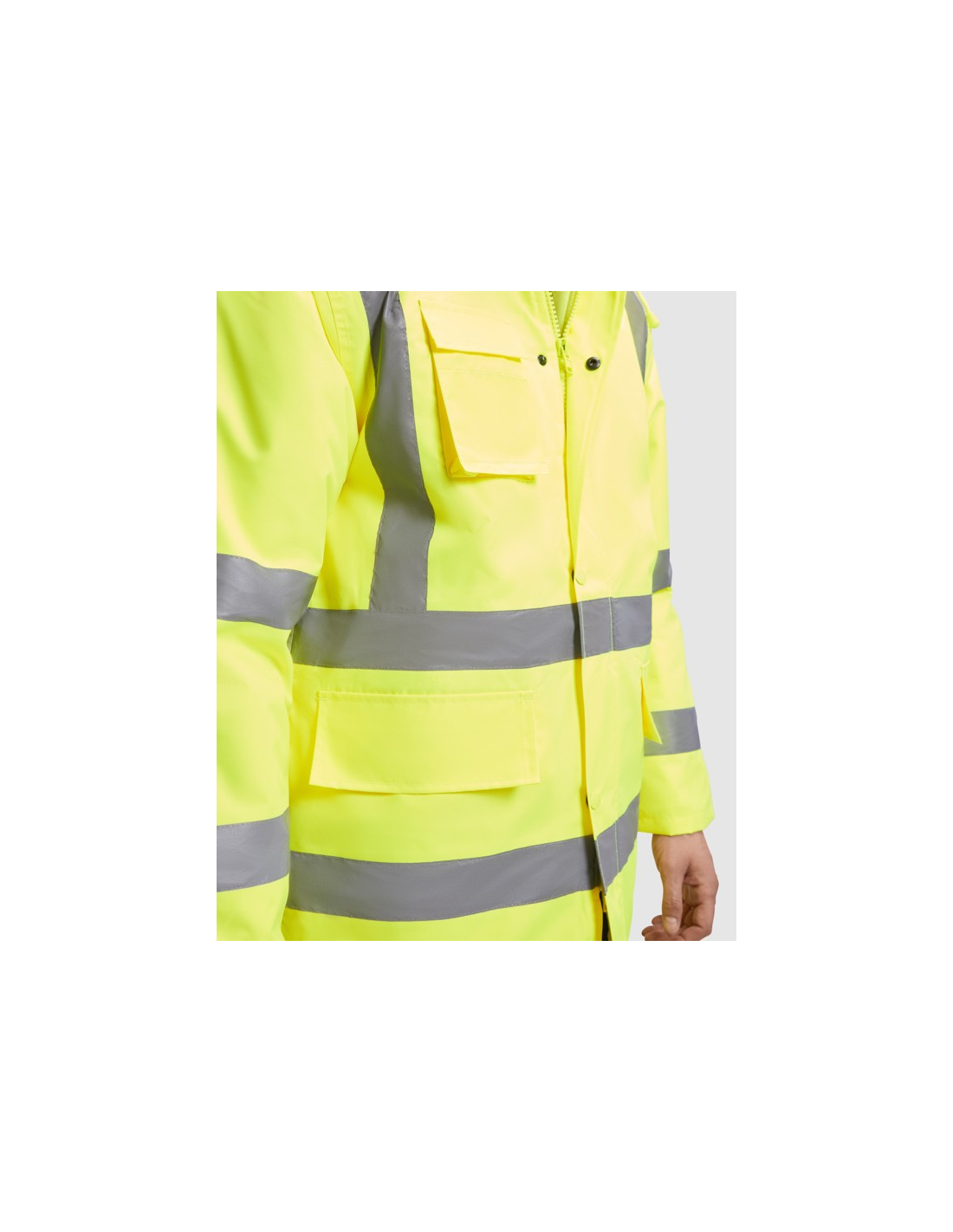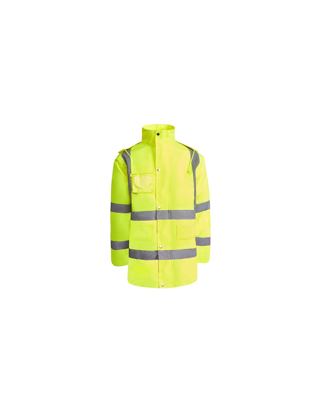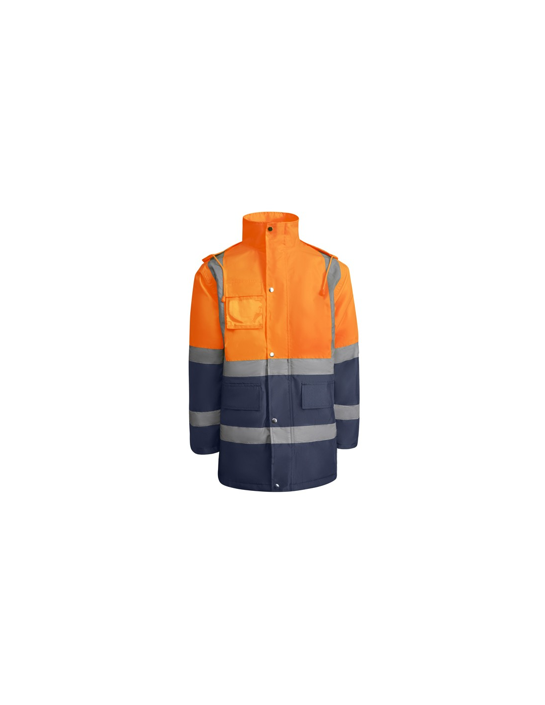 Łączona i wyściełana parka o wysokiej widoczności. · Wodoodporna tkanina z uszczelnionymi szwami. · Dwa poziome paski o wysokiej widoczności na klatce piersiowej i rękawach oraz pionowe paski na ramionach. · Składany kaptur ze ściągaczem do regulacji. · Kieszeń na piersi z klapką, zapięciem na rzepem i identyfikatorem. · Dwie przednie kieszenie z klapkami. · Wewnętrzna kieszeń z zapięciem na zamek błyskawiczny. · Ukryte mankiety ze ściągaczem 1x1. · Przednie rozcięcie z zapięciem na metalowe guziki z podwójnym zamkiem błyskawicznym z przodu. · Wewnętrzny dostęp do sitodruku.