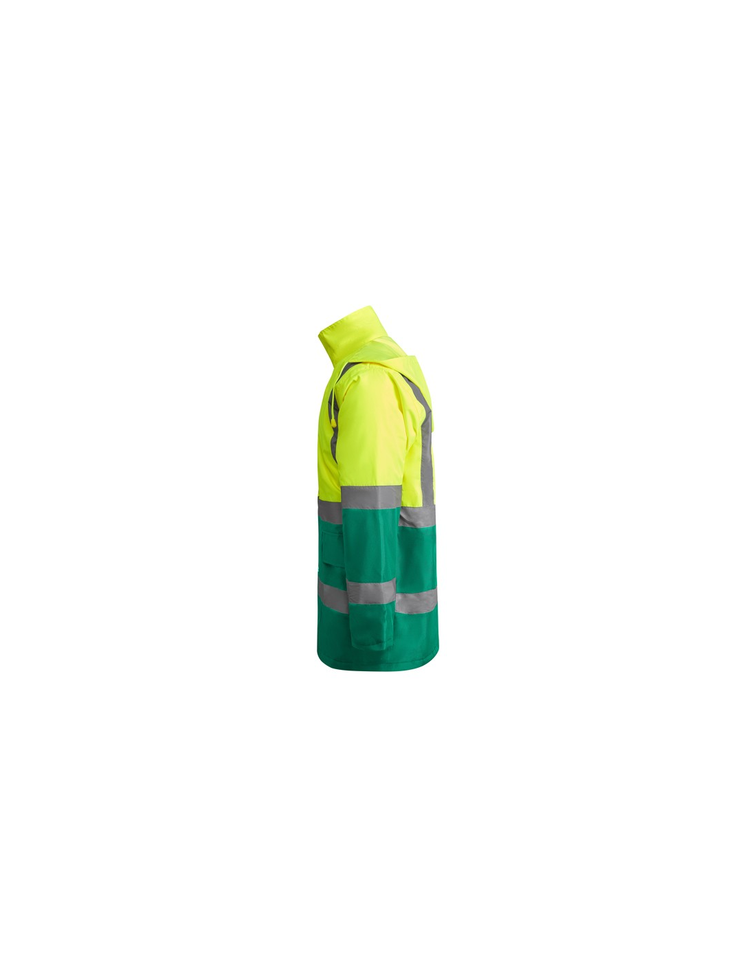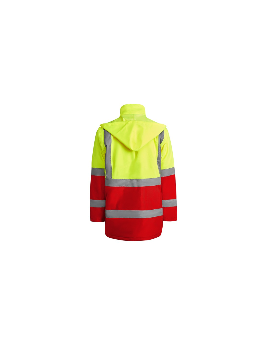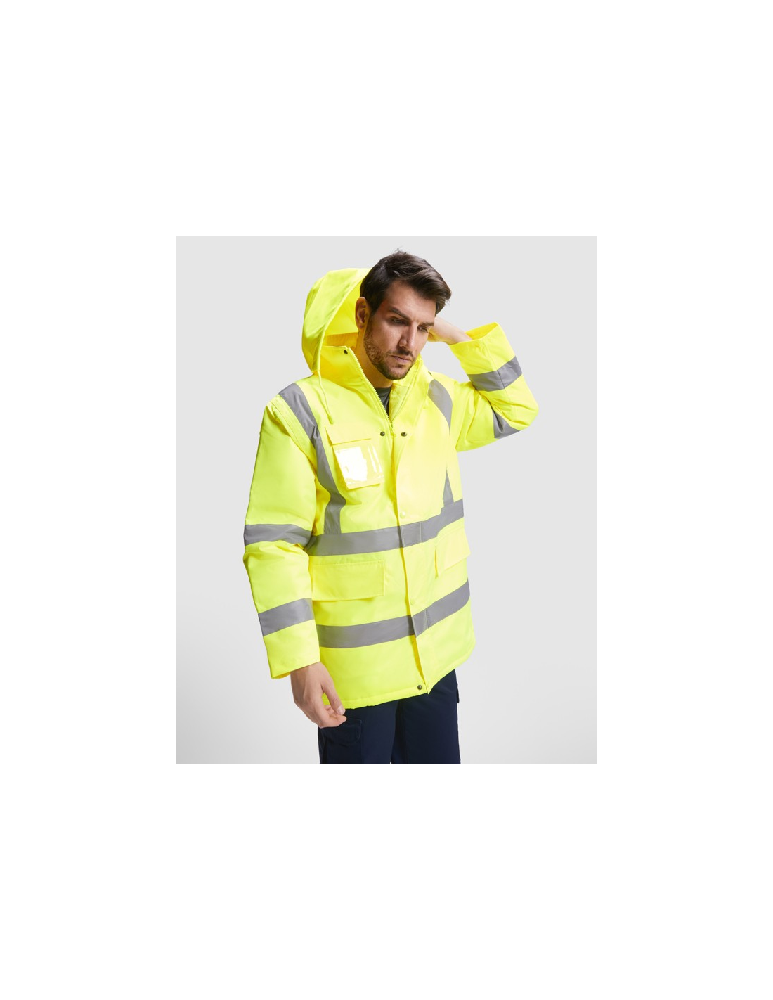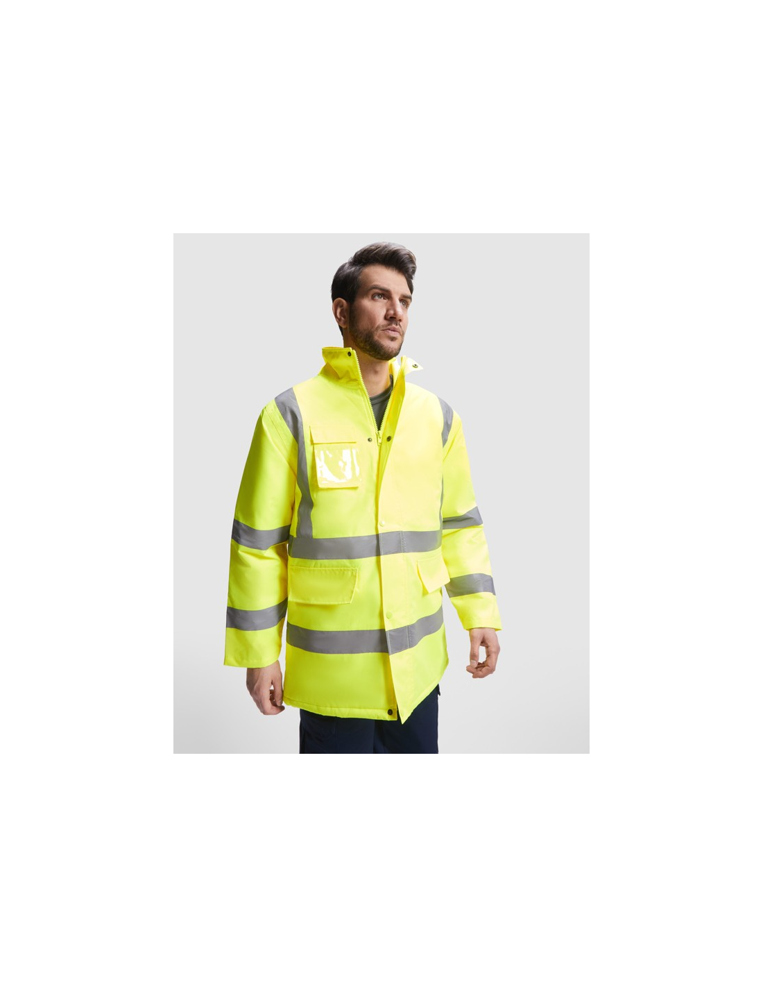 Łączona i wyściełana parka o wysokiej widoczności. · Wodoodporna tkanina z uszczelnionymi szwami. · Dwa poziome paski o wysokiej widoczności na klatce piersiowej i rękawach oraz pionowe paski na ramionach. · Składany kaptur ze ściągaczem do regulacji. · Kieszeń na piersi z klapką, zapięciem na rzepem i identyfikatorem. · Dwie przednie kieszenie z klapkami. · Wewnętrzna kieszeń z zapięciem na zamek błyskawiczny. · Ukryte mankiety ze ściągaczem 1x1. · Przednie rozcięcie z zapięciem na metalowe guziki z podwójnym zamkiem błyskawicznym z przodu. · Wewnętrzny dostęp do sitodruku.