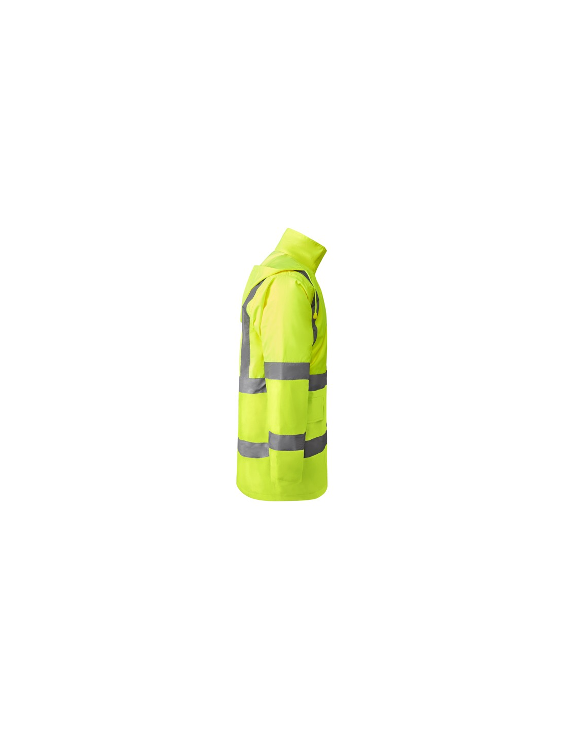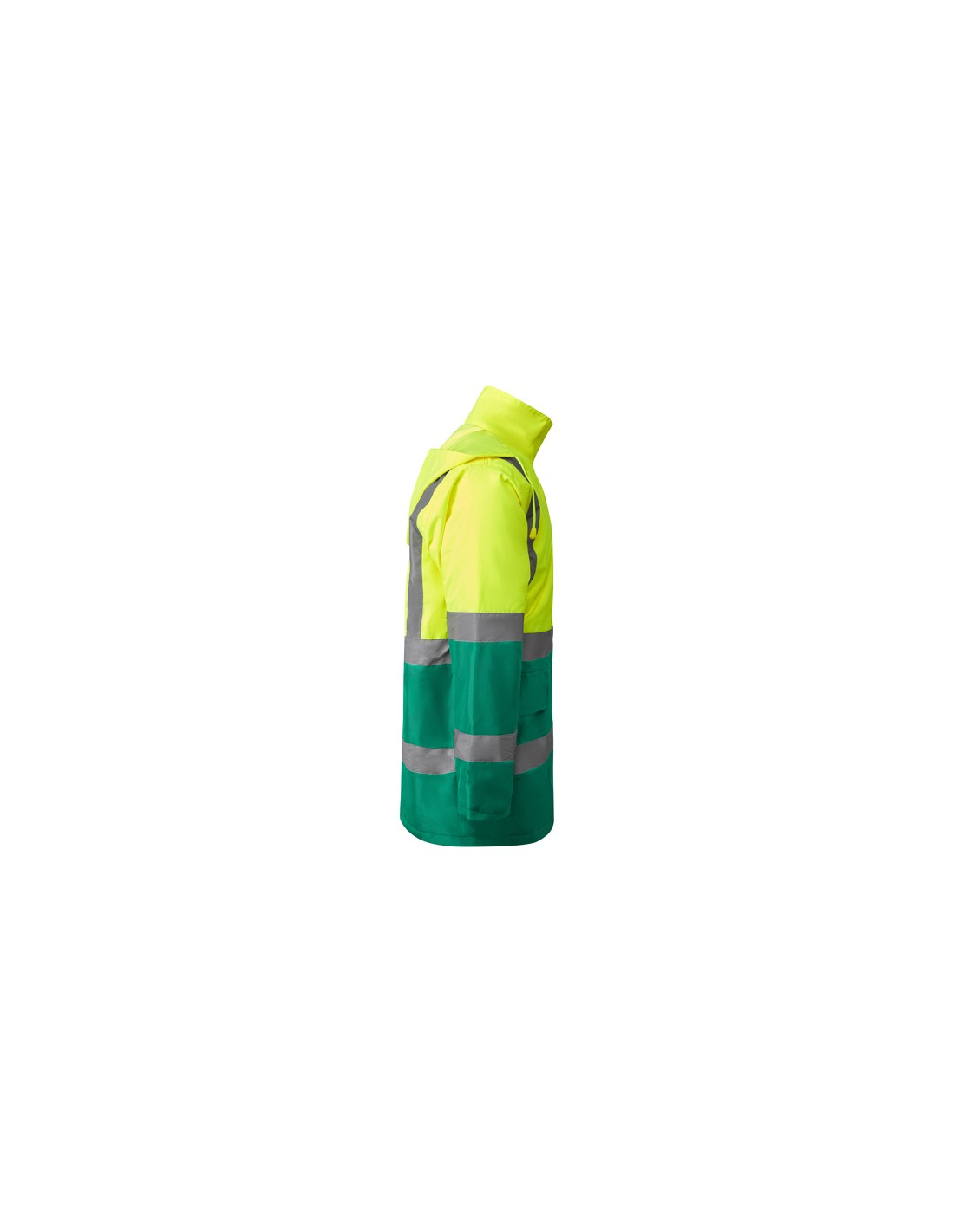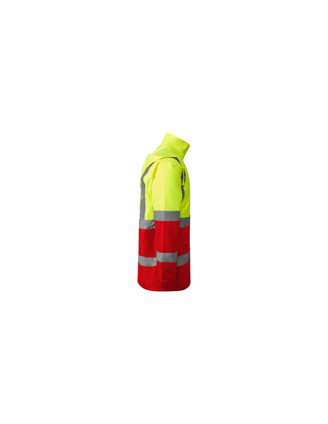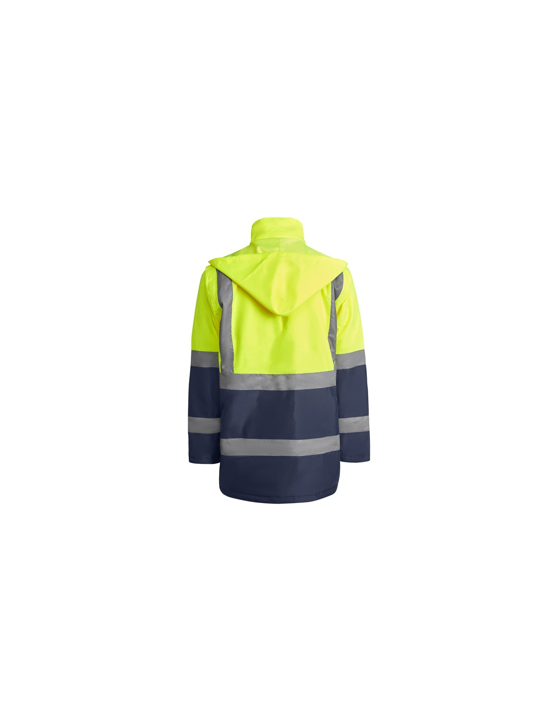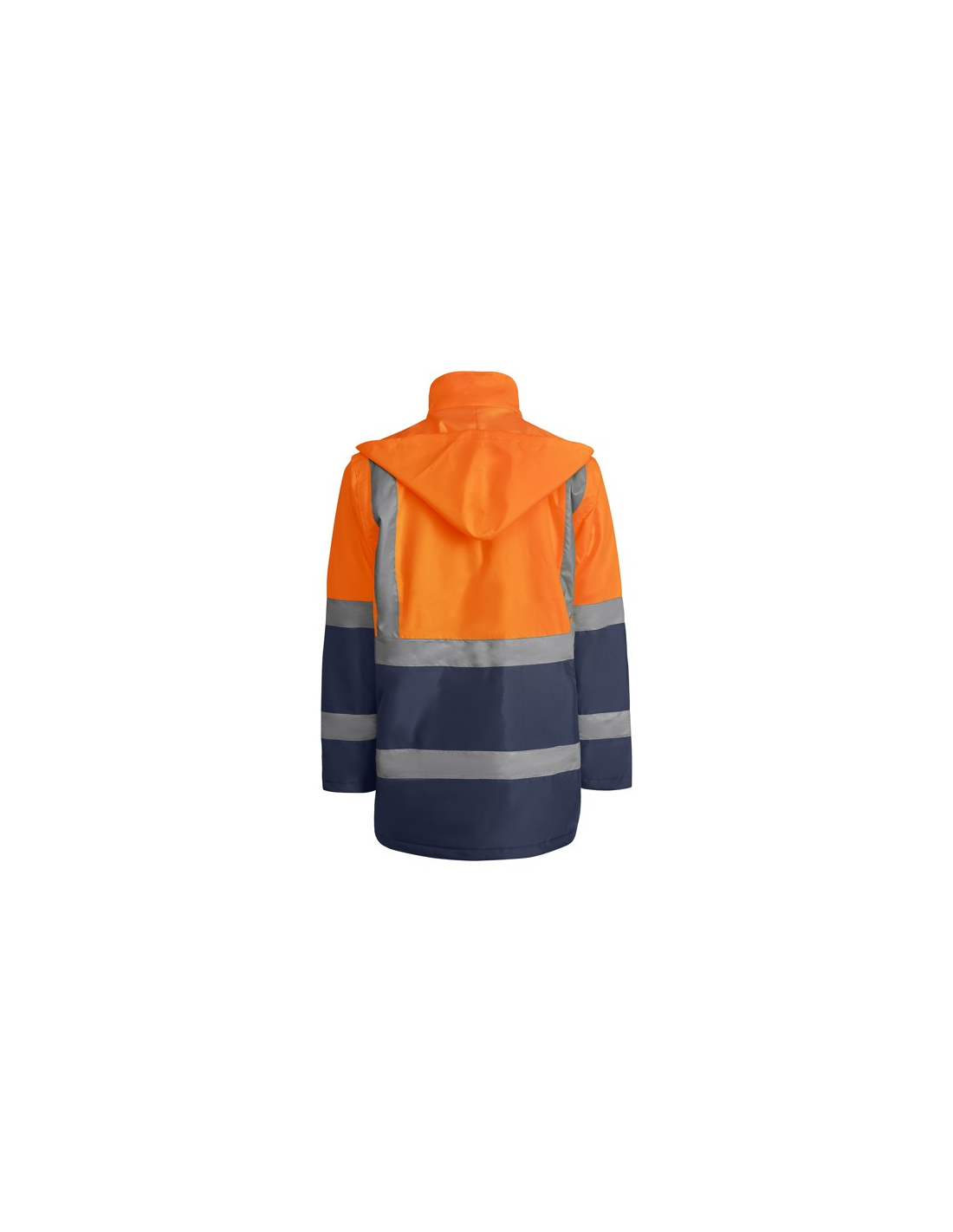 Łączona i wyściełana parka o wysokiej widoczności. · Wodoodporna tkanina z uszczelnionymi szwami. · Dwa poziome paski o wysokiej widoczności na klatce piersiowej i rękawach oraz pionowe paski na ramionach. · Składany kaptur ze ściągaczem do regulacji. · Kieszeń na piersi z klapką, zapięciem na rzepem i identyfikatorem. · Dwie przednie kieszenie z klapkami. · Wewnętrzna kieszeń z zapięciem na zamek błyskawiczny. · Ukryte mankiety ze ściągaczem 1x1. · Przednie rozcięcie z zapięciem na metalowe guziki z podwójnym zamkiem błyskawicznym z przodu. · Wewnętrzny dostęp do sitodruku.