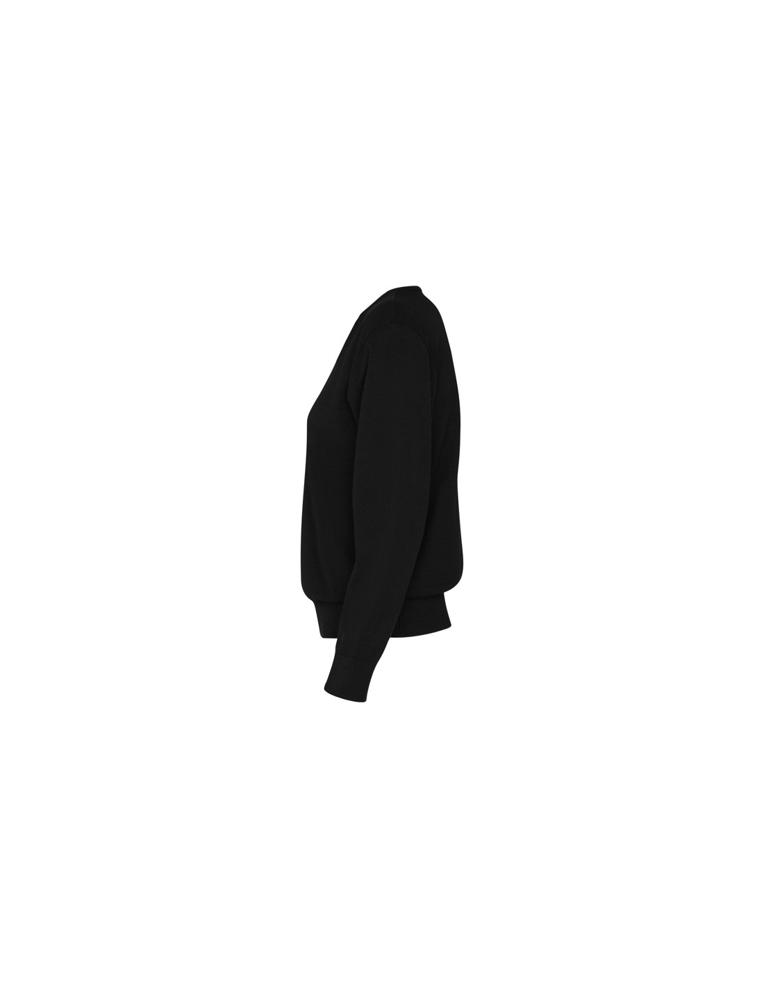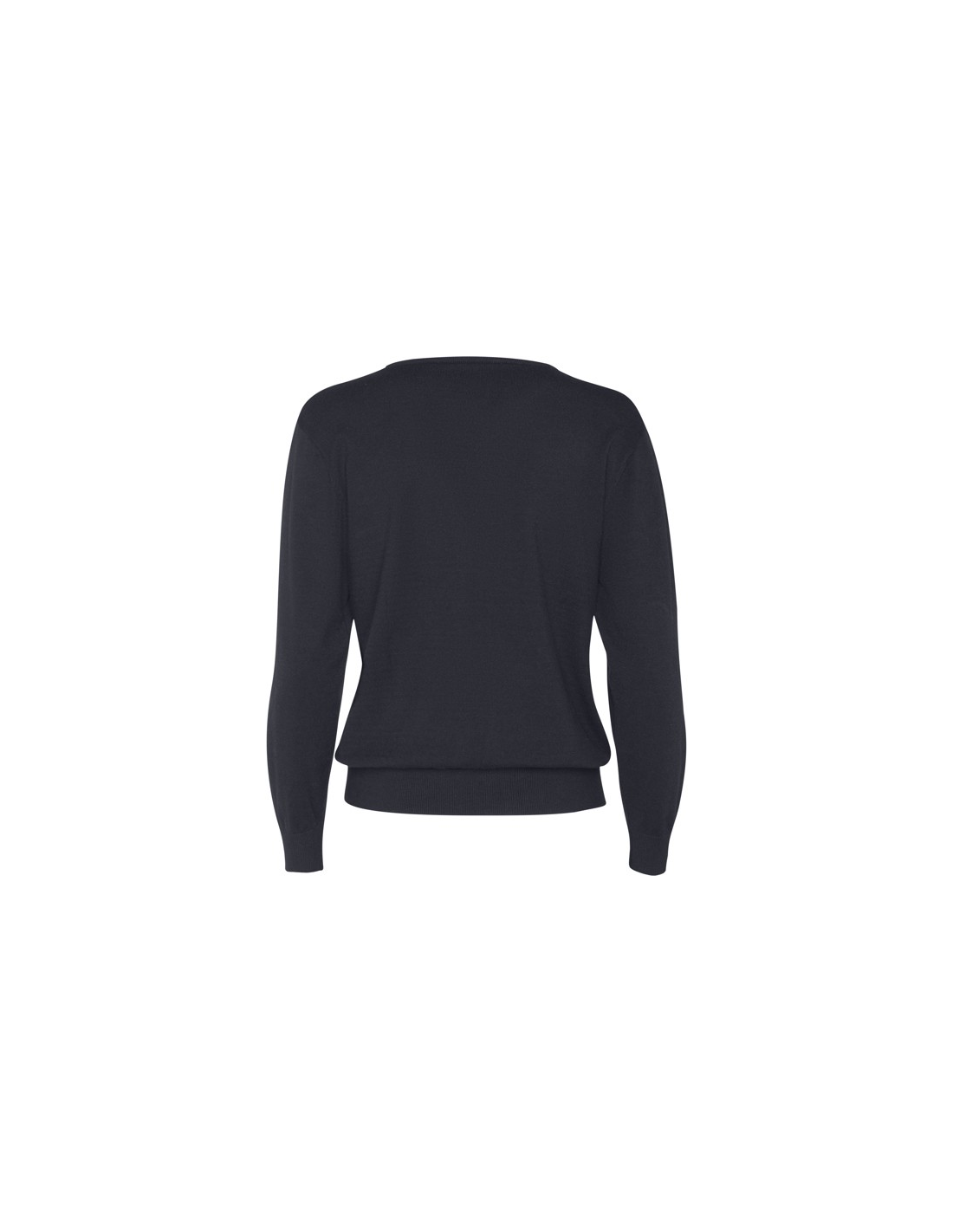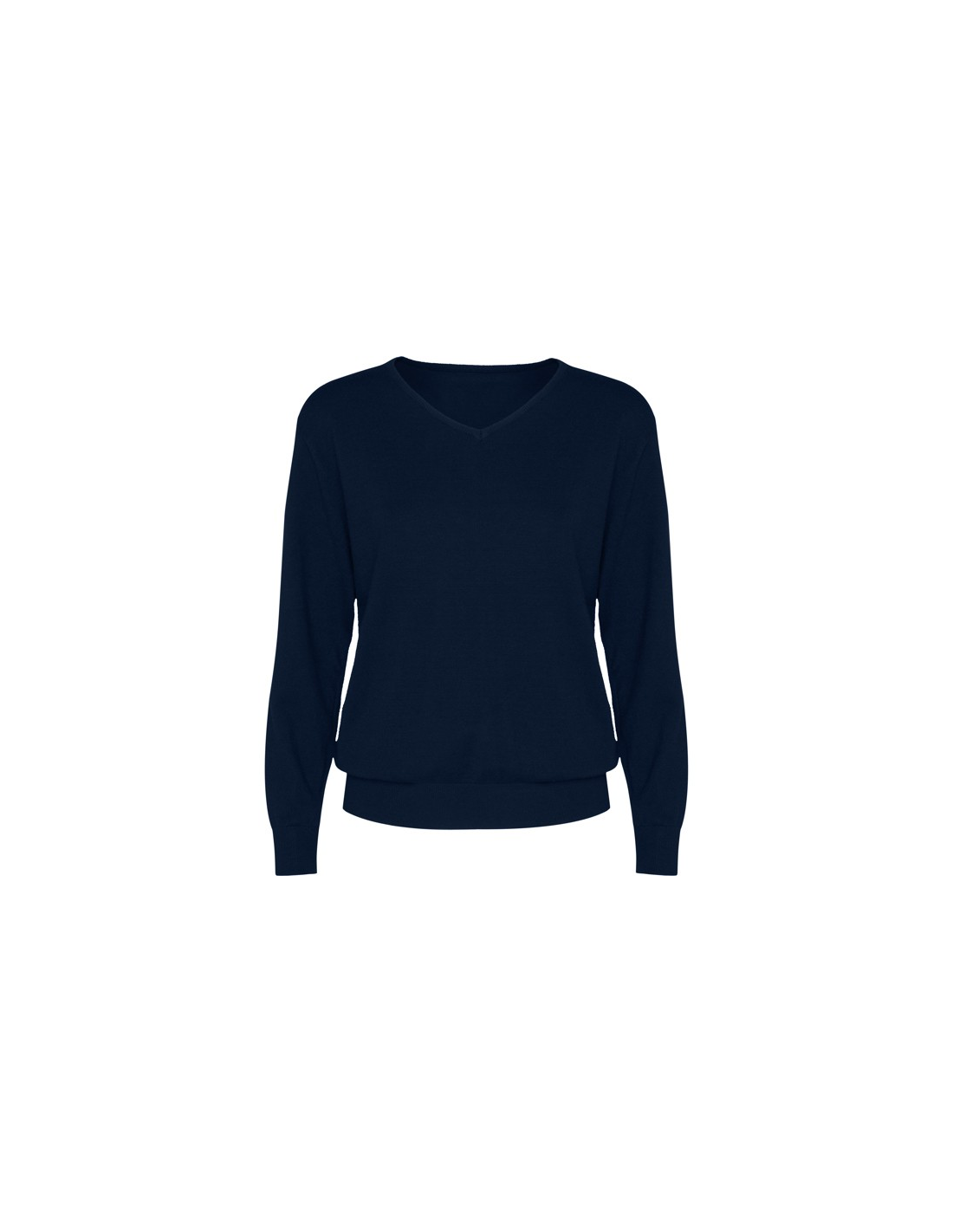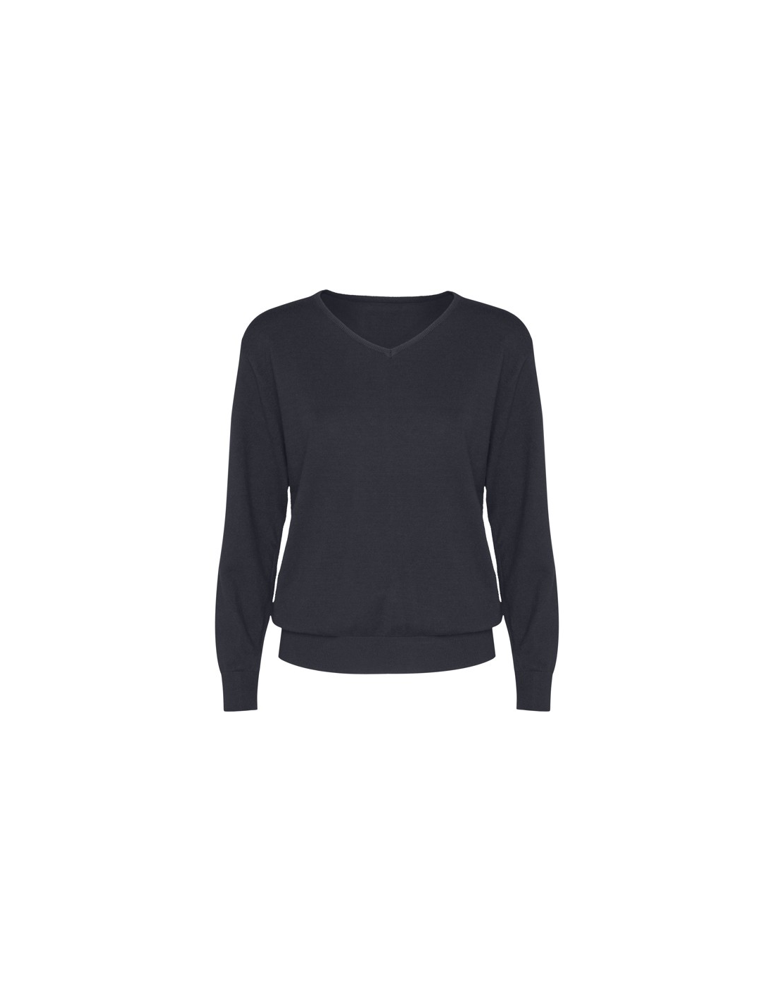 Damski sweter z cienkiej dzianiny z dekoltem w serek. Dopasowany ściągacz 1x1 przy szyi, mankietach i u dołu.