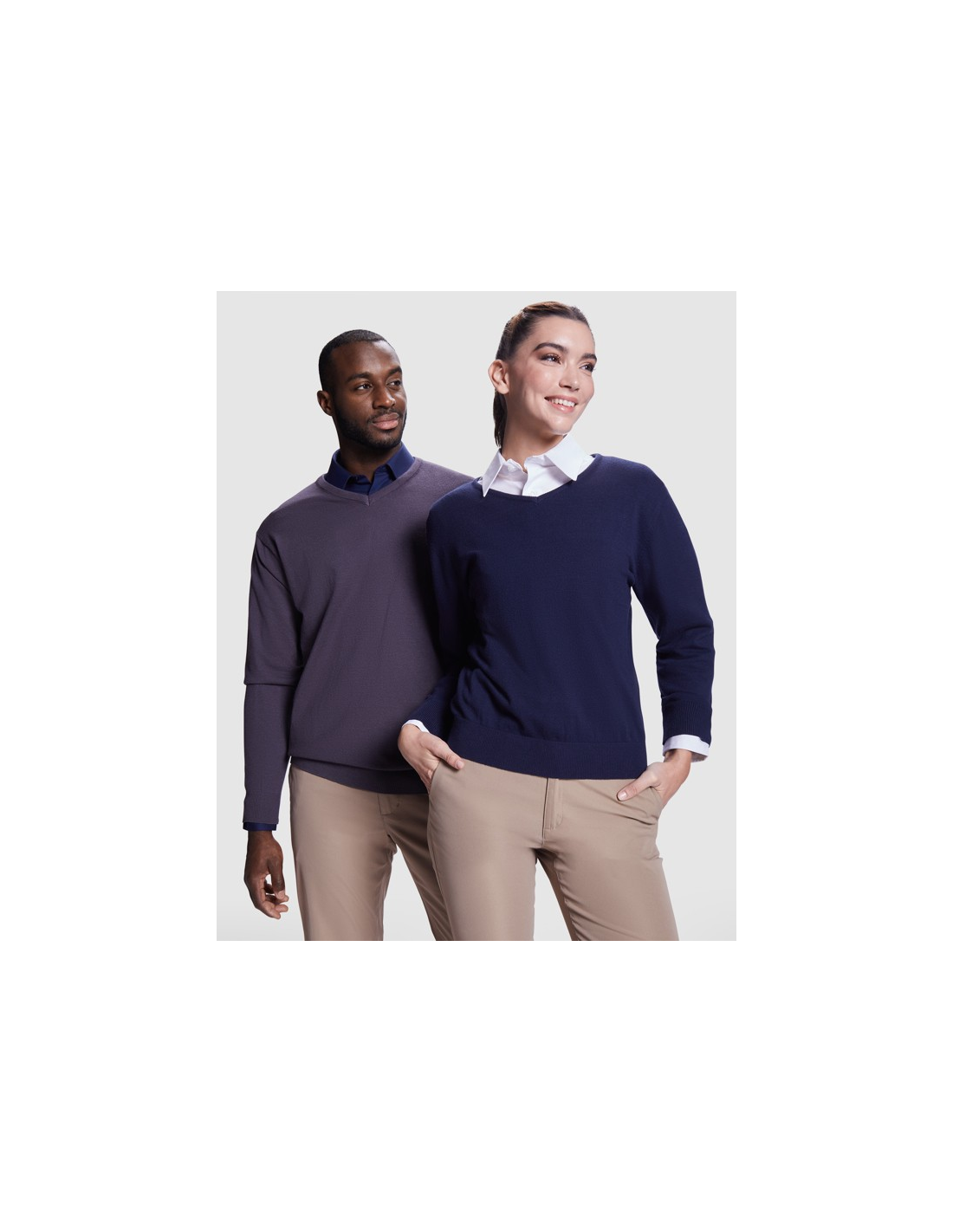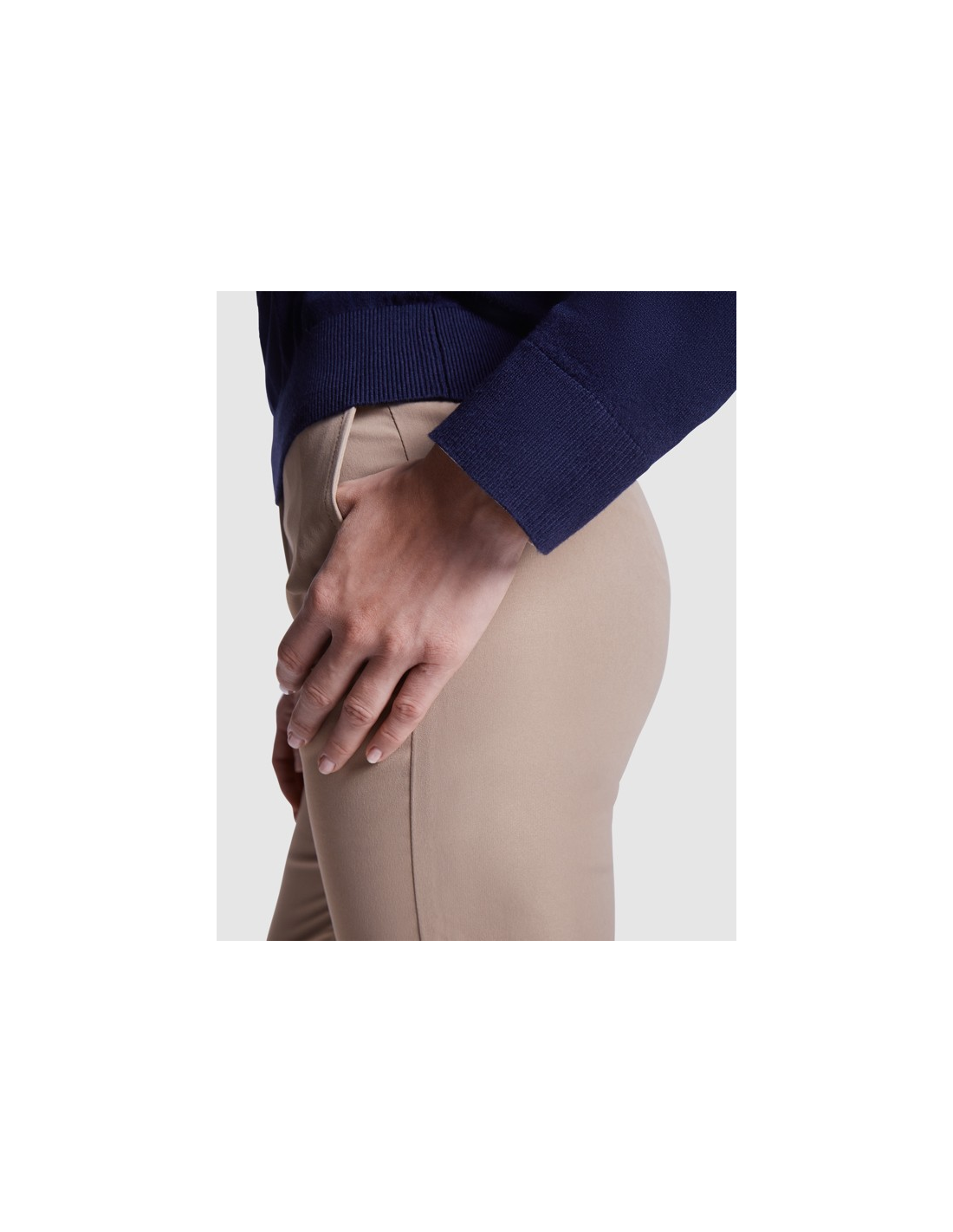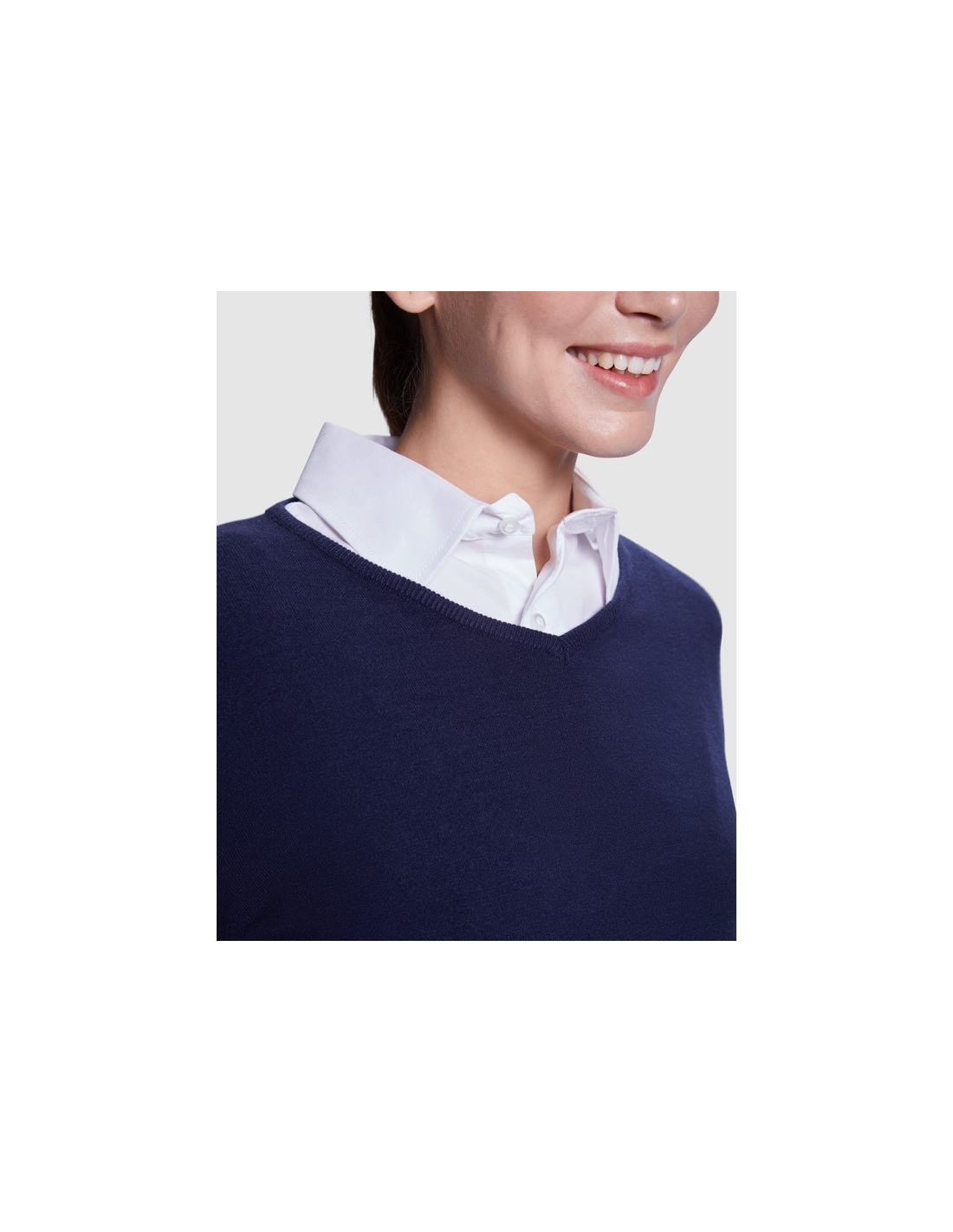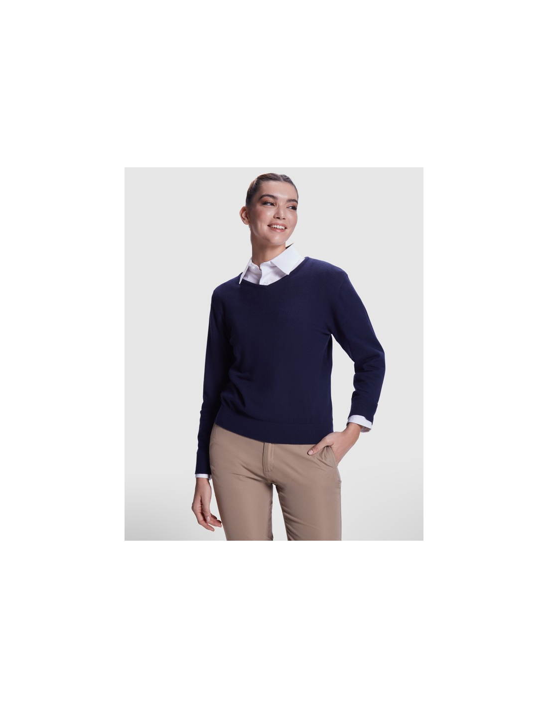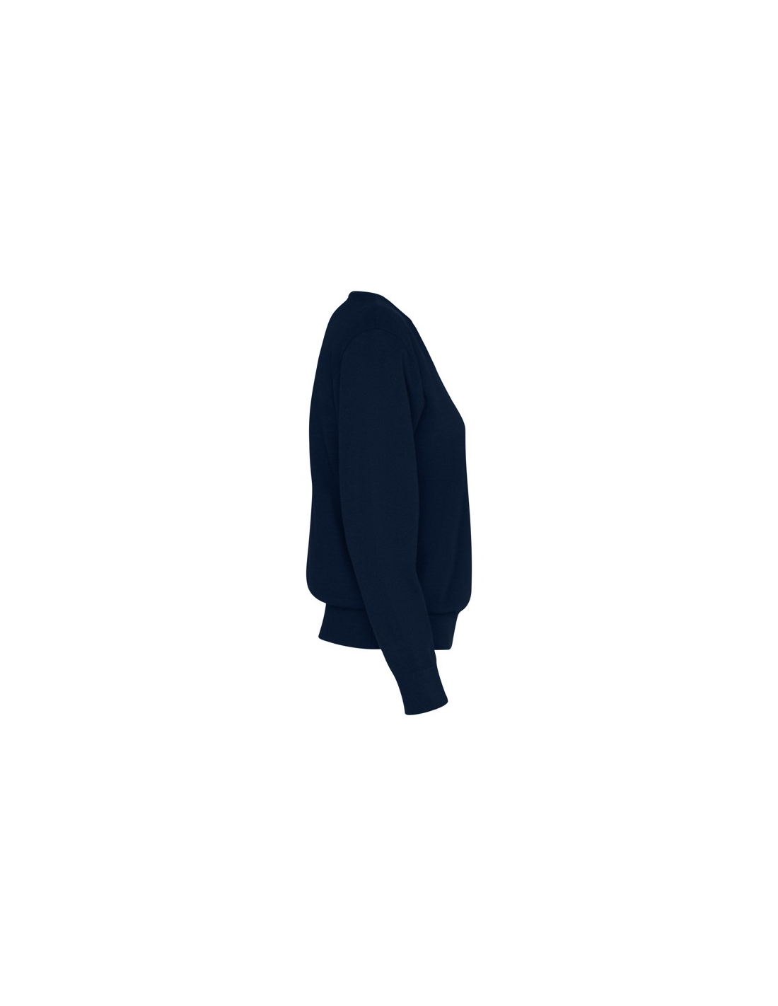 Damski sweter z cienkiej dzianiny z dekoltem w serek. Dopasowany ściągacz 1x1 przy szyi, mankietach i u dołu.