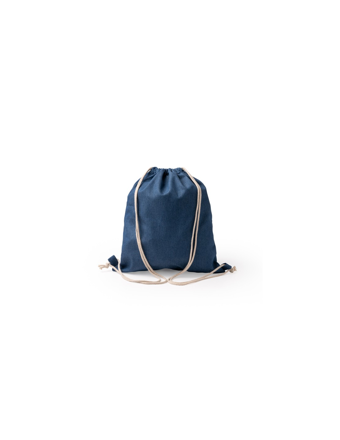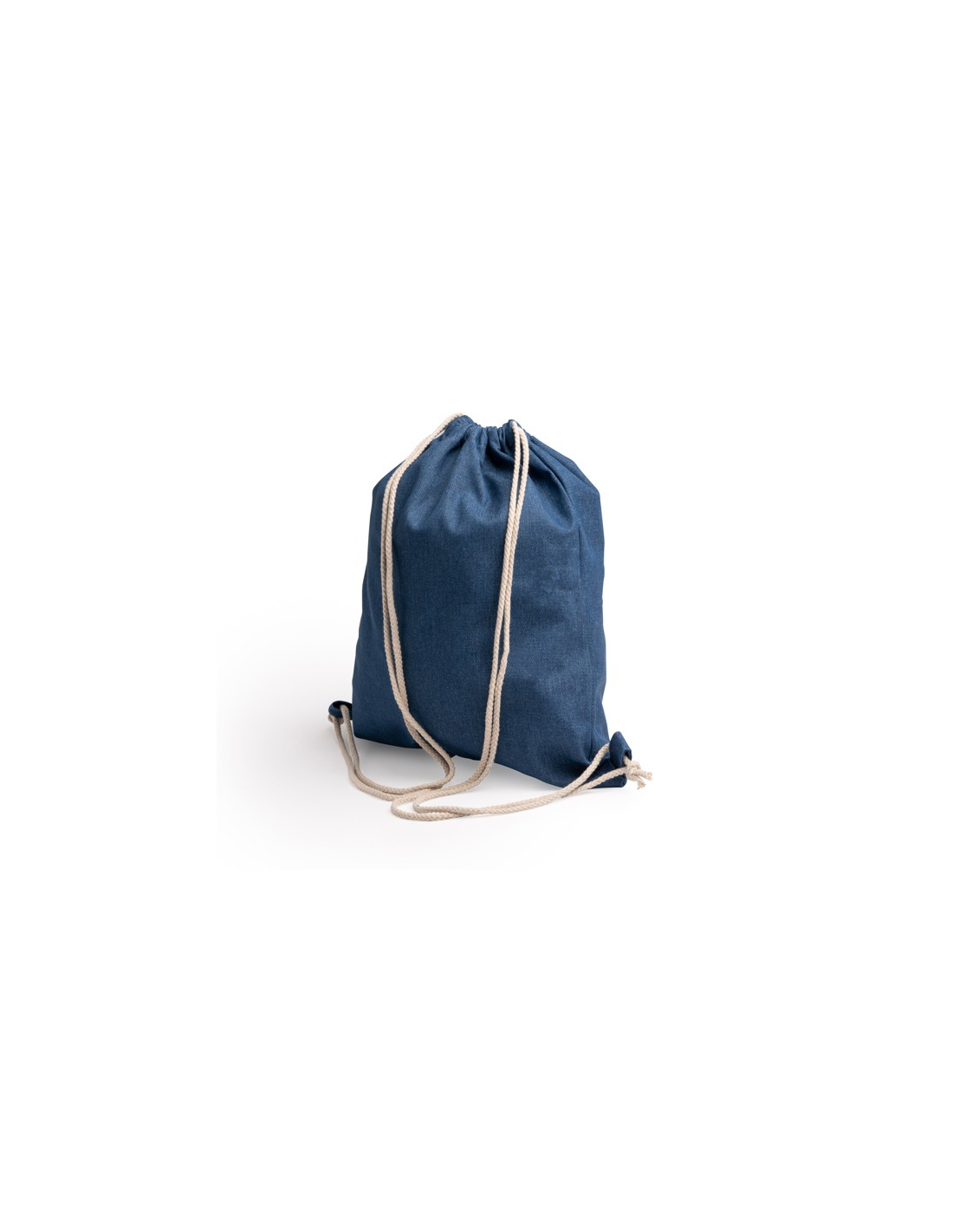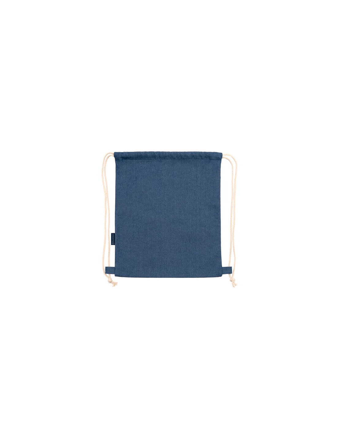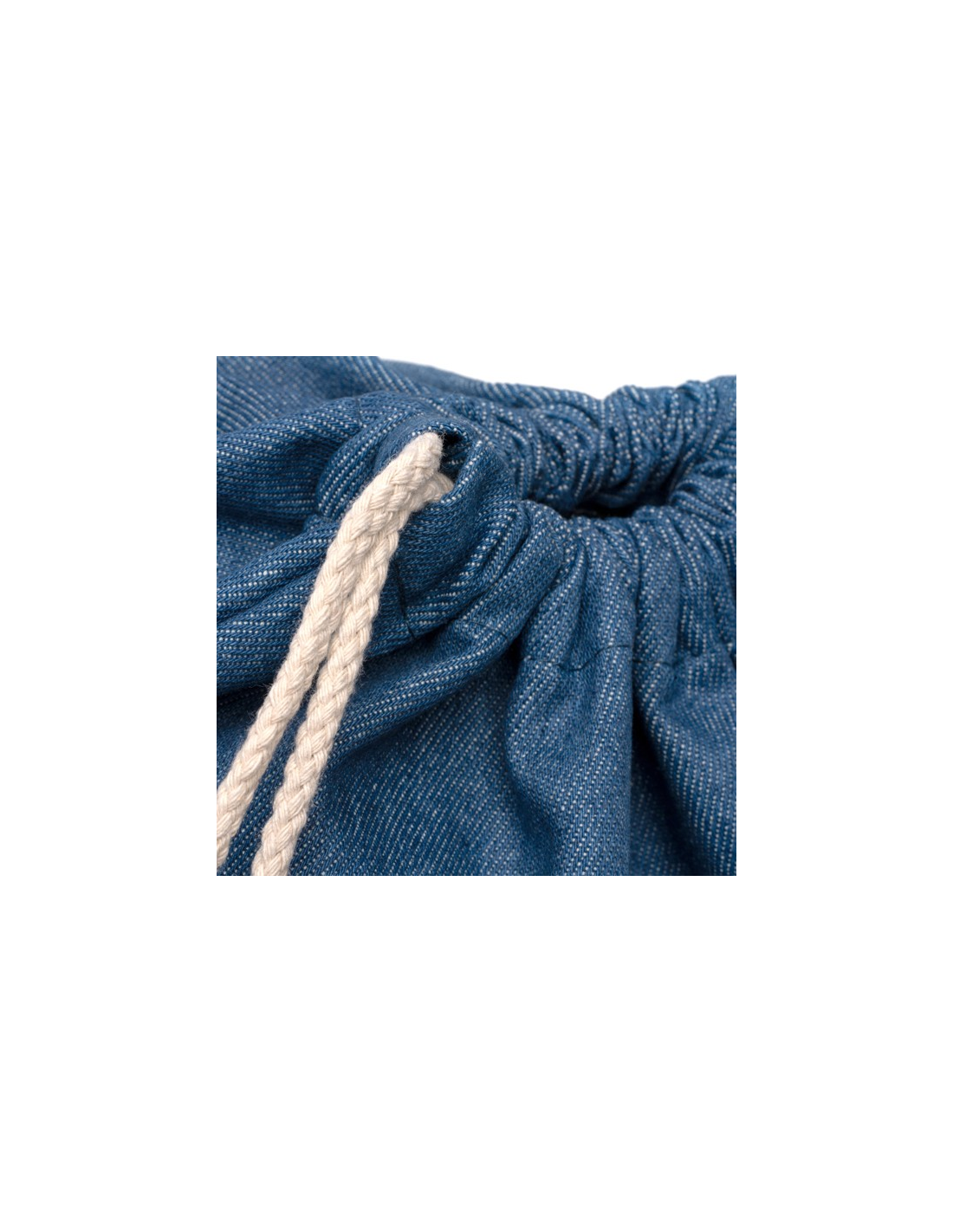 Plecak ściągany sznurkiem, wykonany z dżinsu pochodzącego z recyklingu, z bawełnianymi sznurkami o grubości 8 mm.