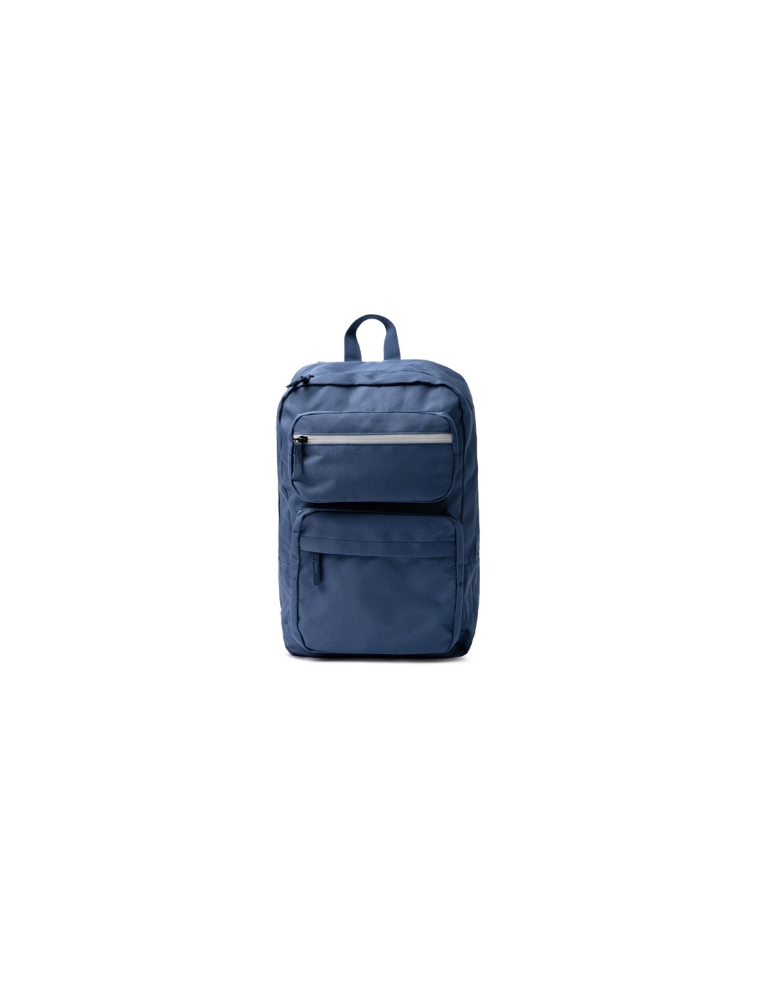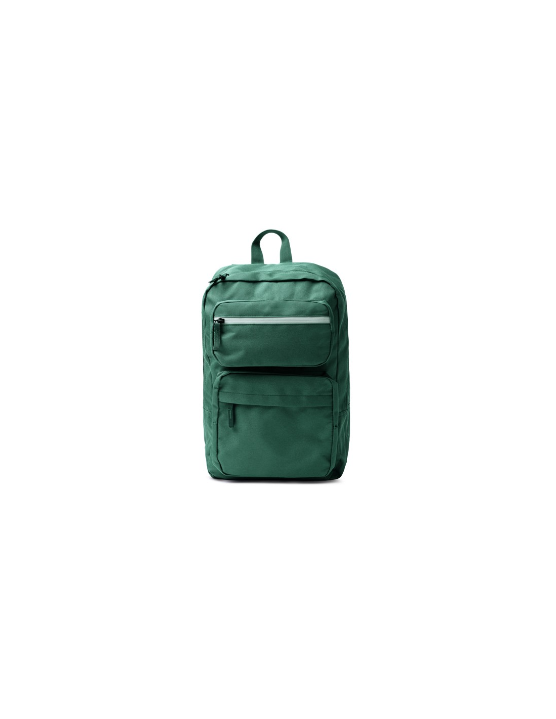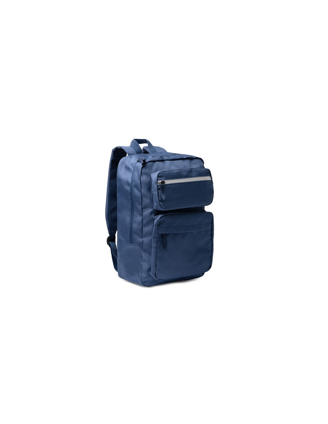 Plecak wykonany z tkaniny 600D RPET. Dwie przednie kieszenie, wewnętrzna komora z wyściełaną kieszenią na laptopa o przekątnej 15 cali. Górna kieszeń z przodu z odblaskową taśmą i wodoodpornym zapięciem na zamek błyskawiczny. Wyściełane uchwyty i plecy.