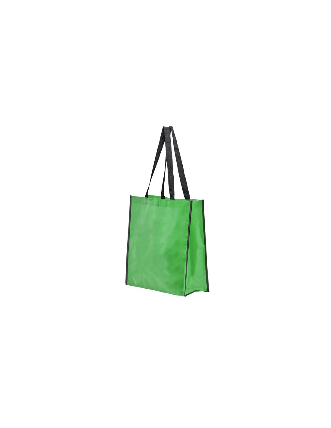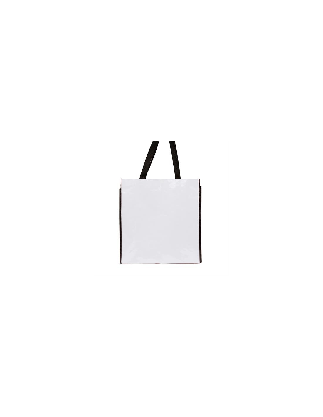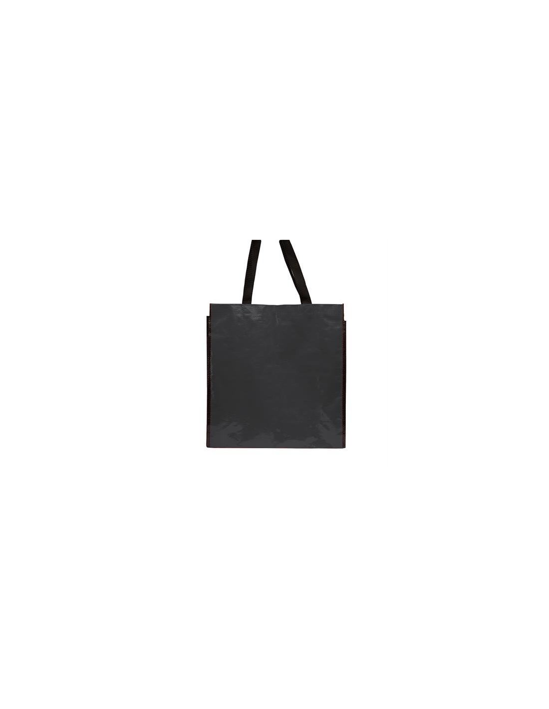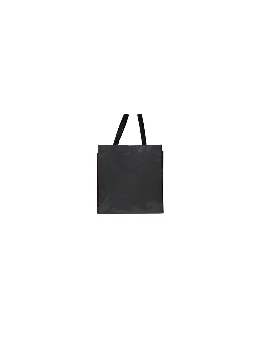 Torba wielokrotnego użytku z wykończeniem z błyszczącego laminatu. Wytrzymały materiał z wzmocnionymi nylonowymi uchwytami i dopasowaną czarną lamówką.