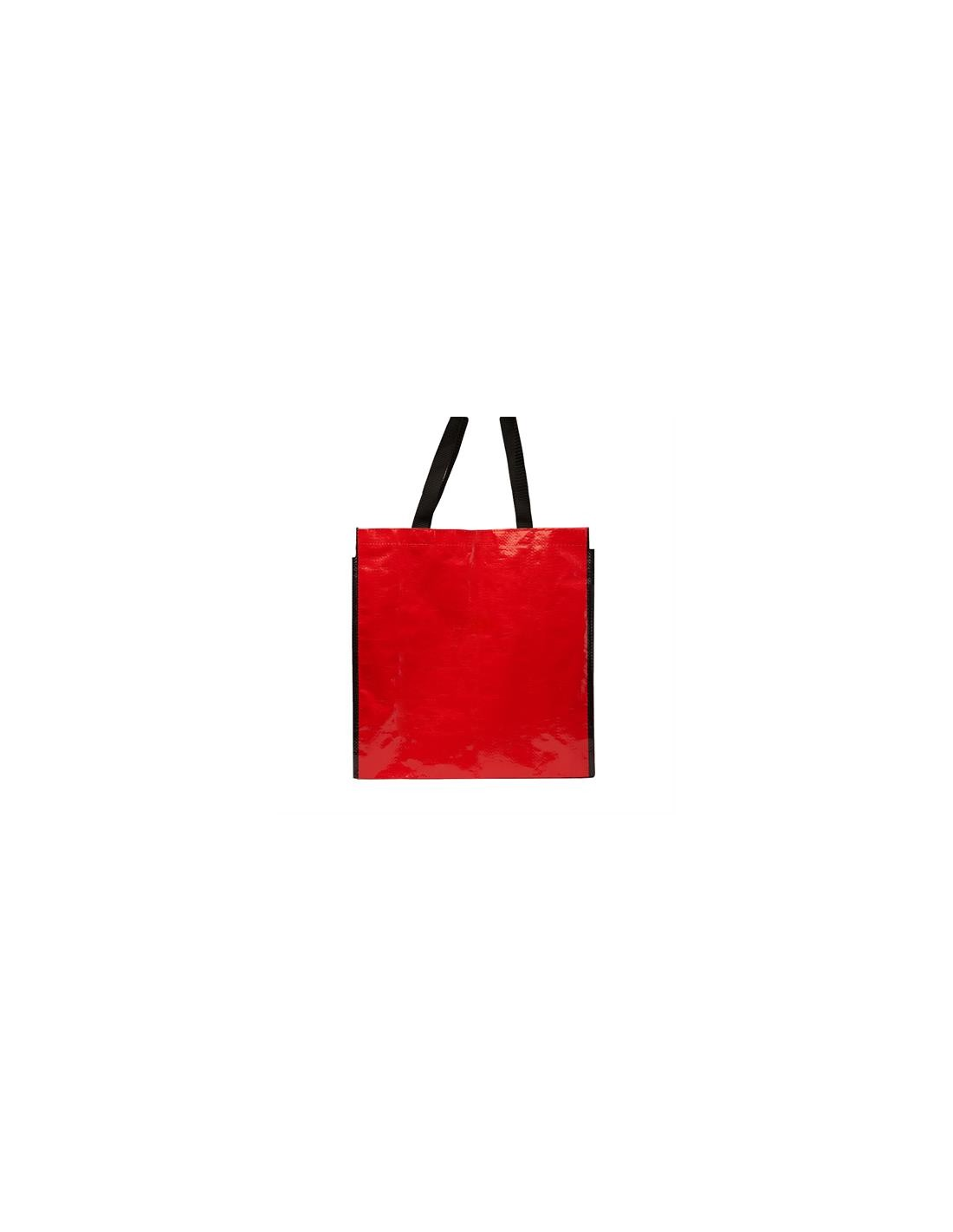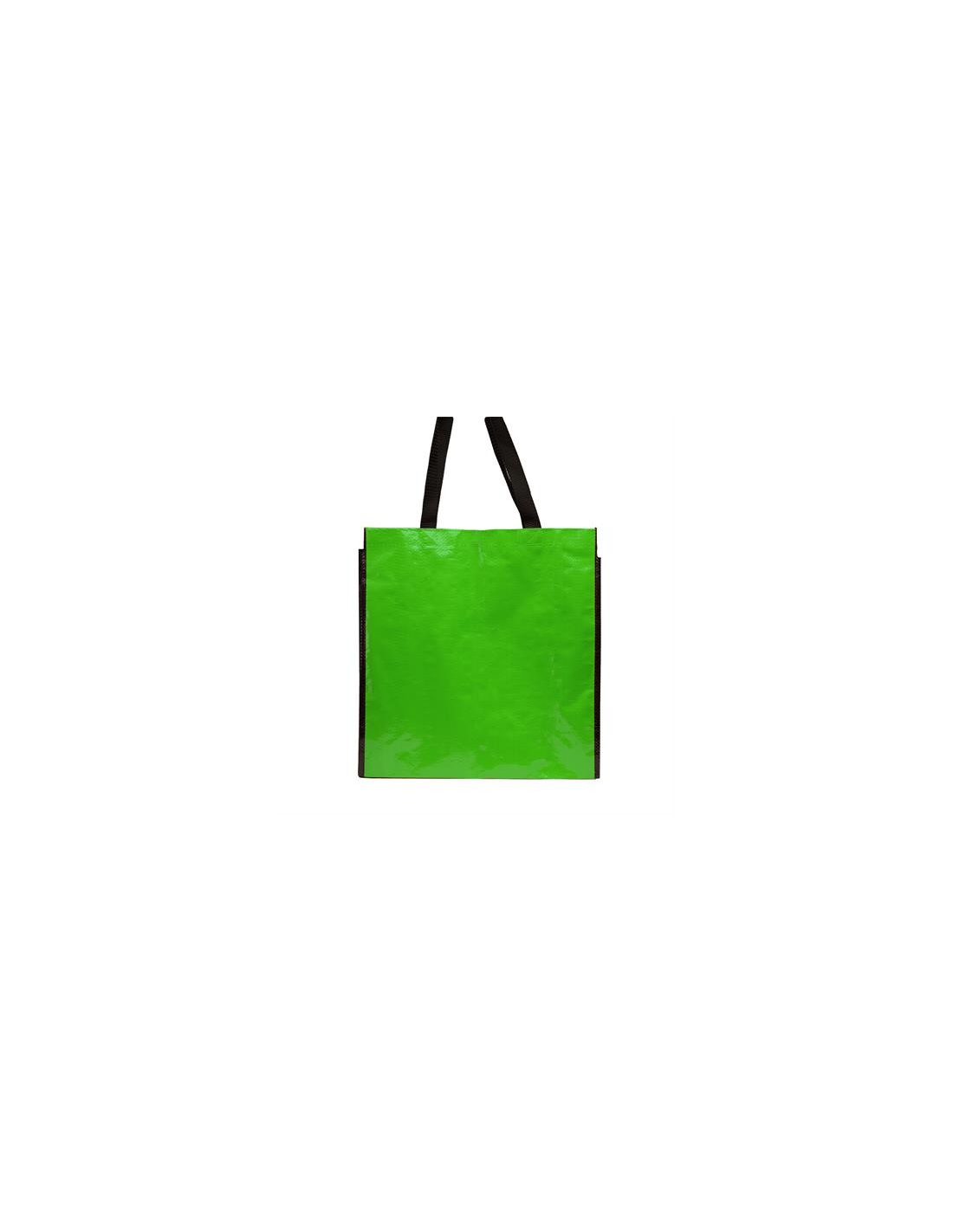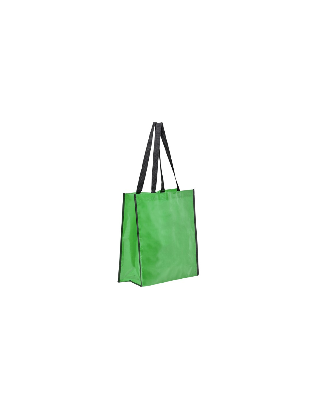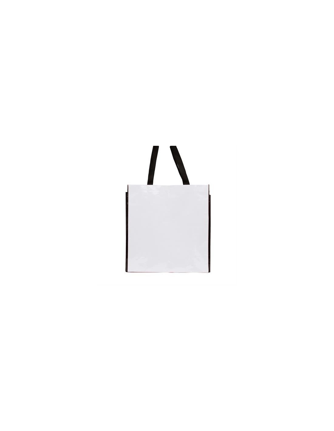 Torba wielokrotnego użytku z wykończeniem z błyszczącego laminatu. Wytrzymały materiał z wzmocnionymi nylonowymi uchwytami i dopasowaną czarną lamówką.