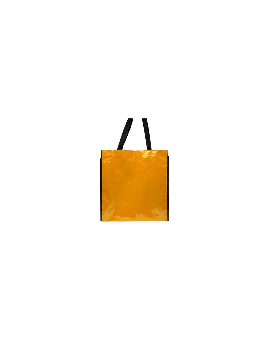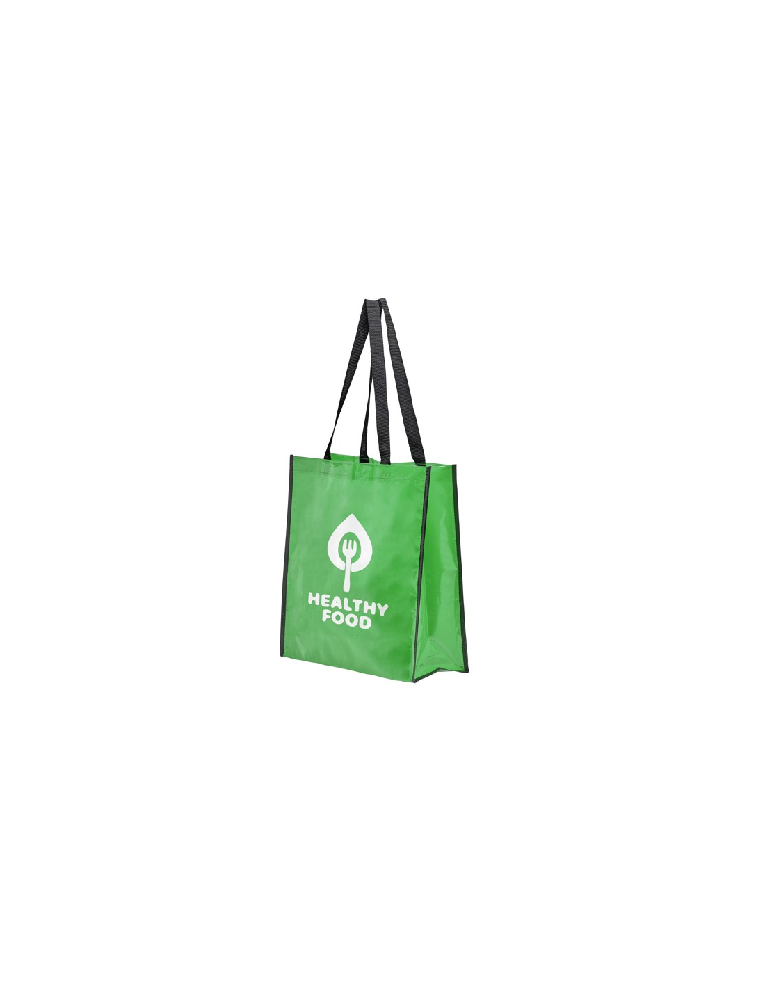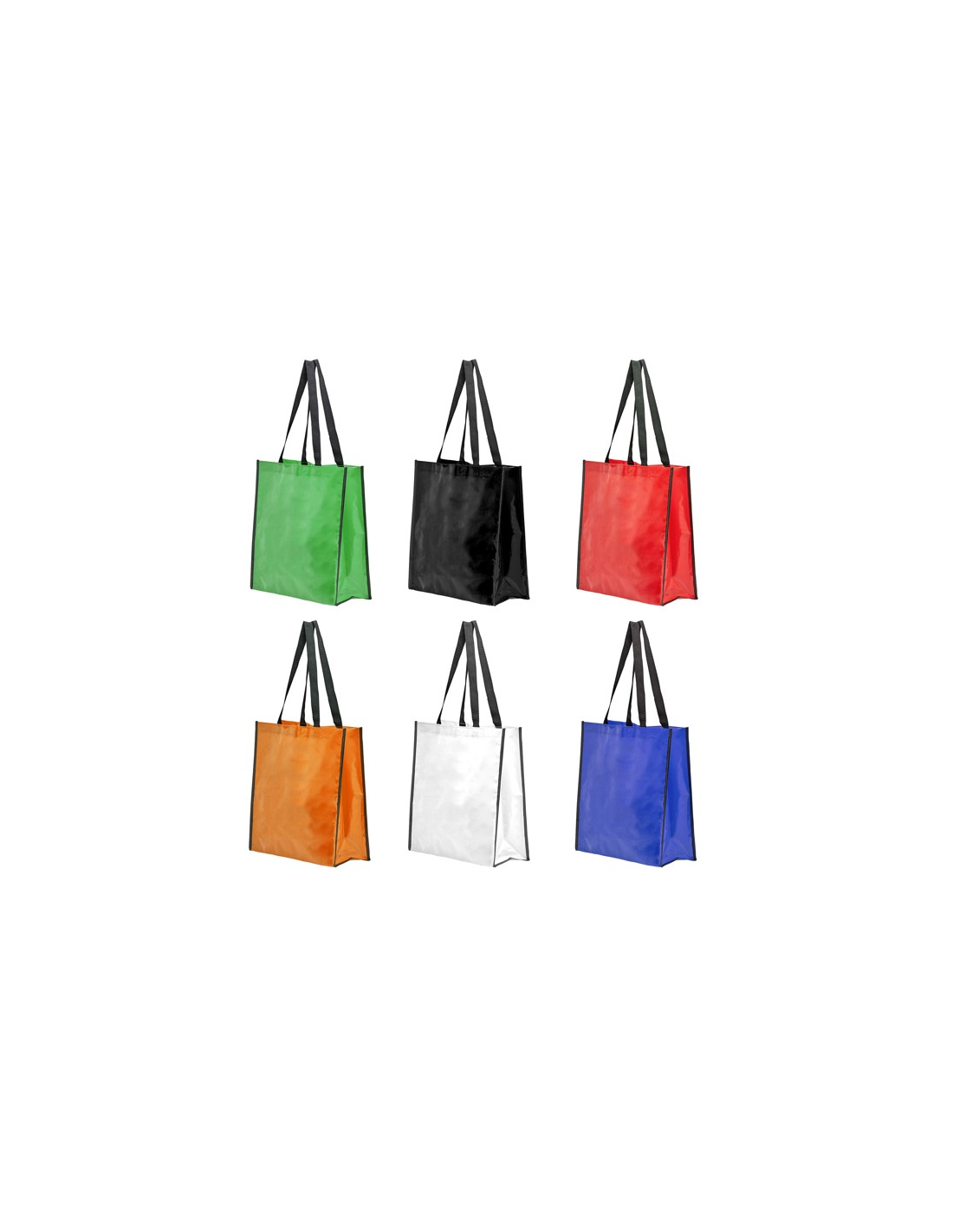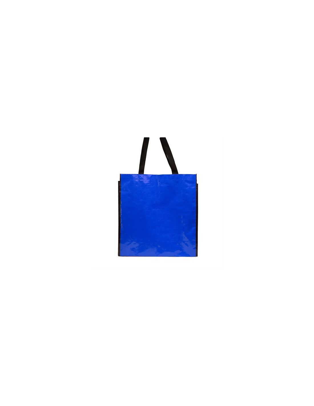 Torba wielokrotnego użytku z wykończeniem z błyszczącego laminatu. Wytrzymały materiał z wzmocnionymi nylonowymi uchwytami i dopasowaną czarną lamówką.