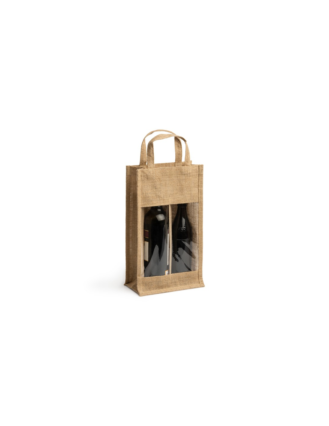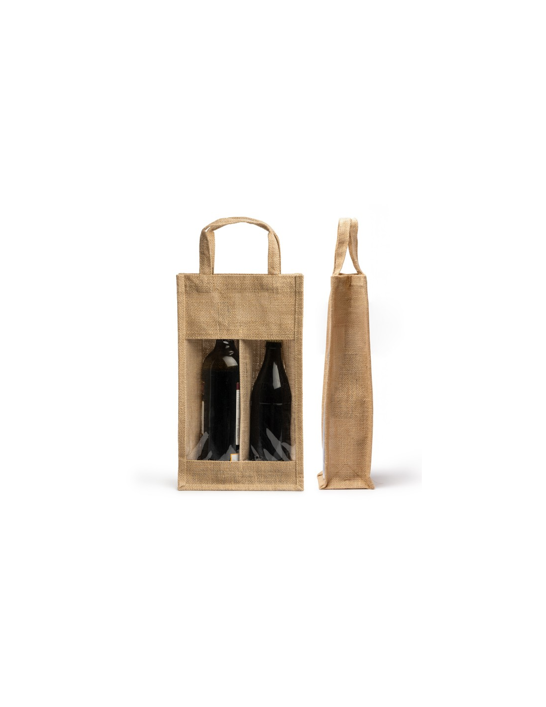 Laminowana jutowa torba z okienkiem i podwójną przegrodą. Idealna do butelek. Wzmocnione uchwyty.