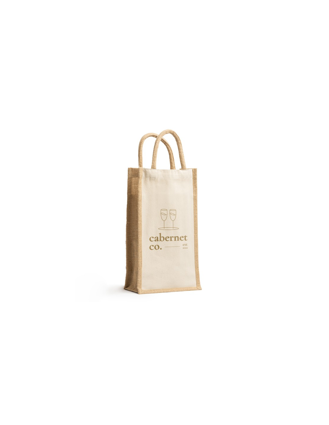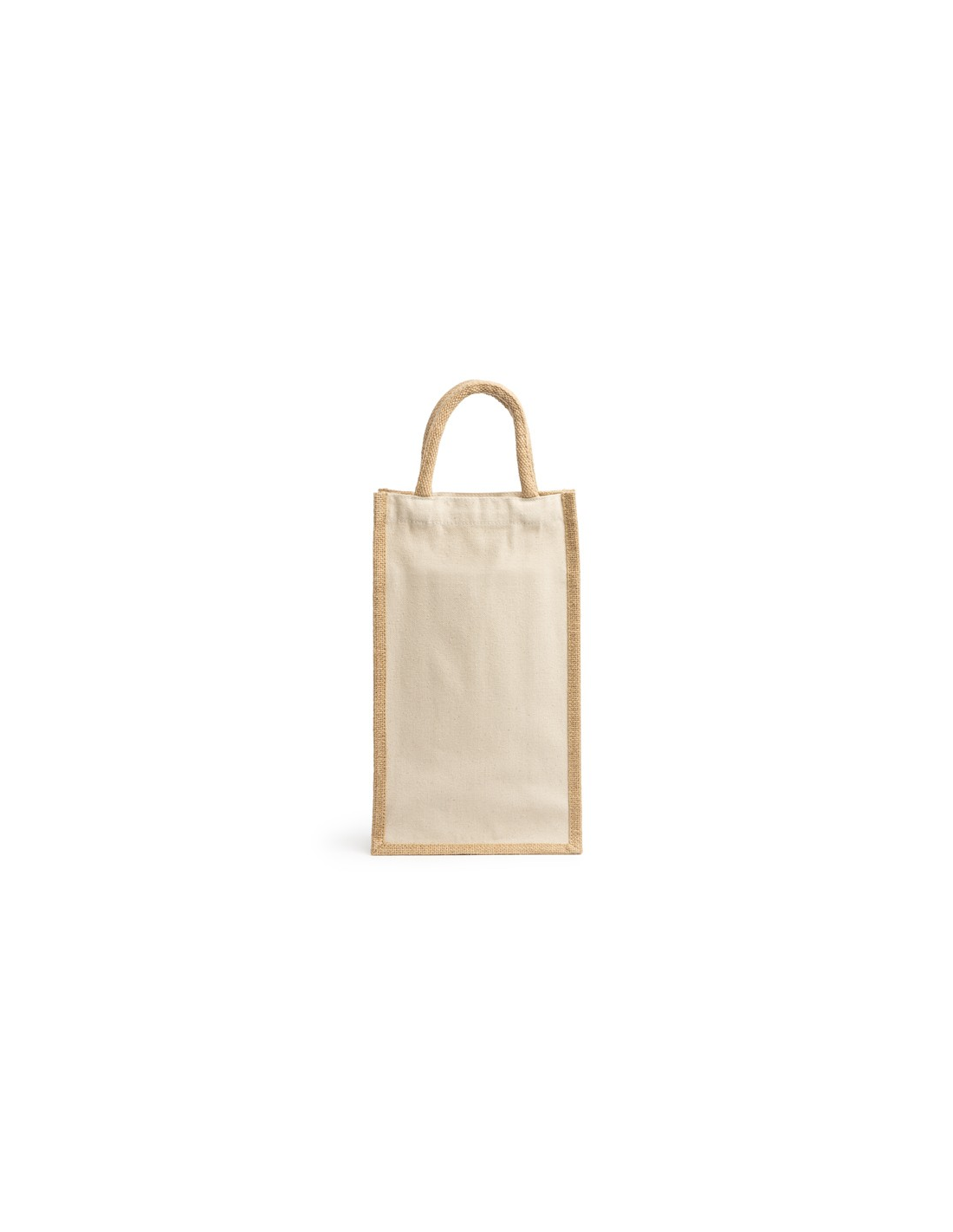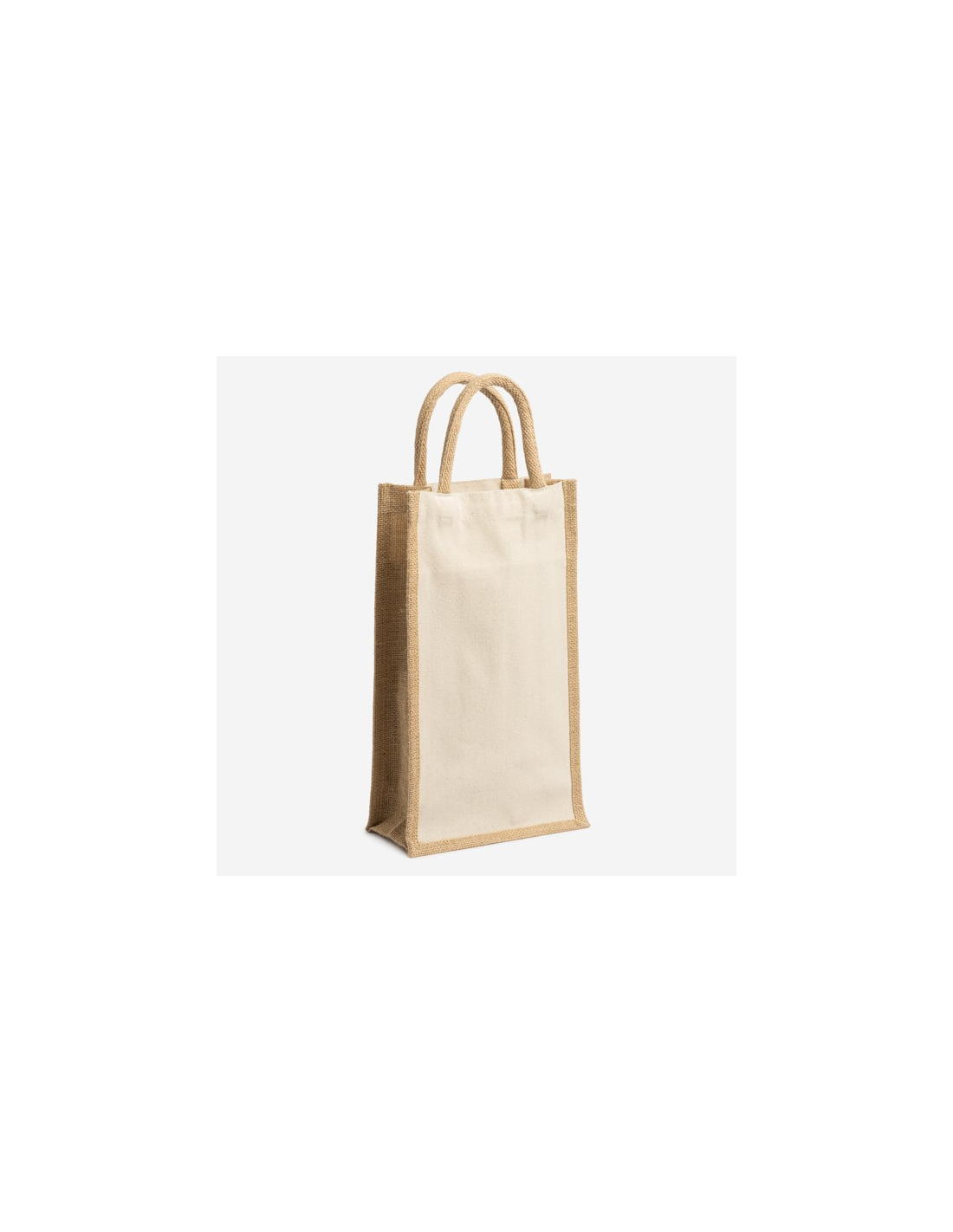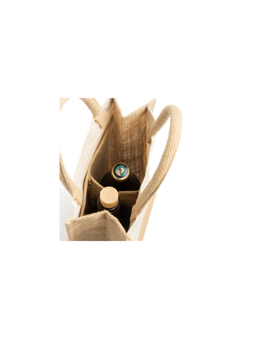 Laminowana jutowo-bawełniana torba. Podwójna przegroda i wzmocnione uchwyty. Idealna do dwóch butelek.