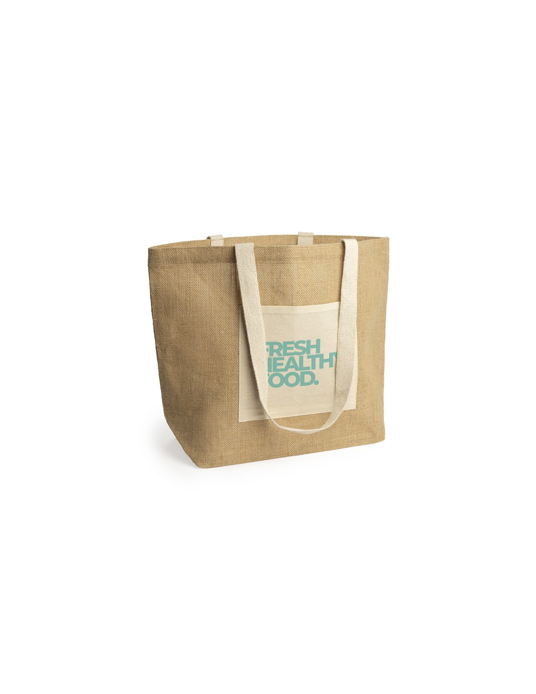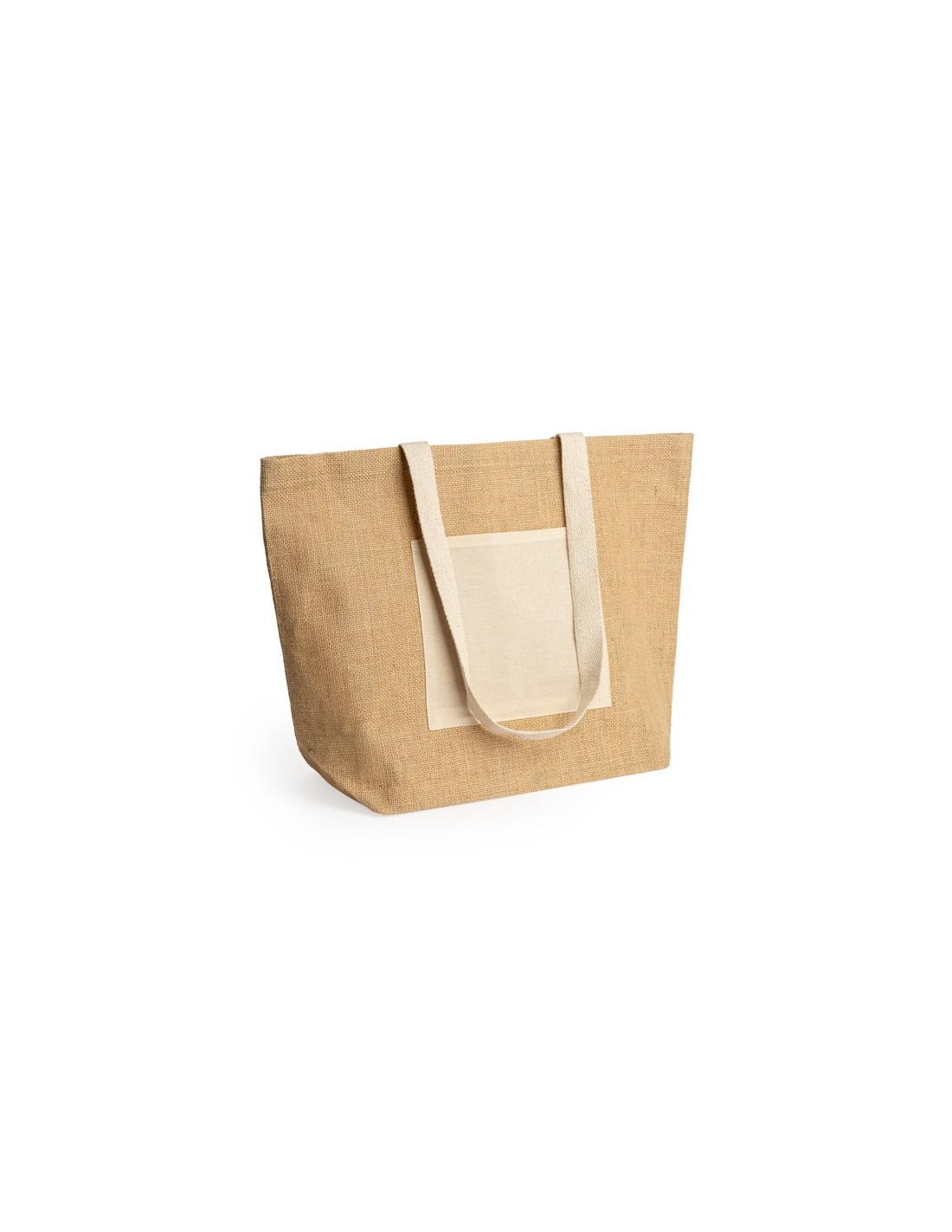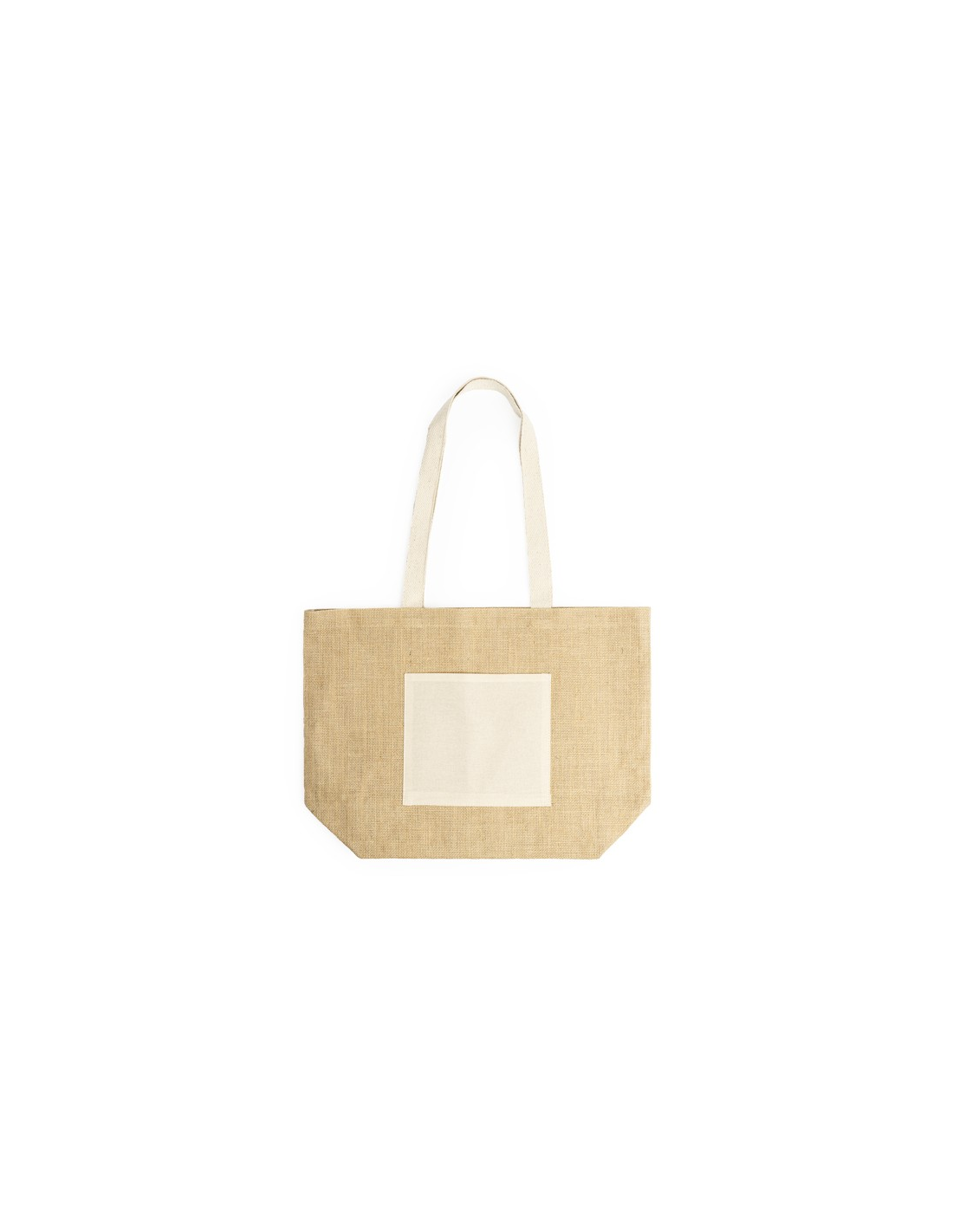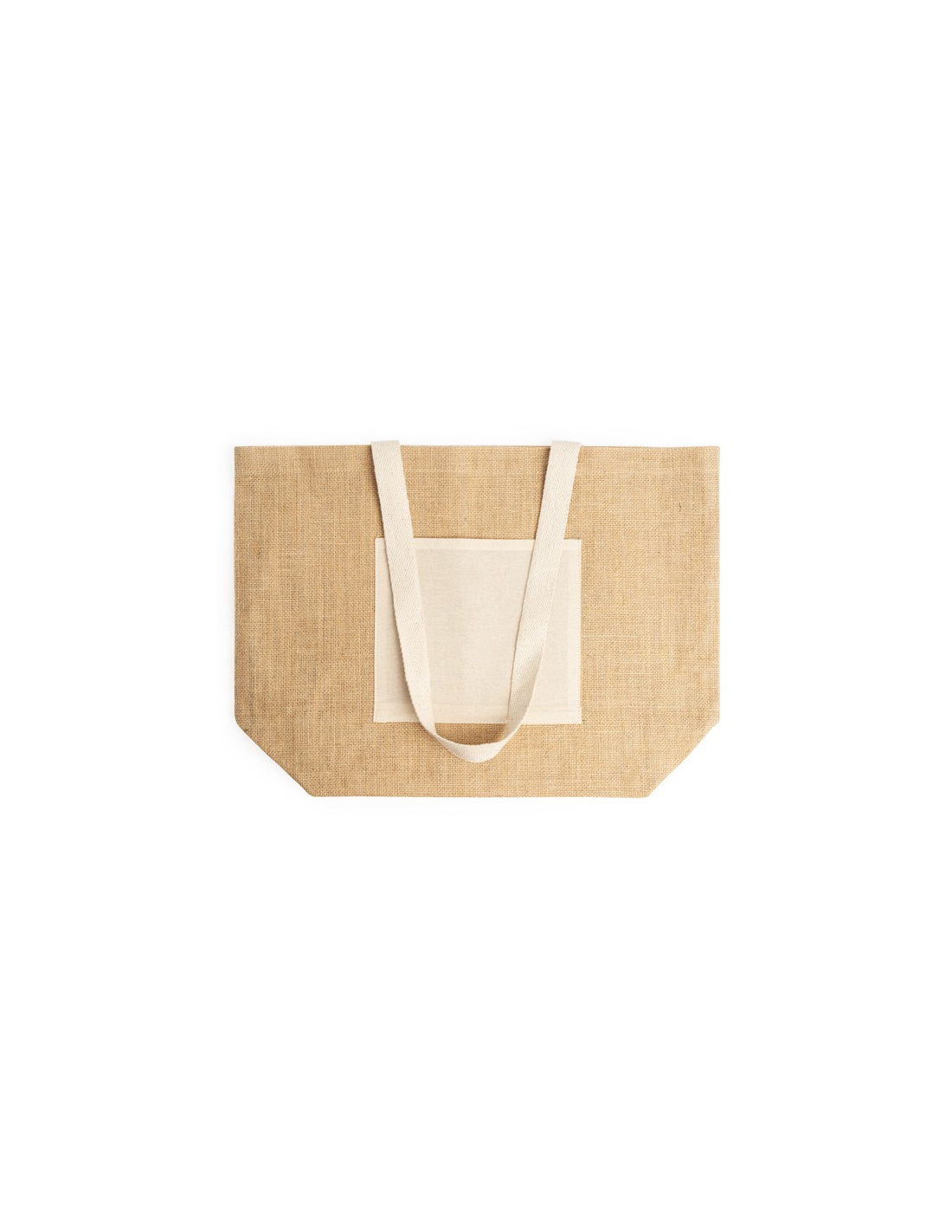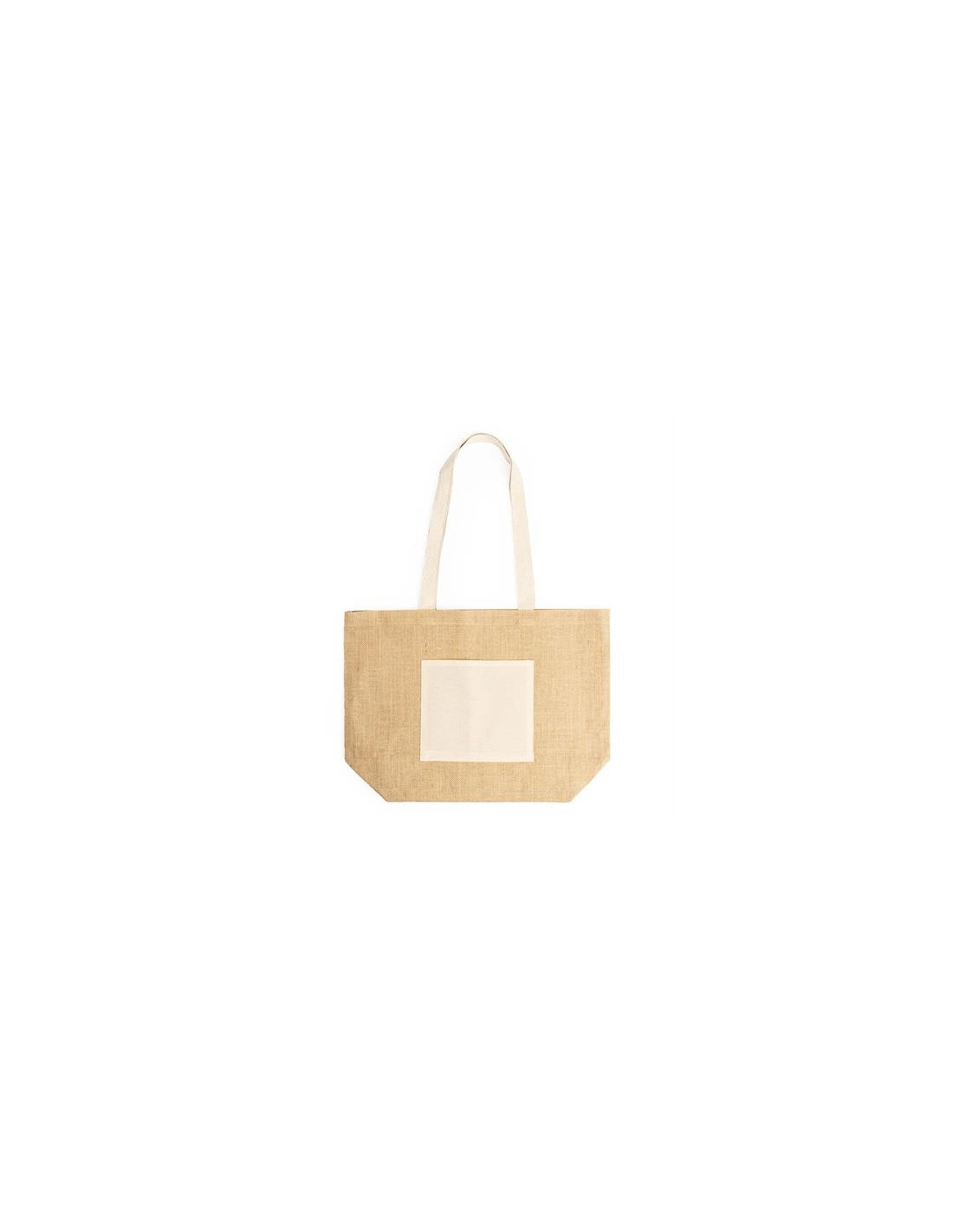 Bag in laminated jute with front pocket and long natural cotton handles.